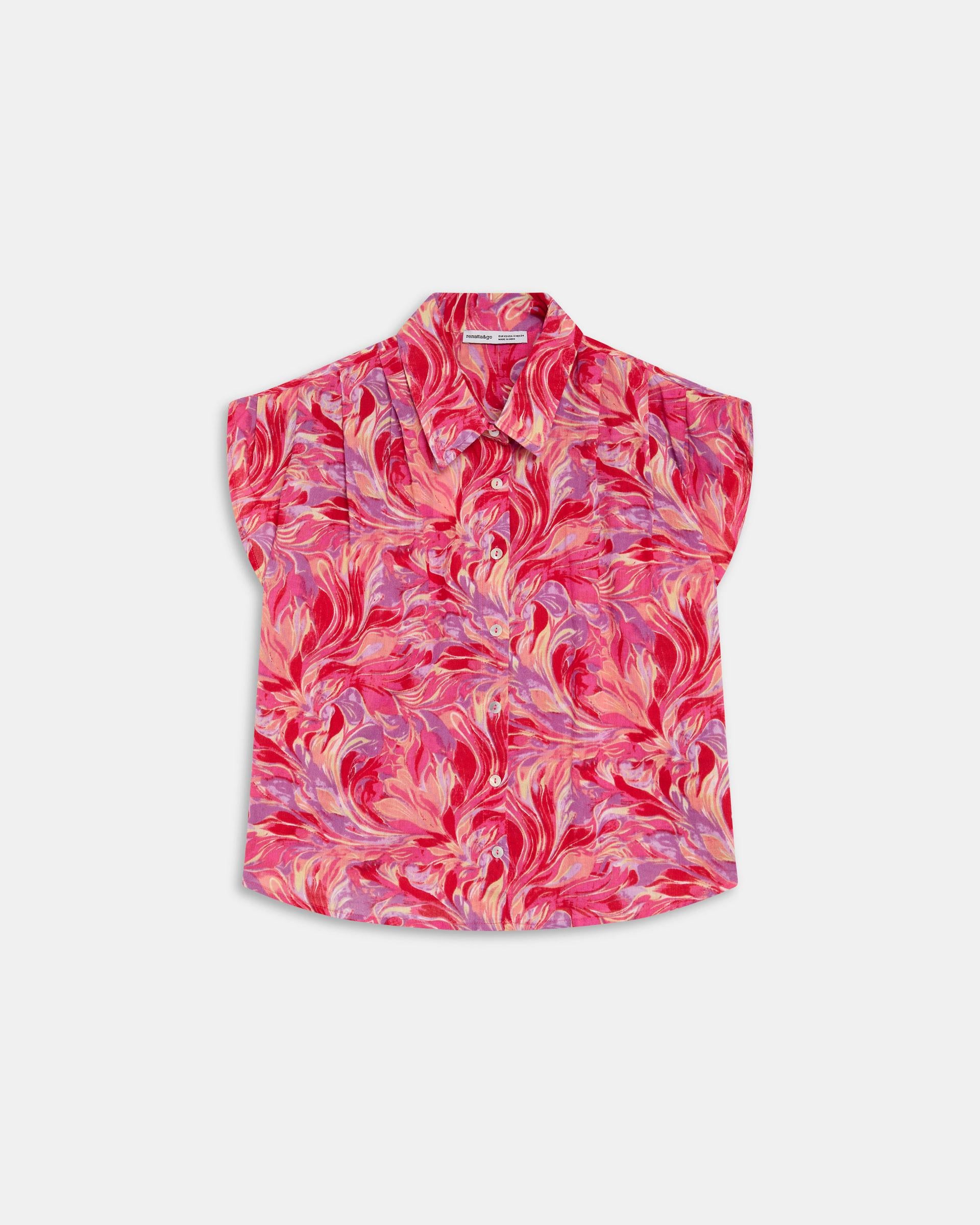 Camisa sem mangas com detalhe plissado no ombro e botões na frente, com estampado floral fúcsia.