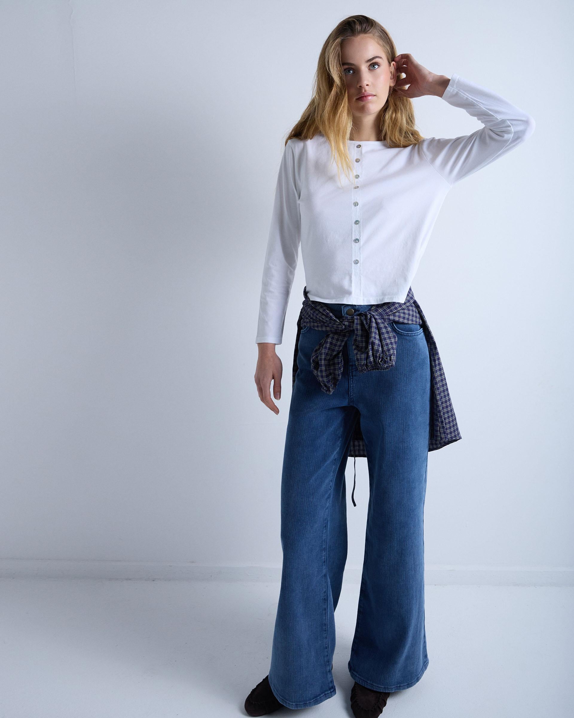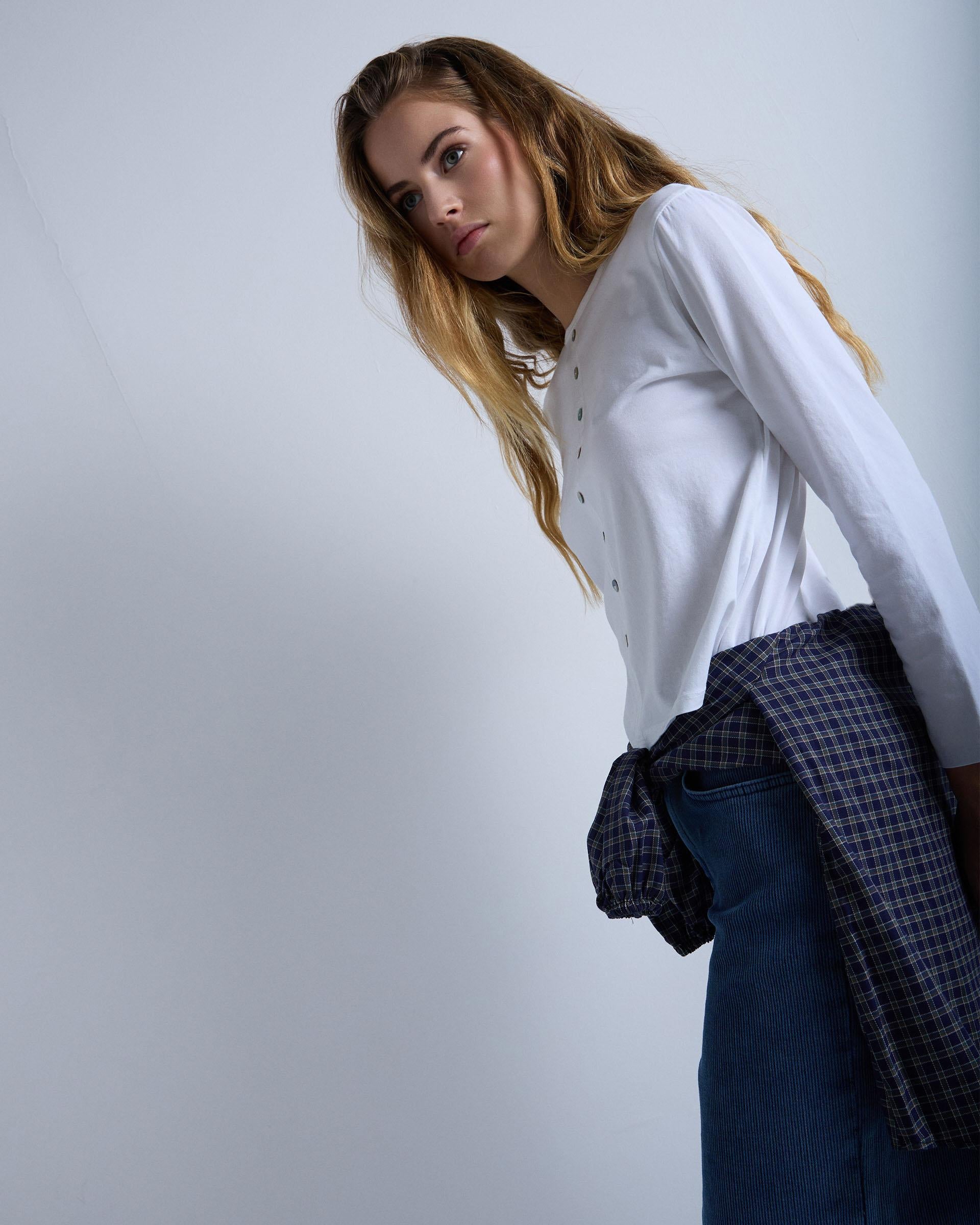 T-shirt branca de manga comprida com gola redonda e botões na frente.