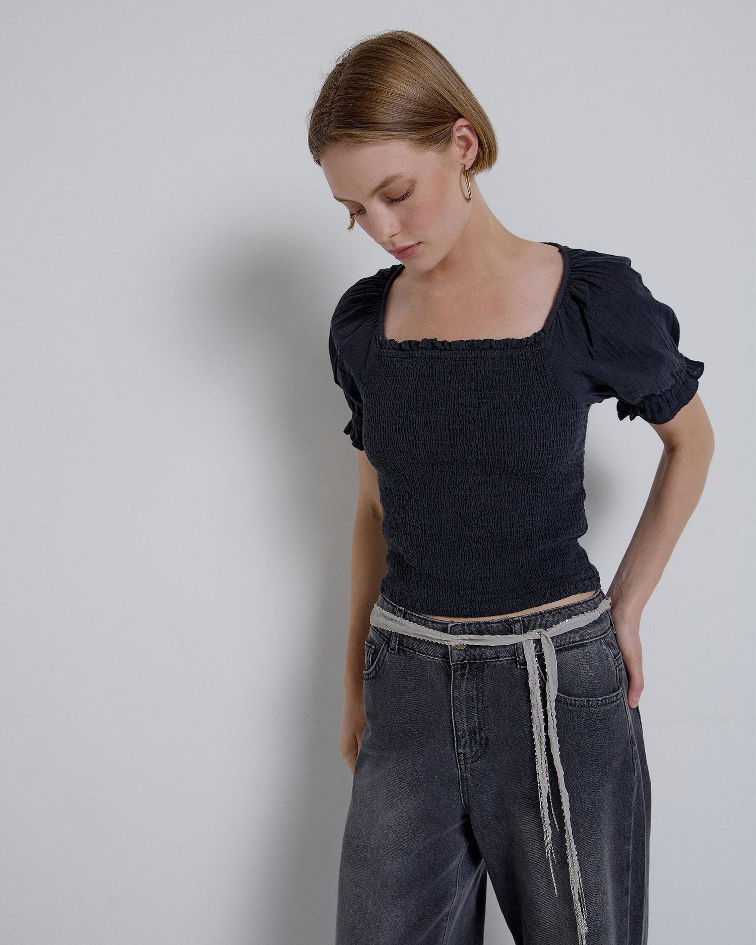 Blusa castanha com decote quadrado e renda