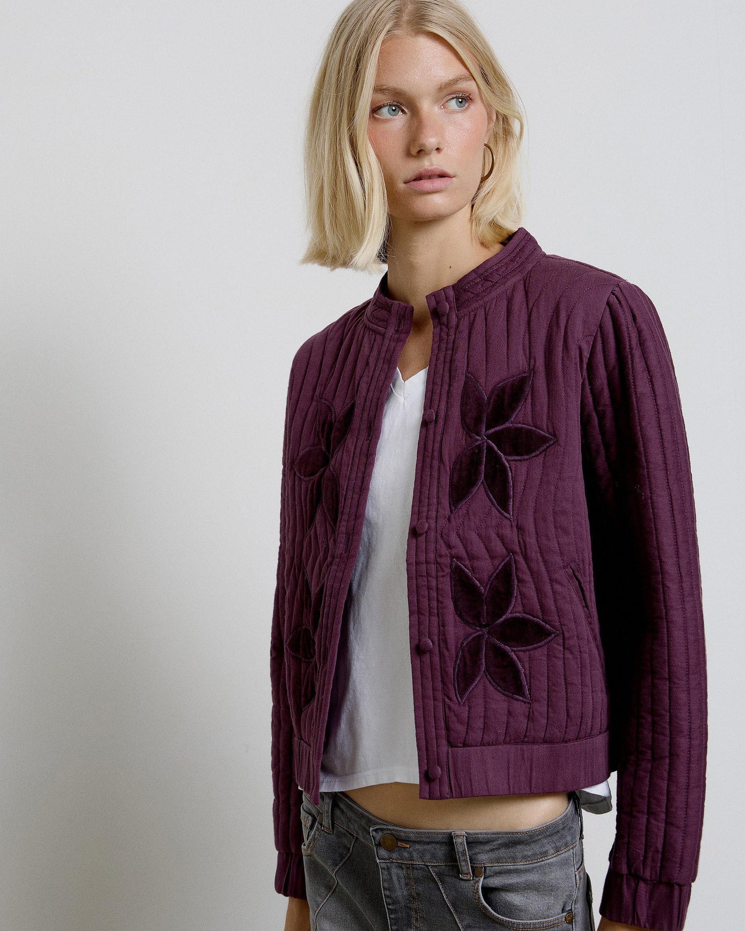• Casaco roxo de abotoamento duplo com fecho de cordões.