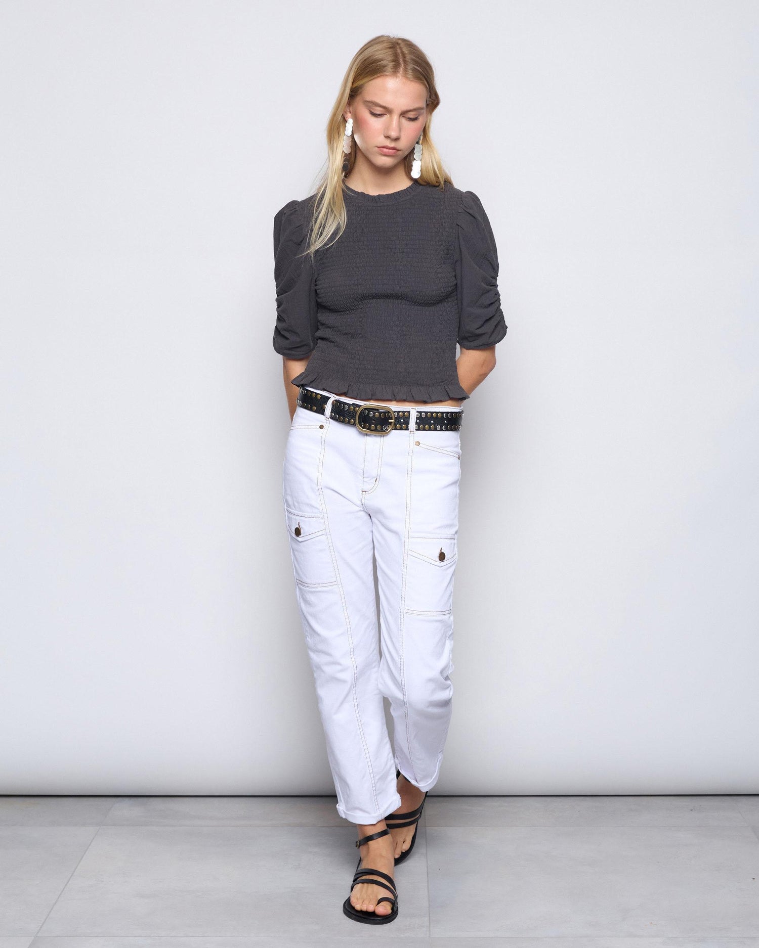 • Calças de ganga com passadores de cinto e botões, antracite.
