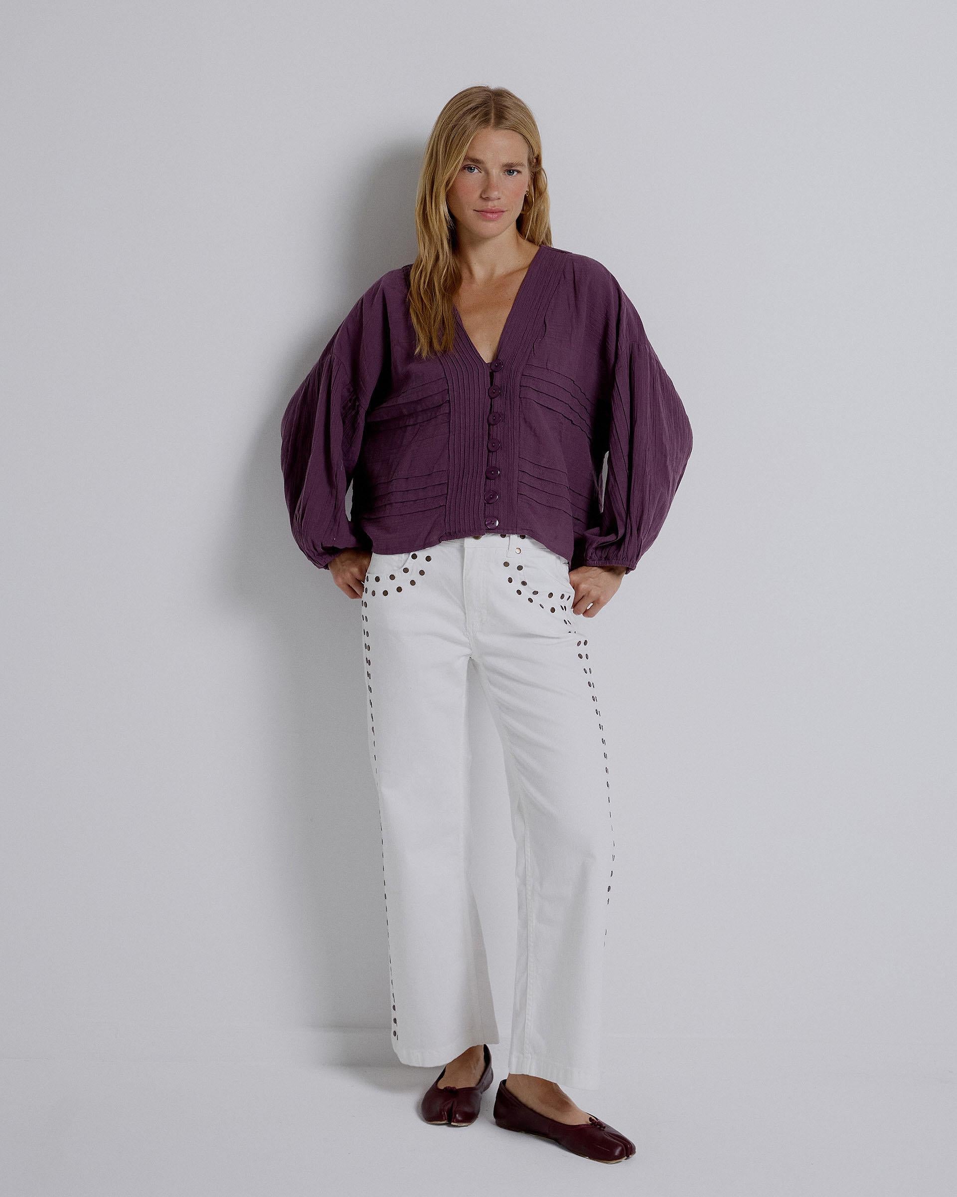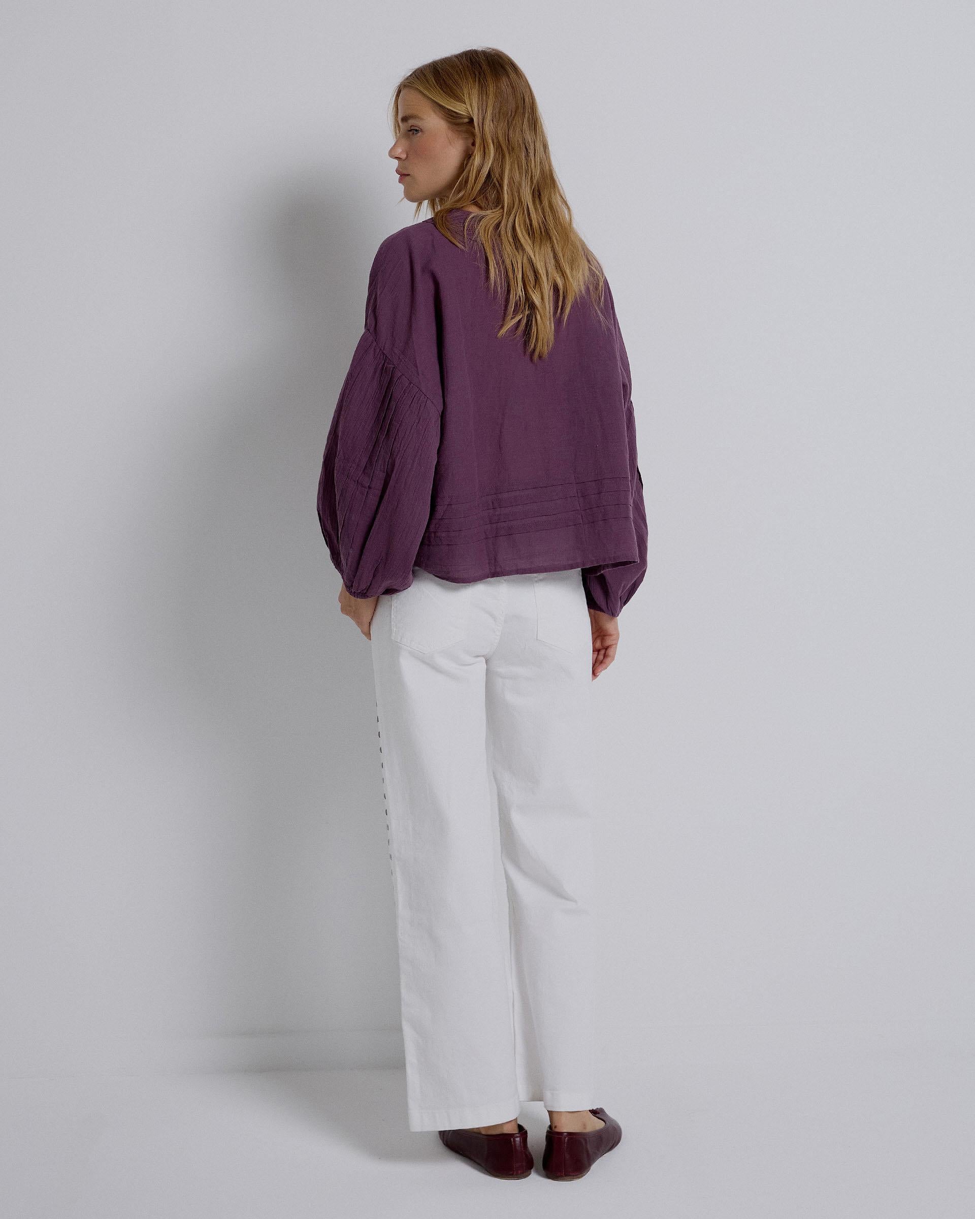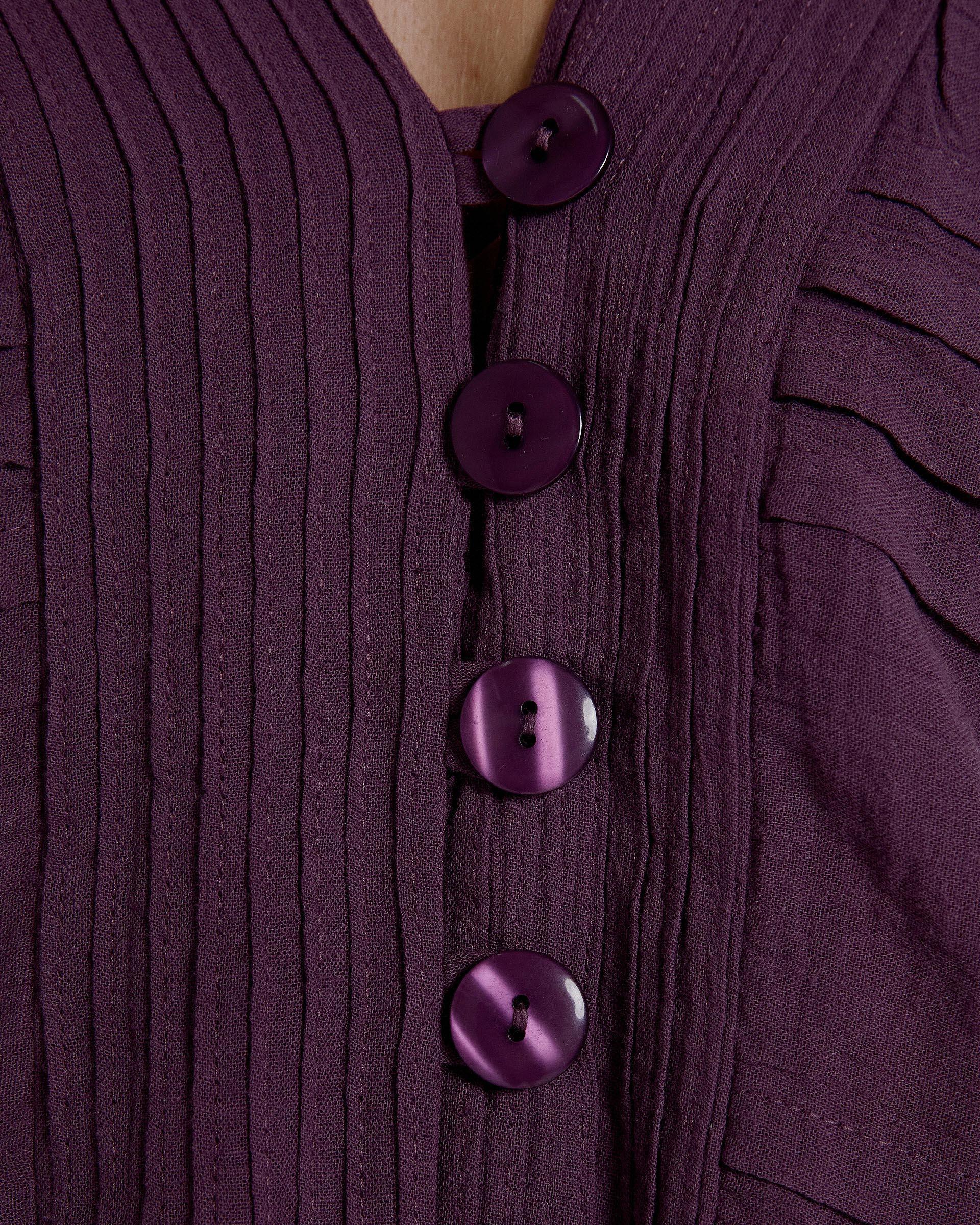 Blusa de manga comprida com pregas e botões na frente, decote em V e na cor roxa.
