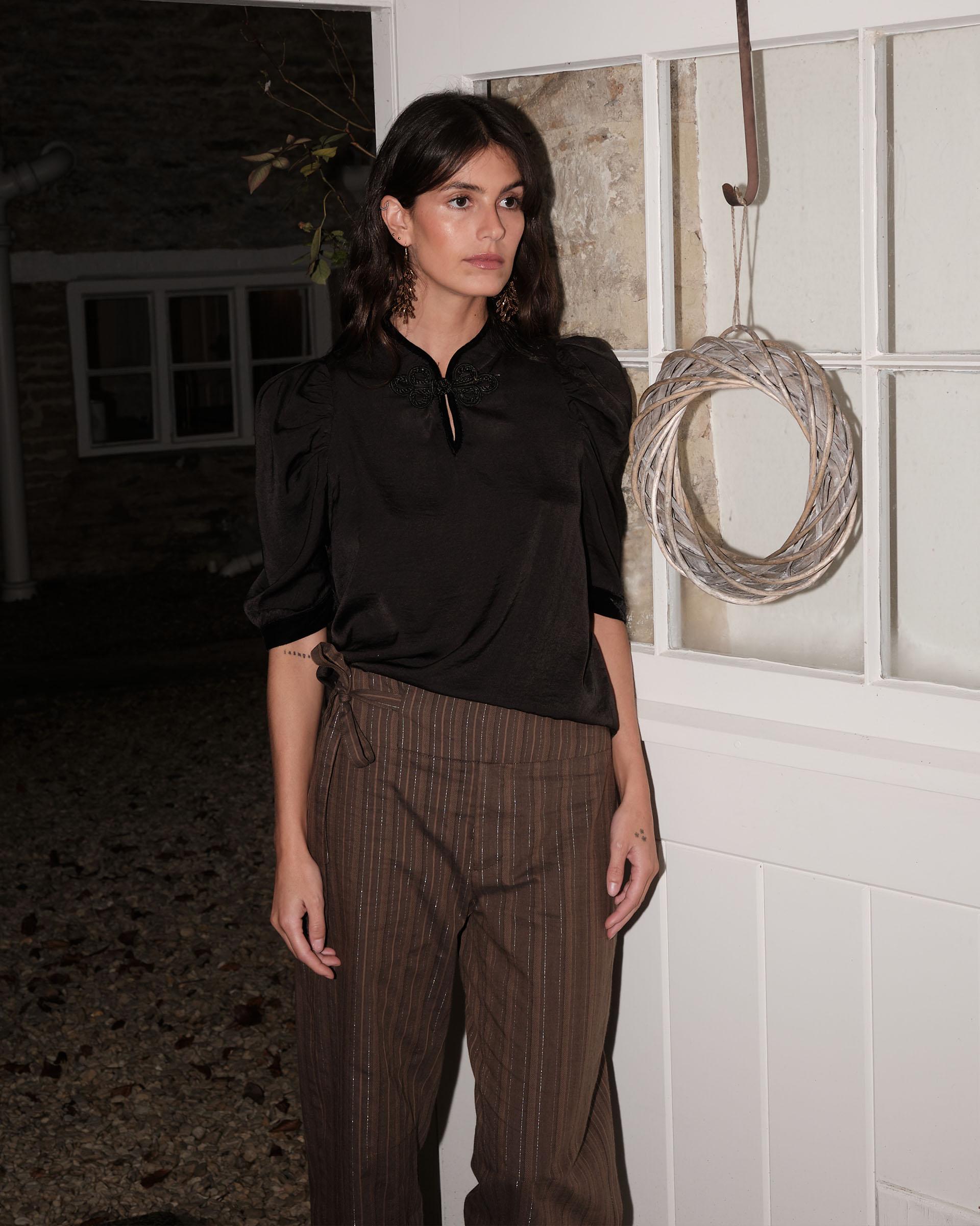 Blusa de manga curta em estilo japonês, preta com detalhes em veludo.