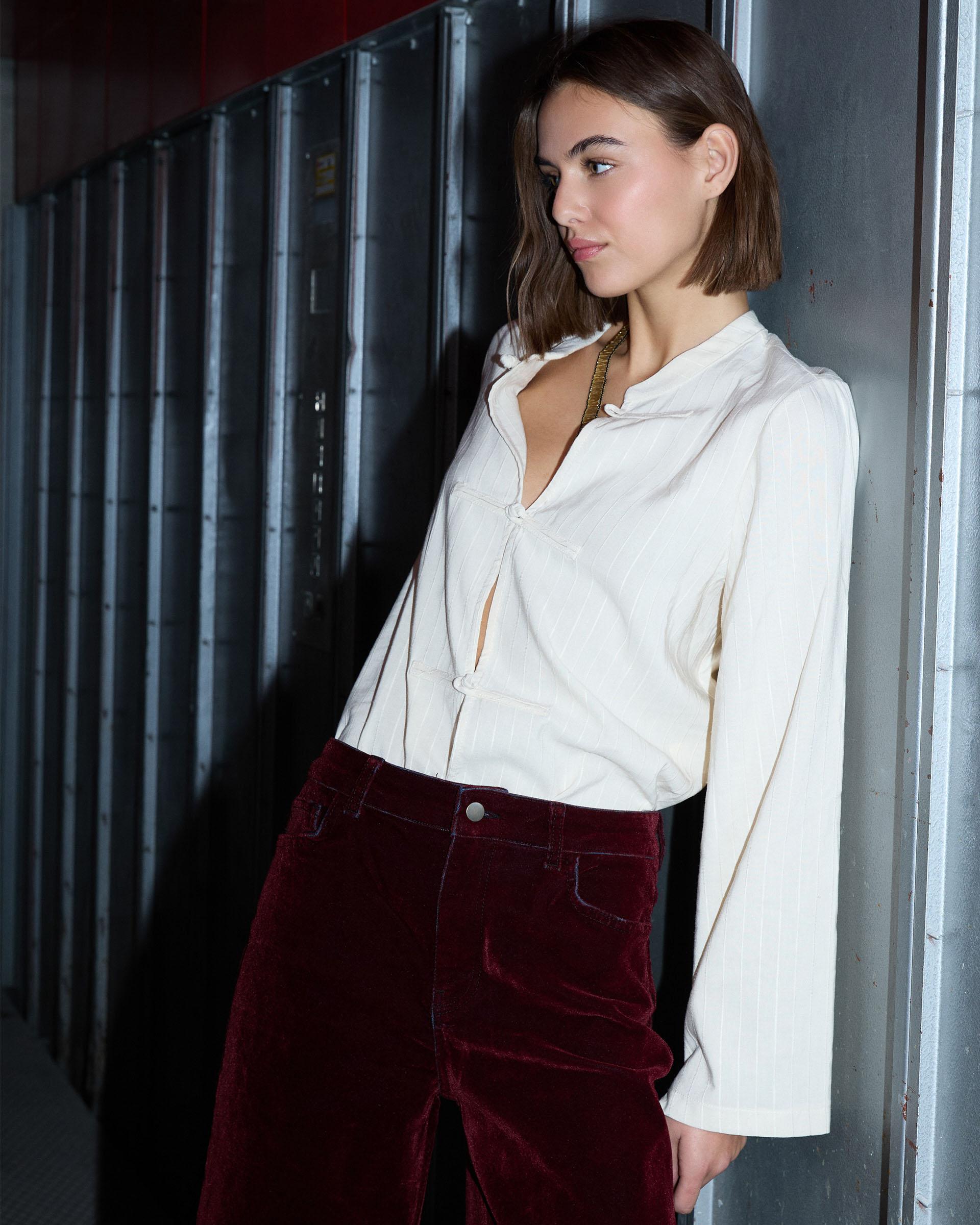Blusa texturizada de cor crua com fecho estilo japonês.