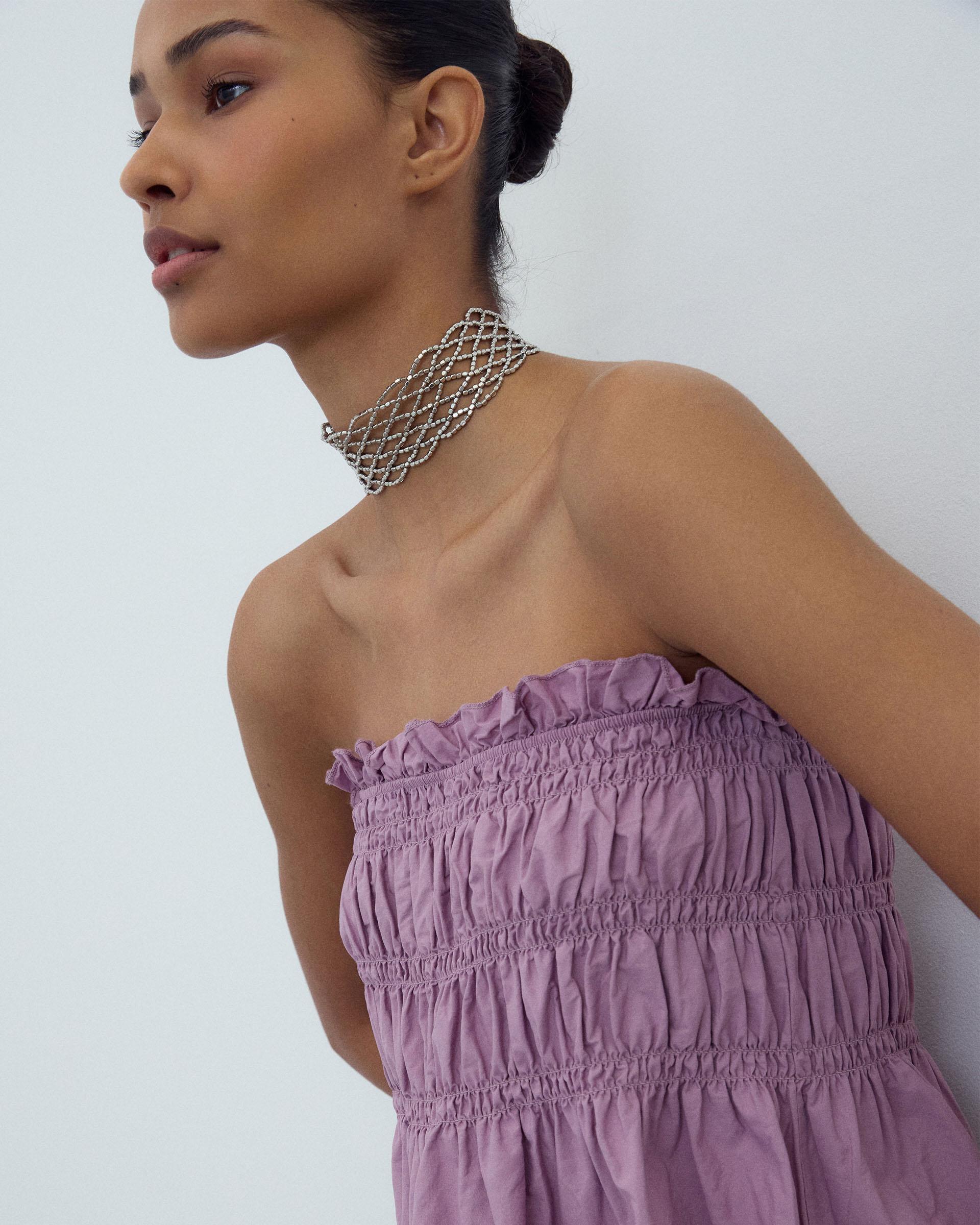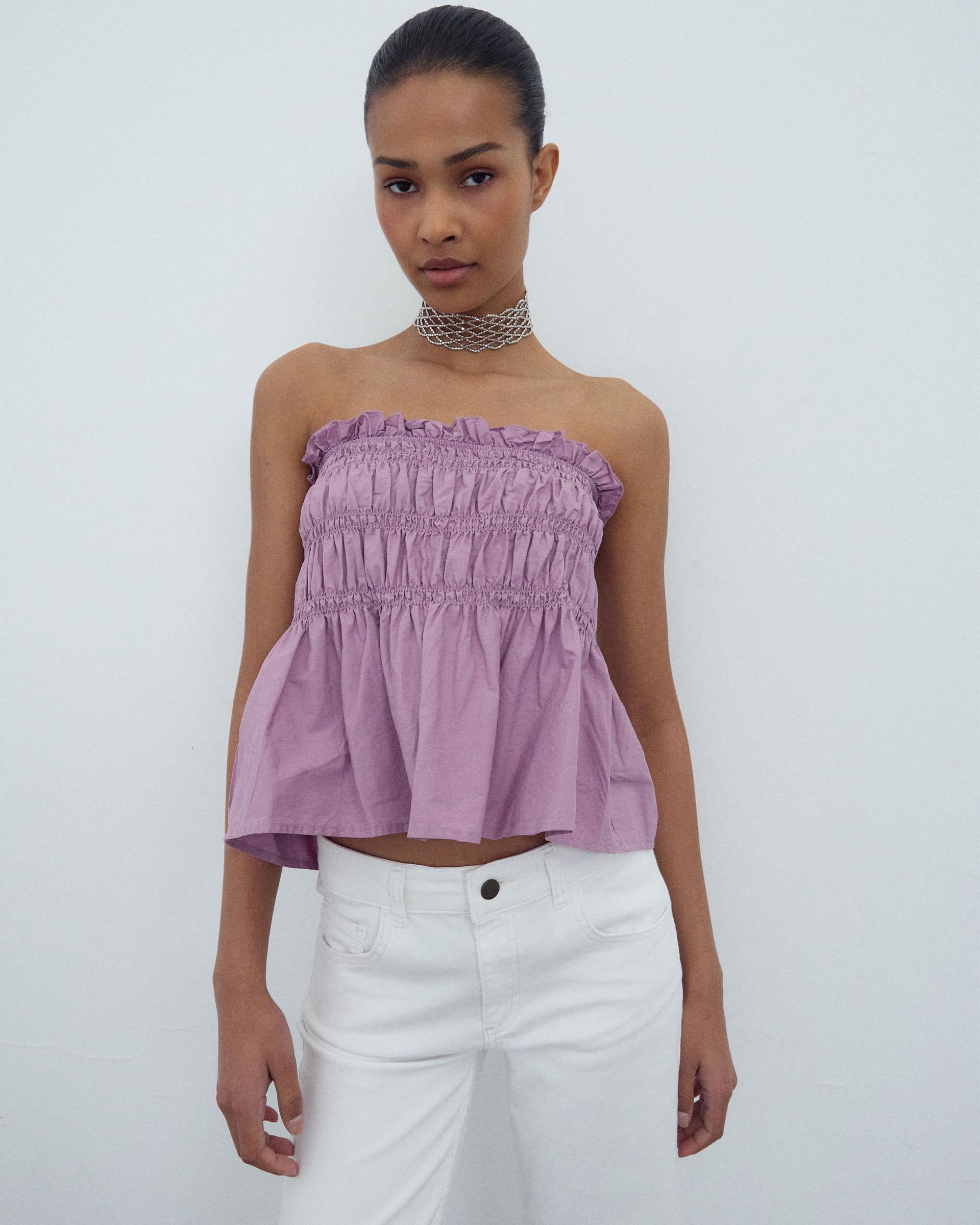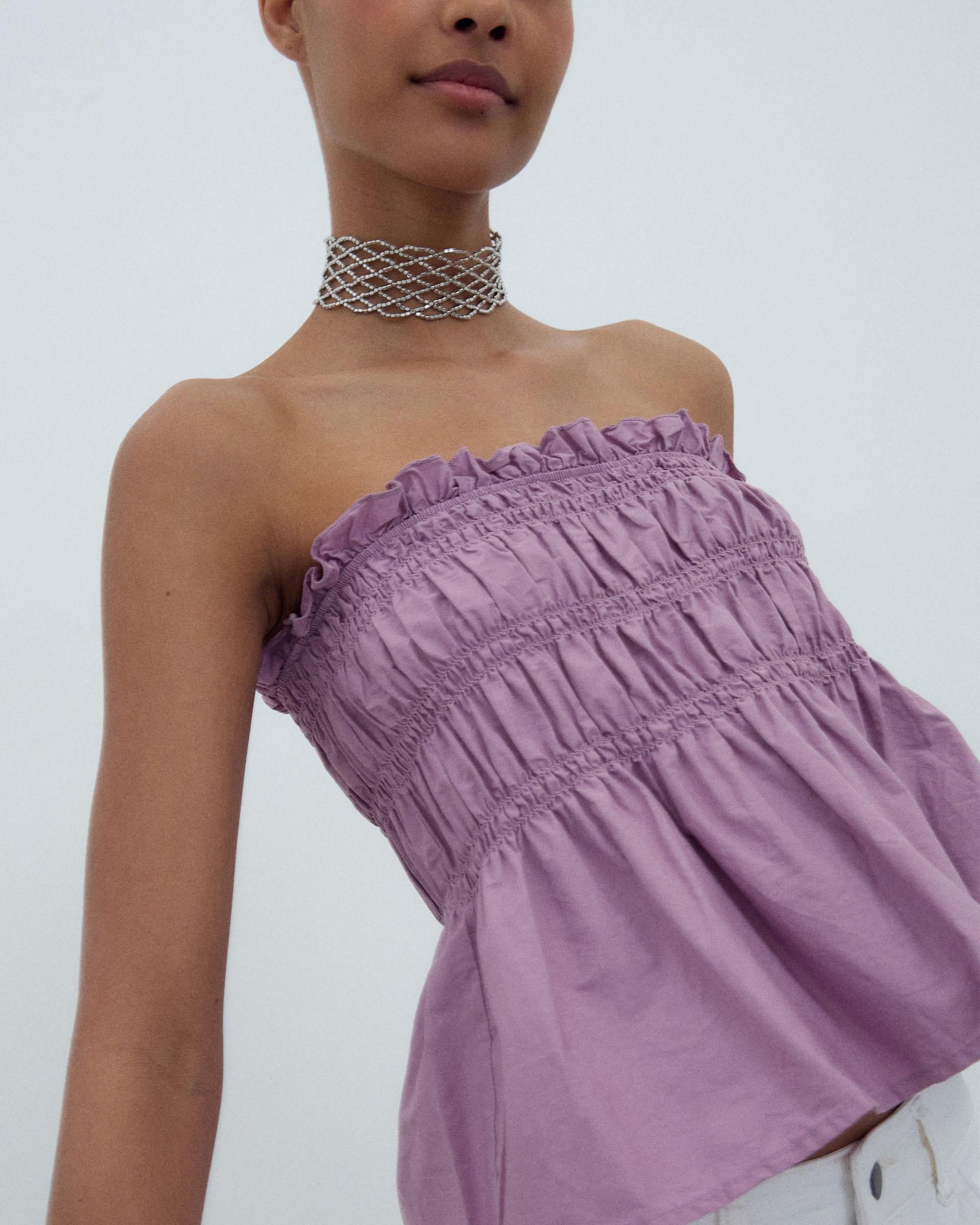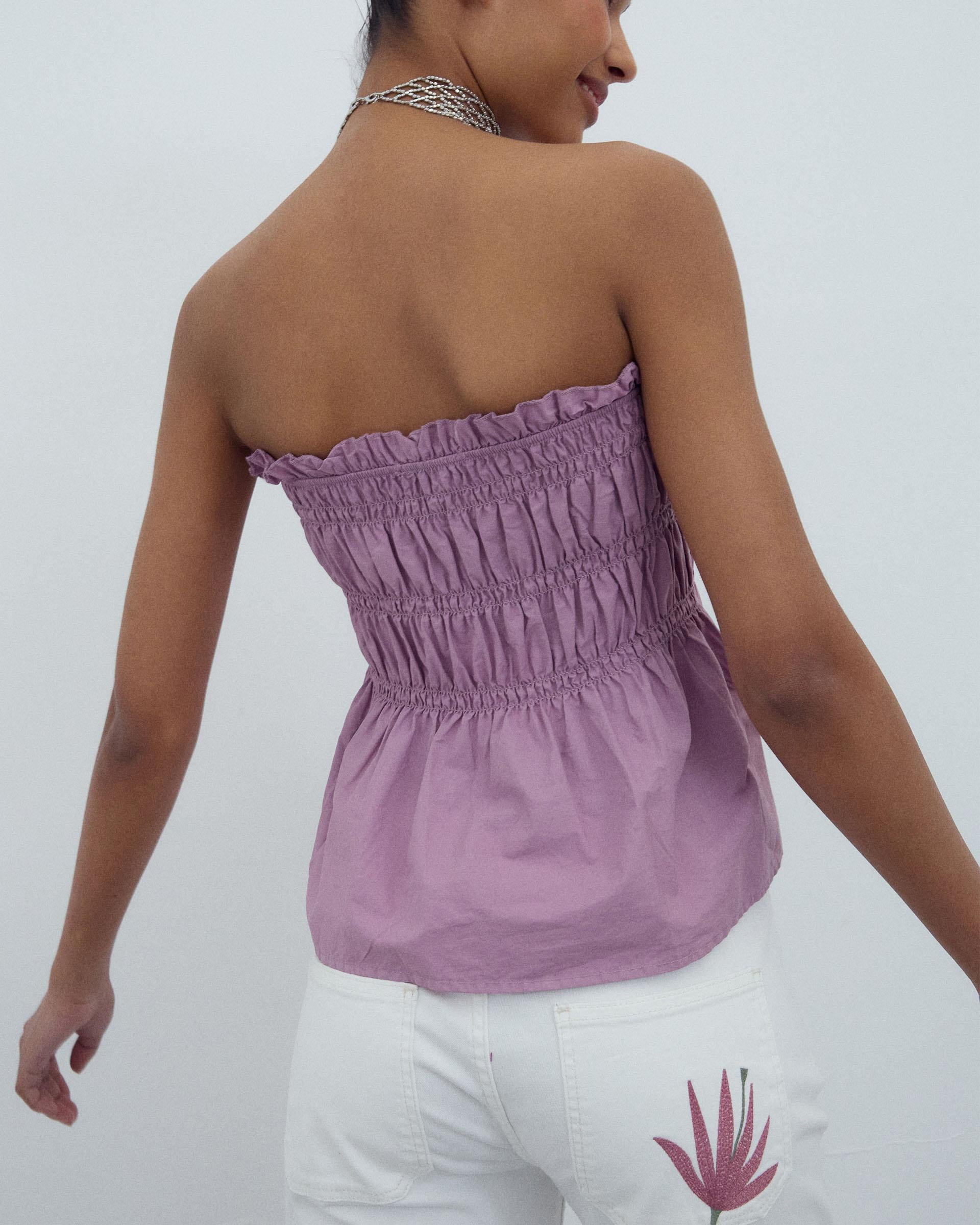 Top sem alças em cor lilás com detalhe de elásticos.