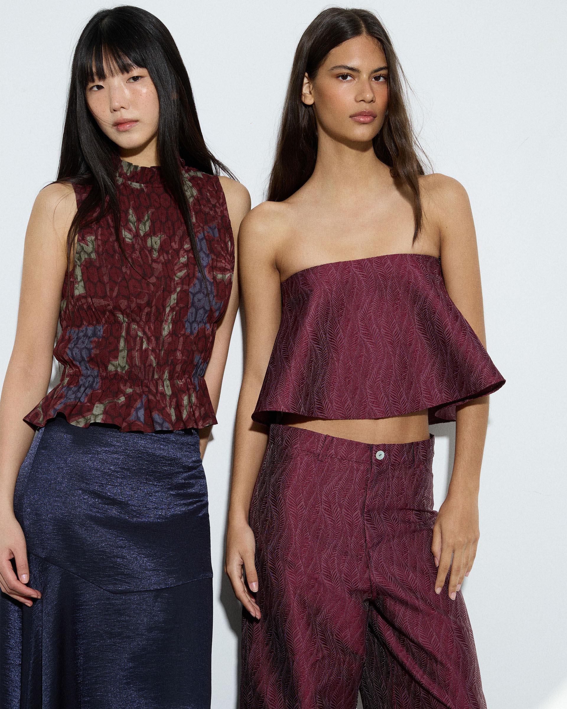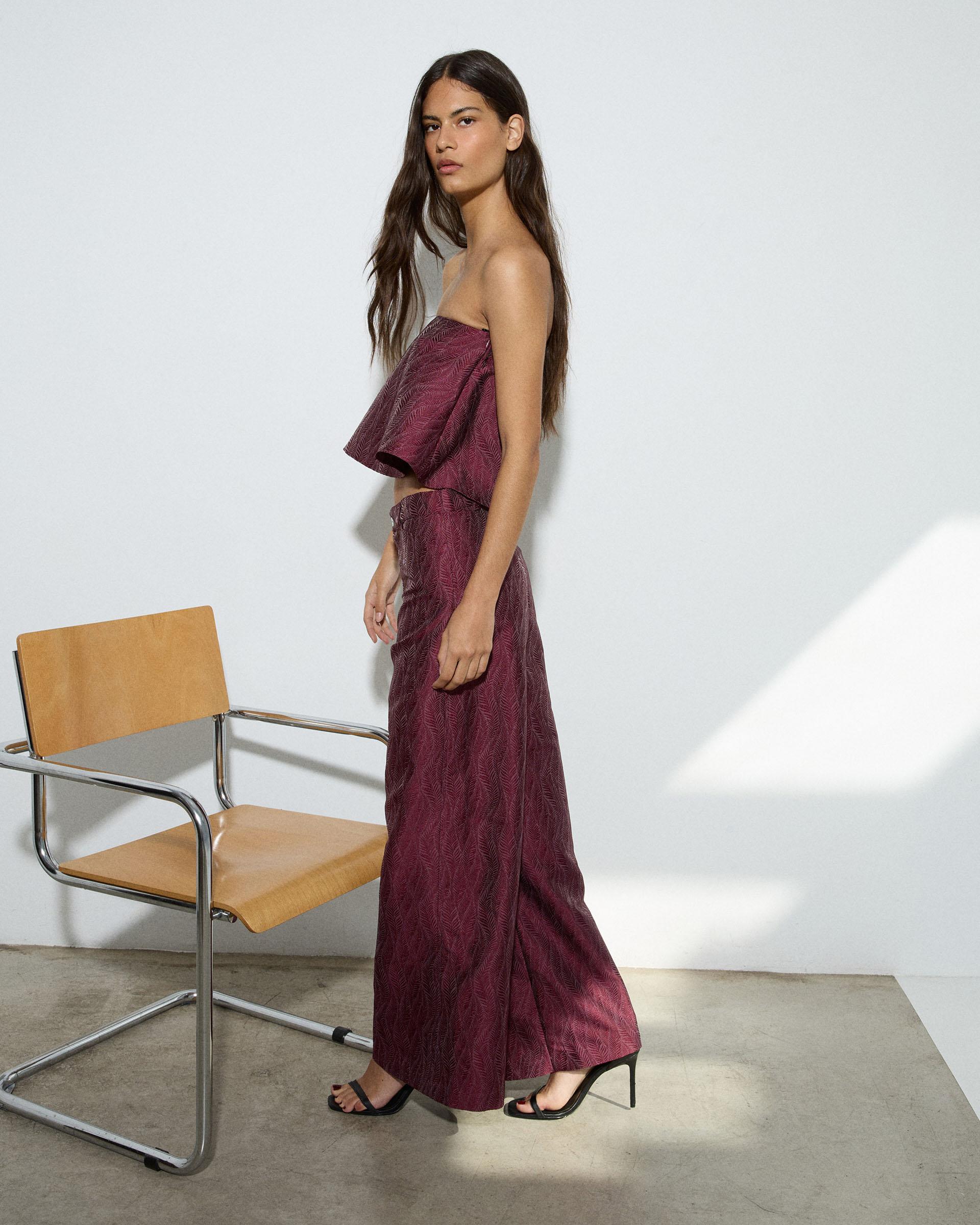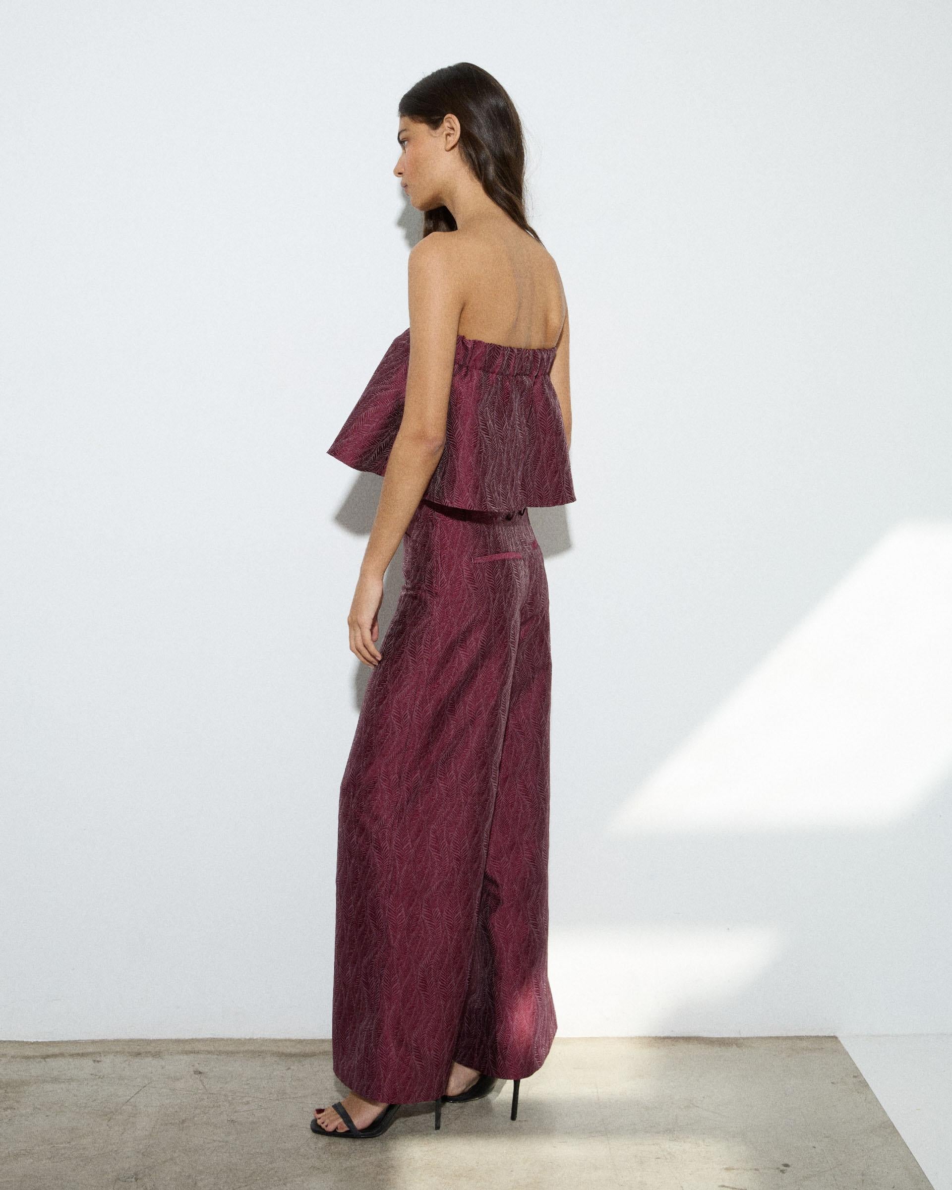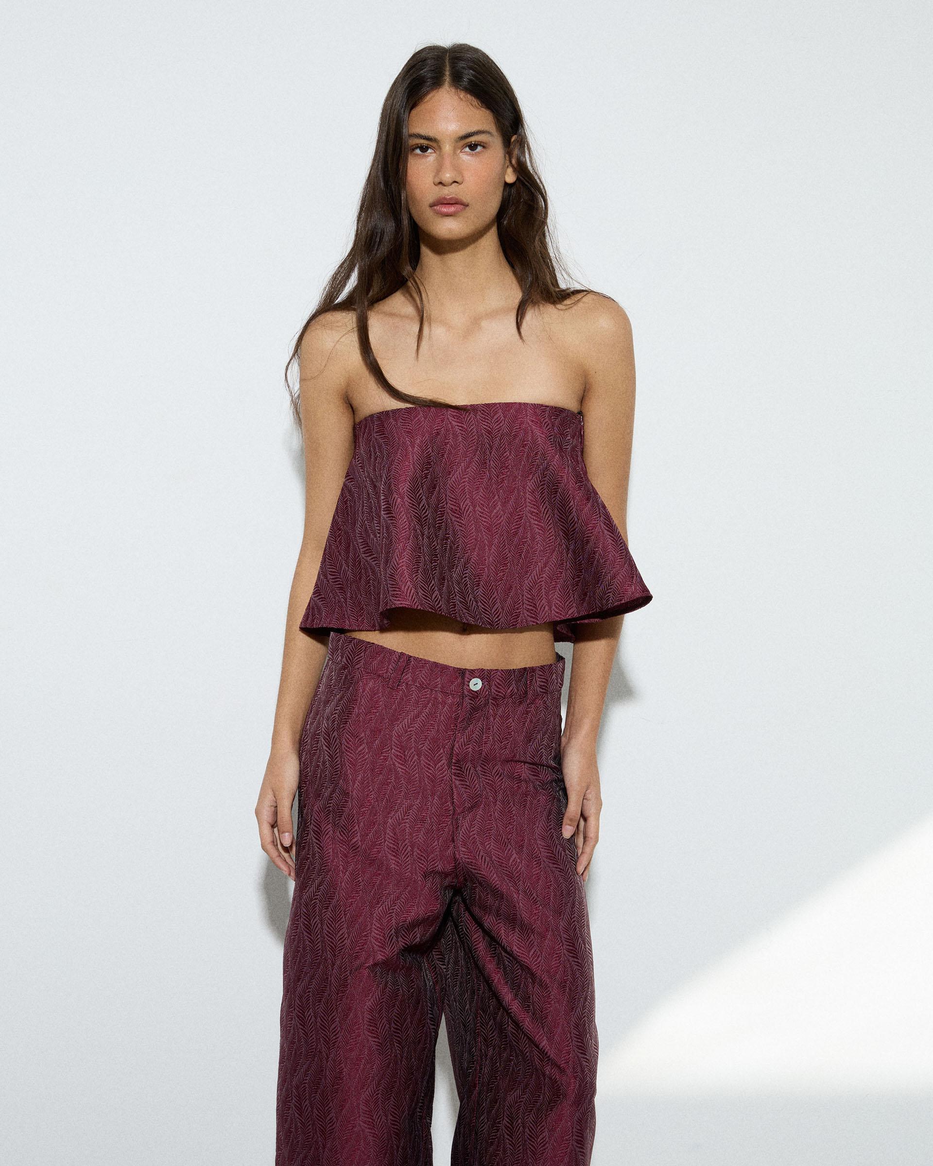 Top cai-cai com folho, elástico nas costas e fecho de correr lateral, de cor grená.