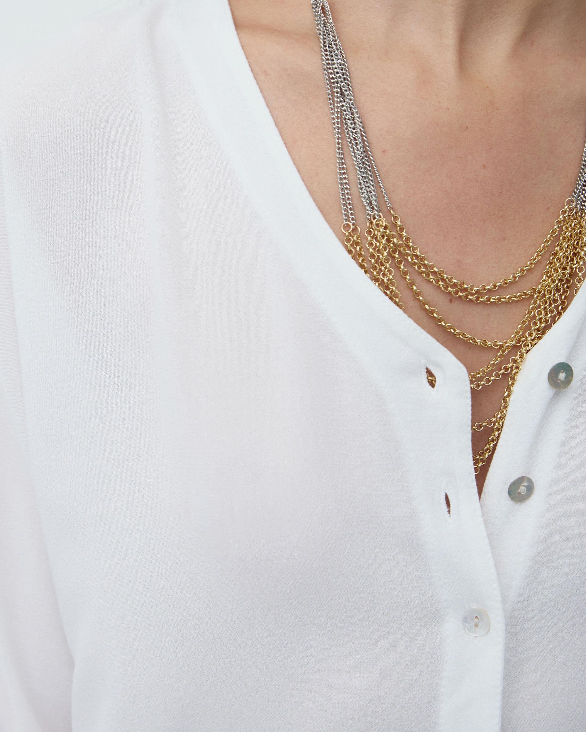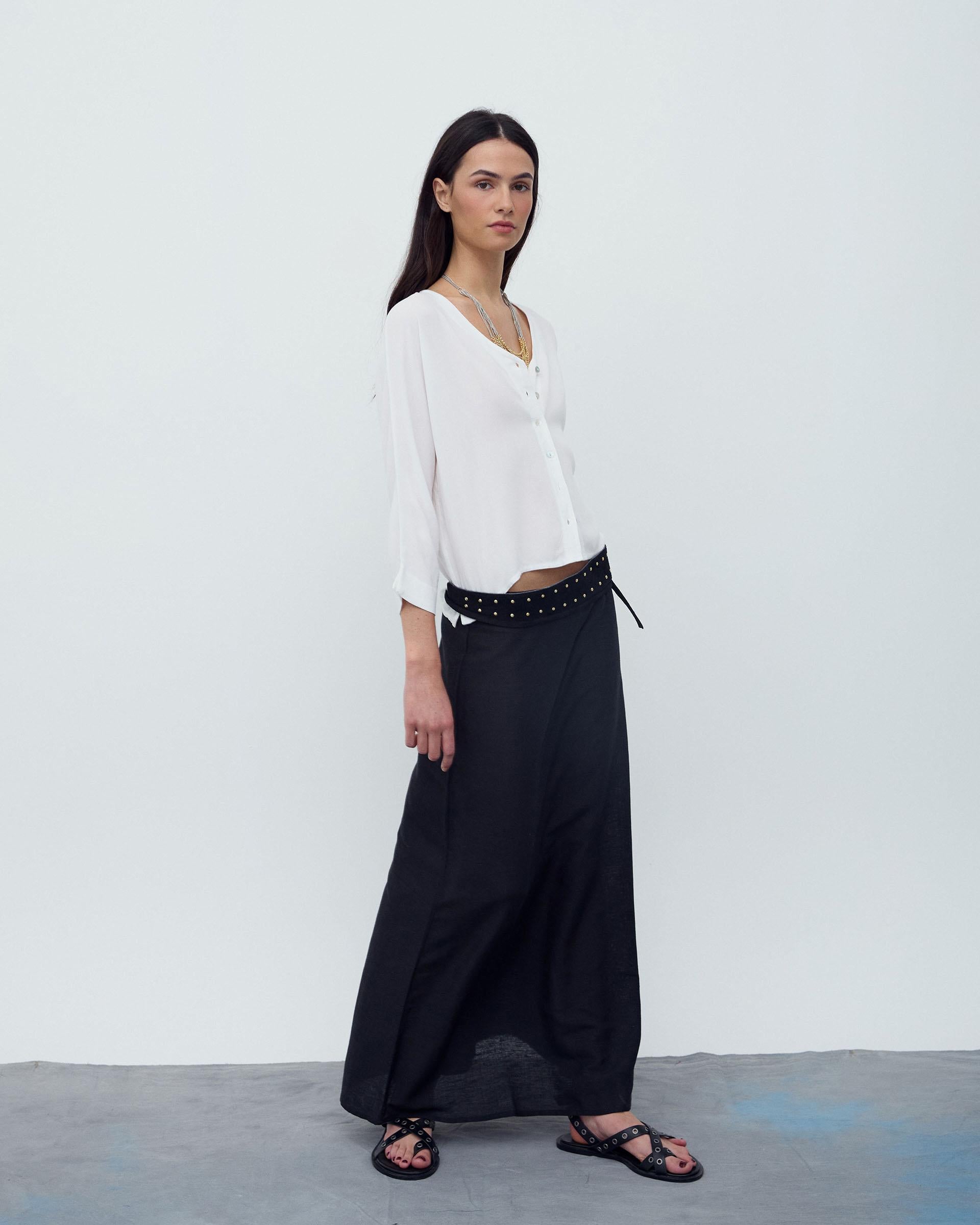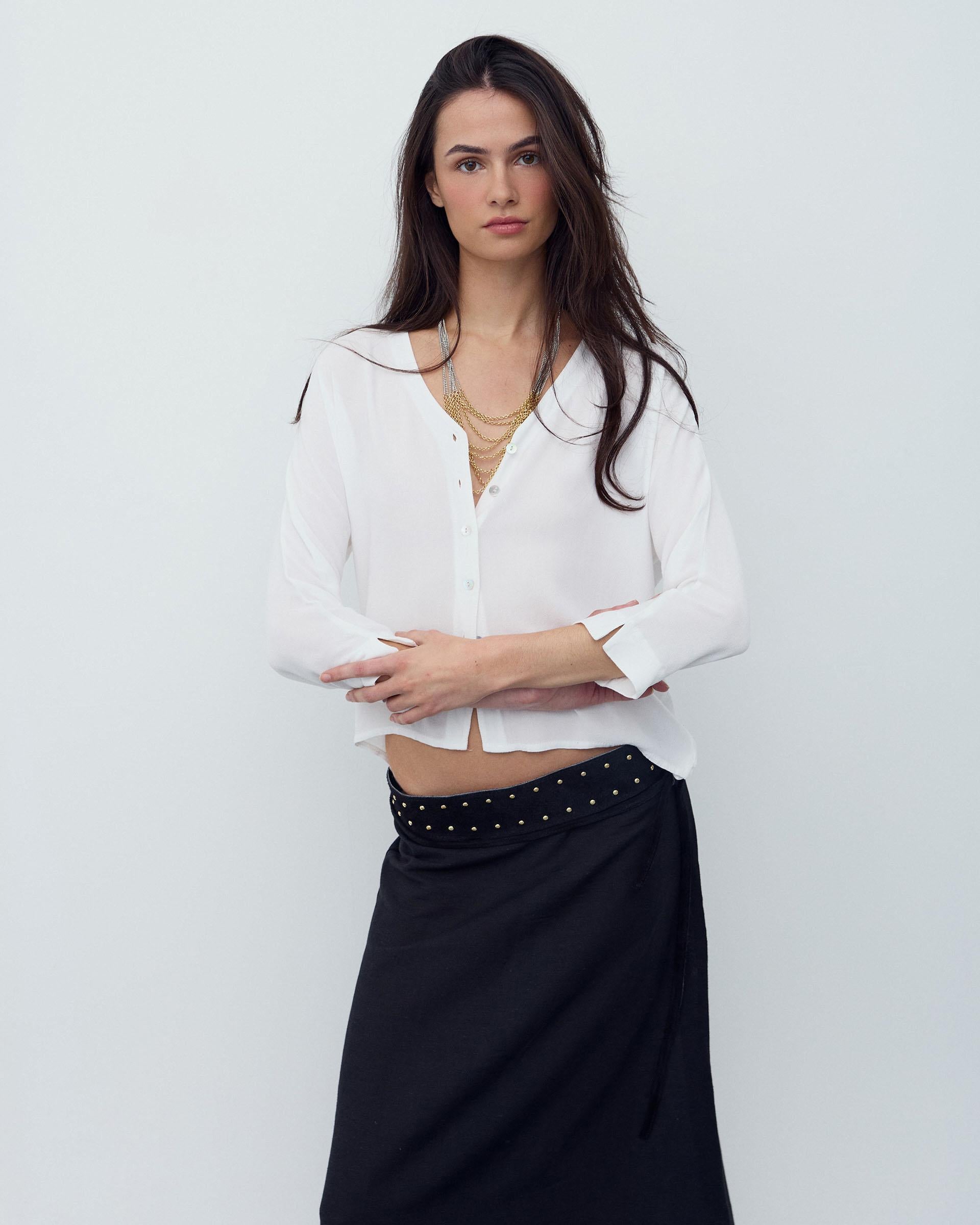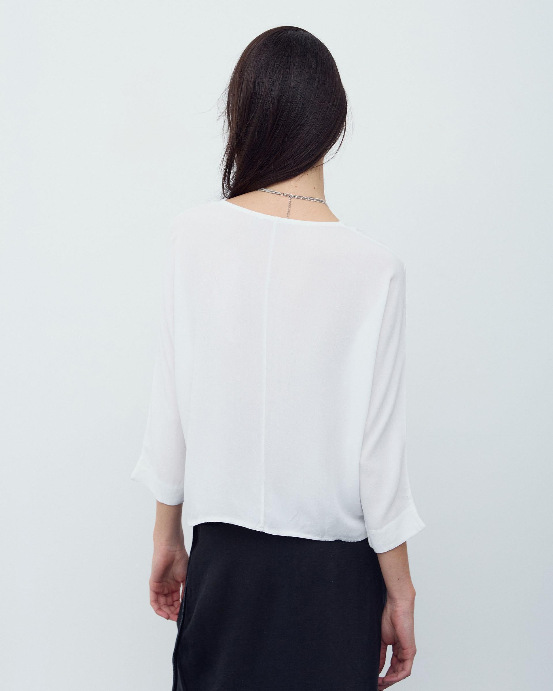 Blusa branca básica feminina, com decote em V, aberta com botões de madrepérola e manga francesa.
