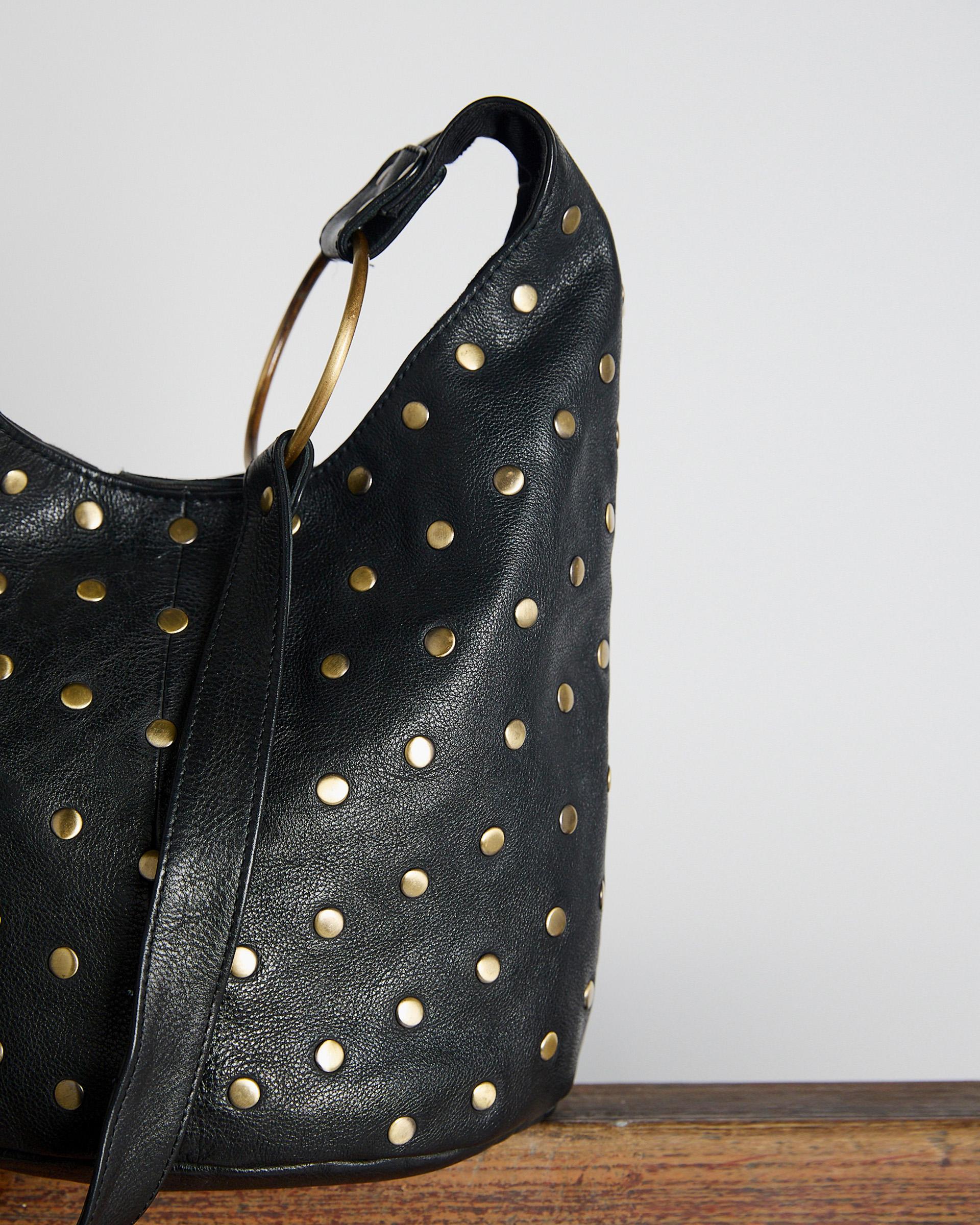 Bolsa tipo balde em pele preta com detalhes em tachas, alça ajustável e ilhós assimétricos.