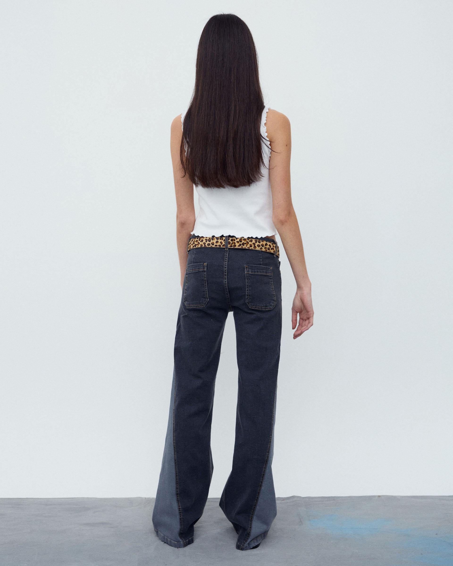 Calça de ganga comprida à boca de sino com detalhes laterais e fecho de correr e botão, em preto com contraste cinza.