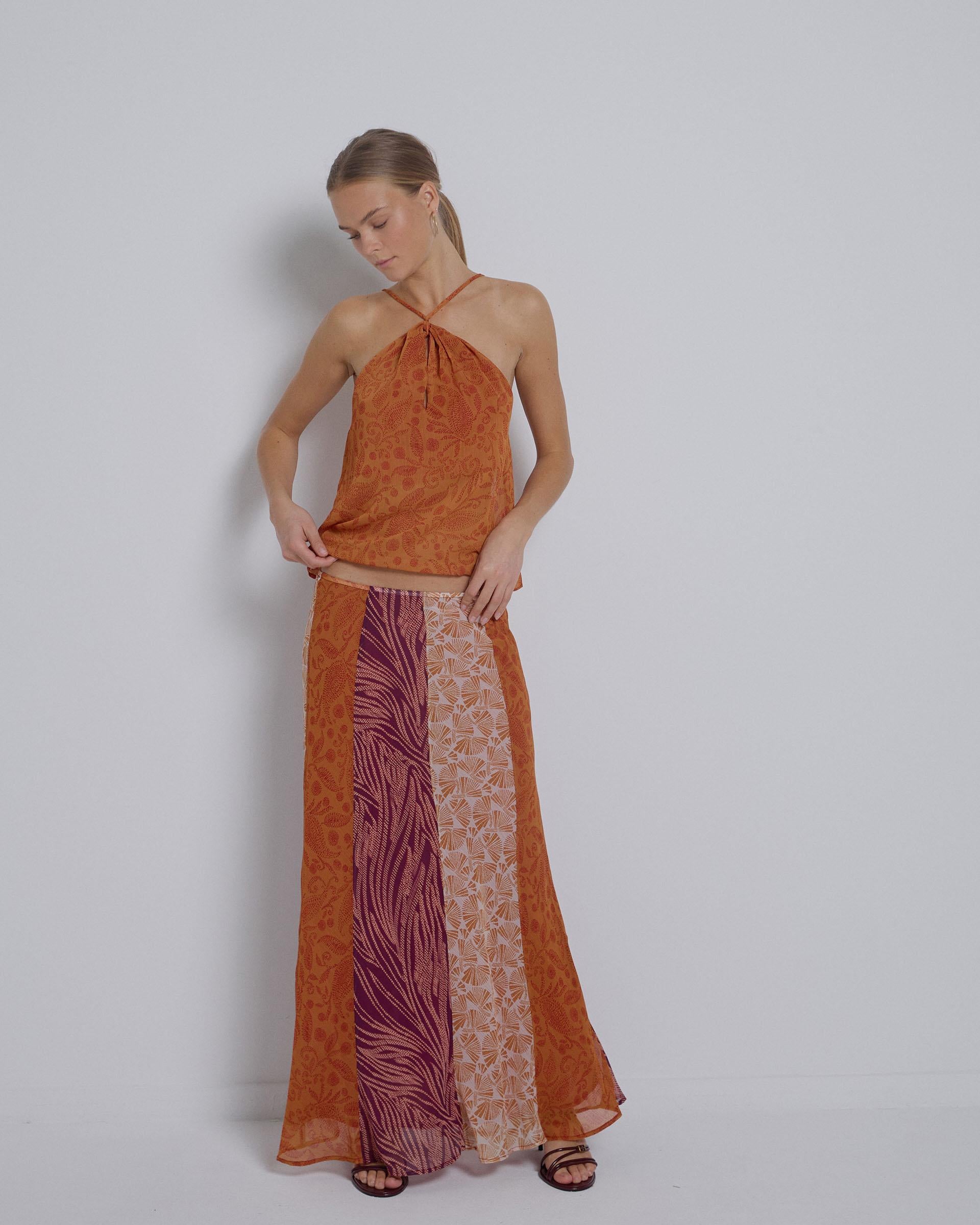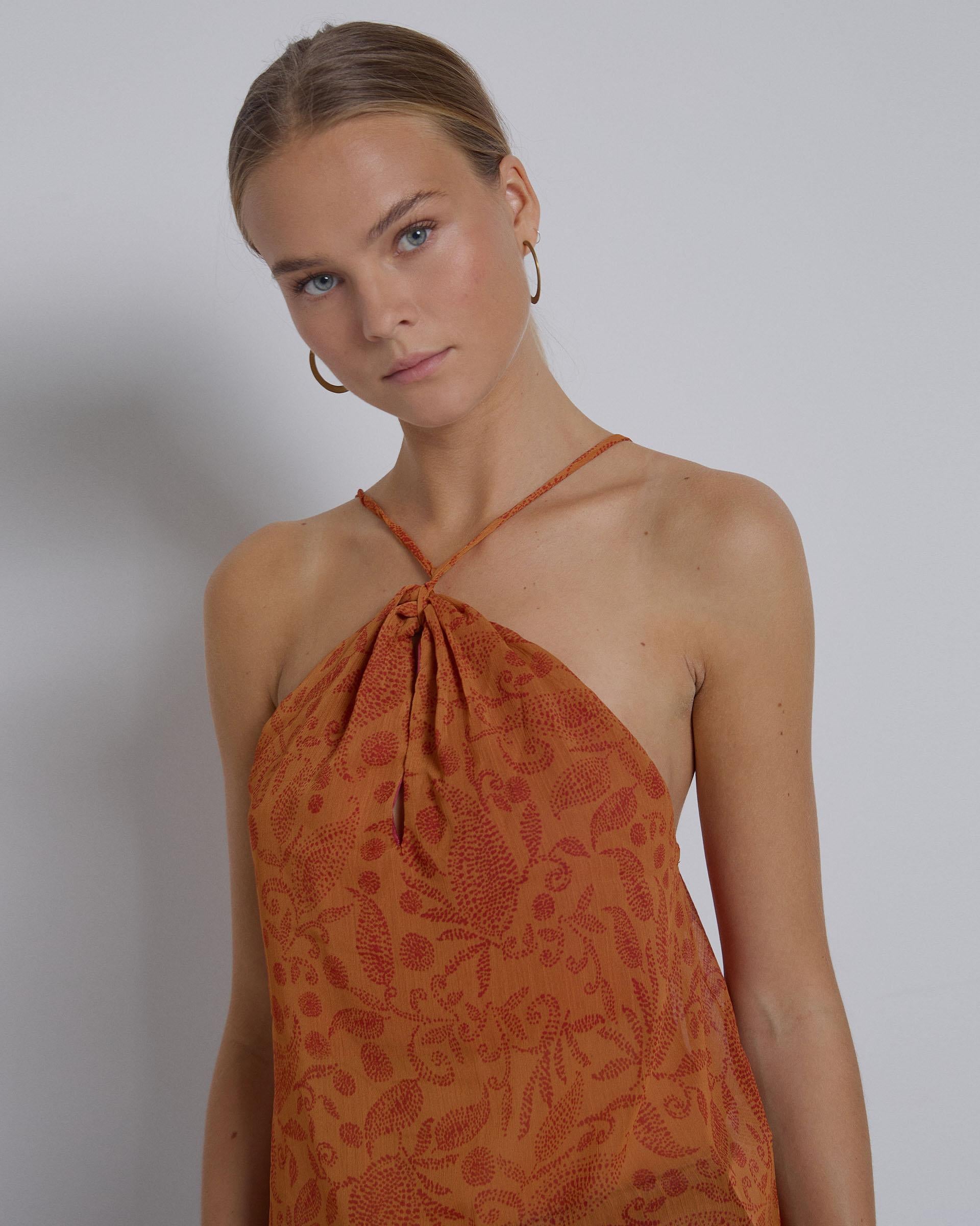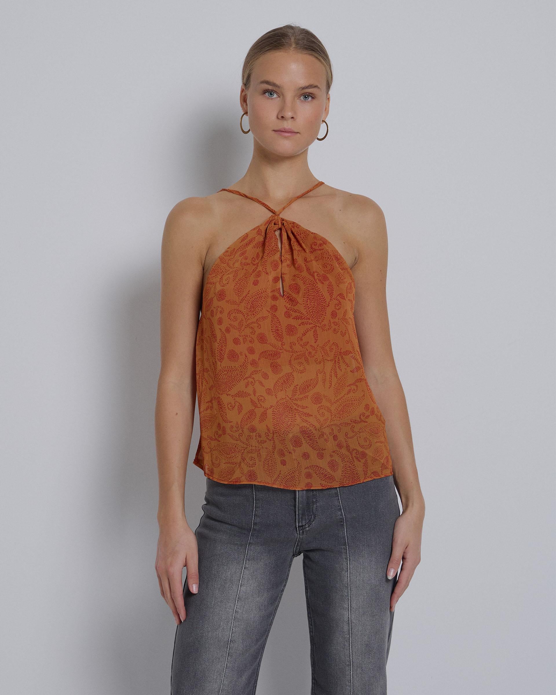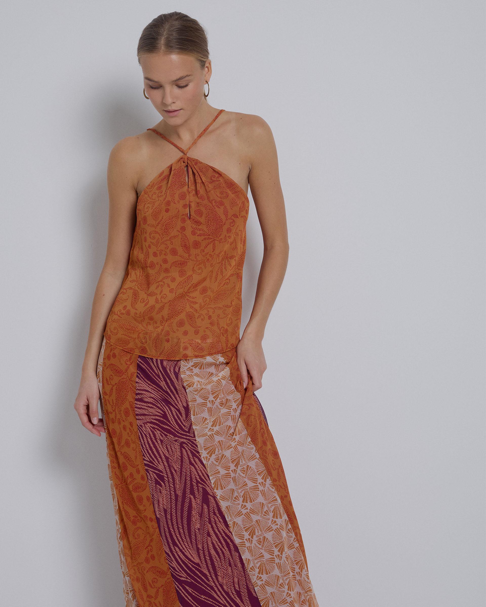 Blusa laranja com decote halter e decote frontal em formato de lágrima.