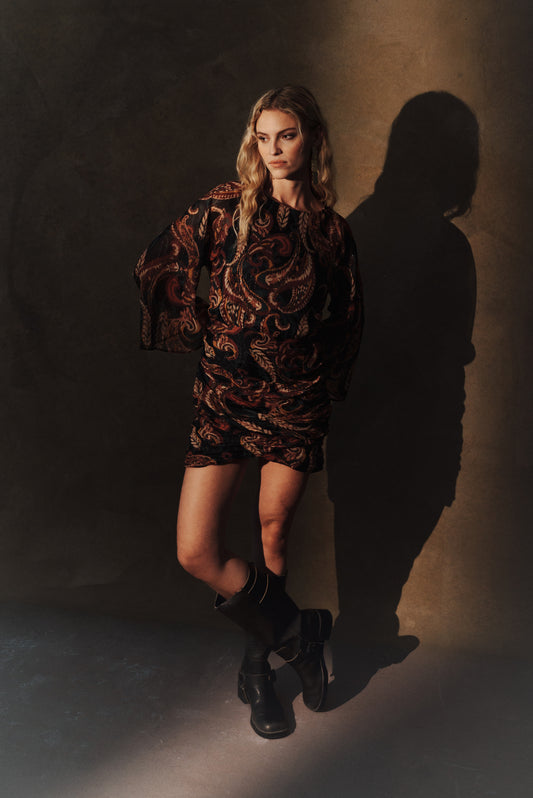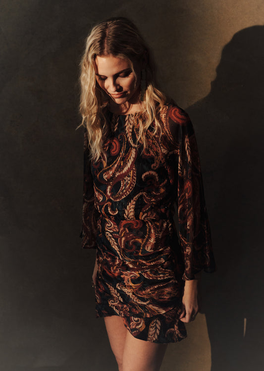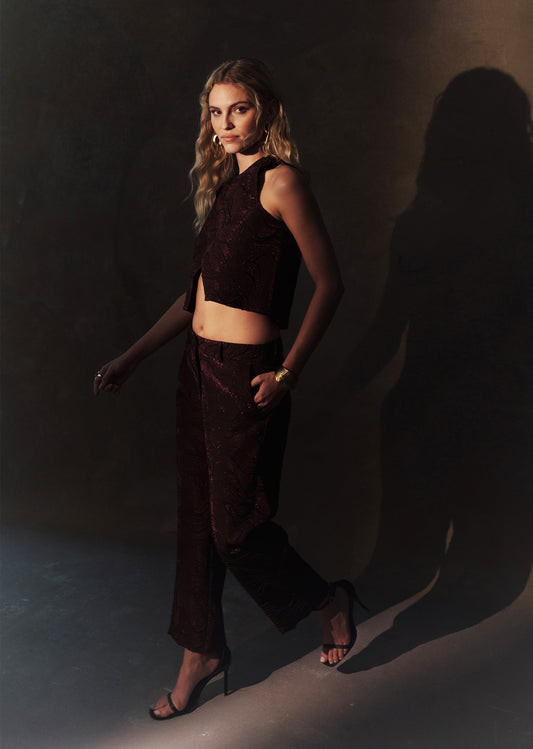 A ÚLTIMA COLEÇÃO DE FESTA DESlumbra com uma mistura única de tecidos especiais e textura intrincada que oferece profundidade e calor em tons ricos de terracota e laranja queimado.