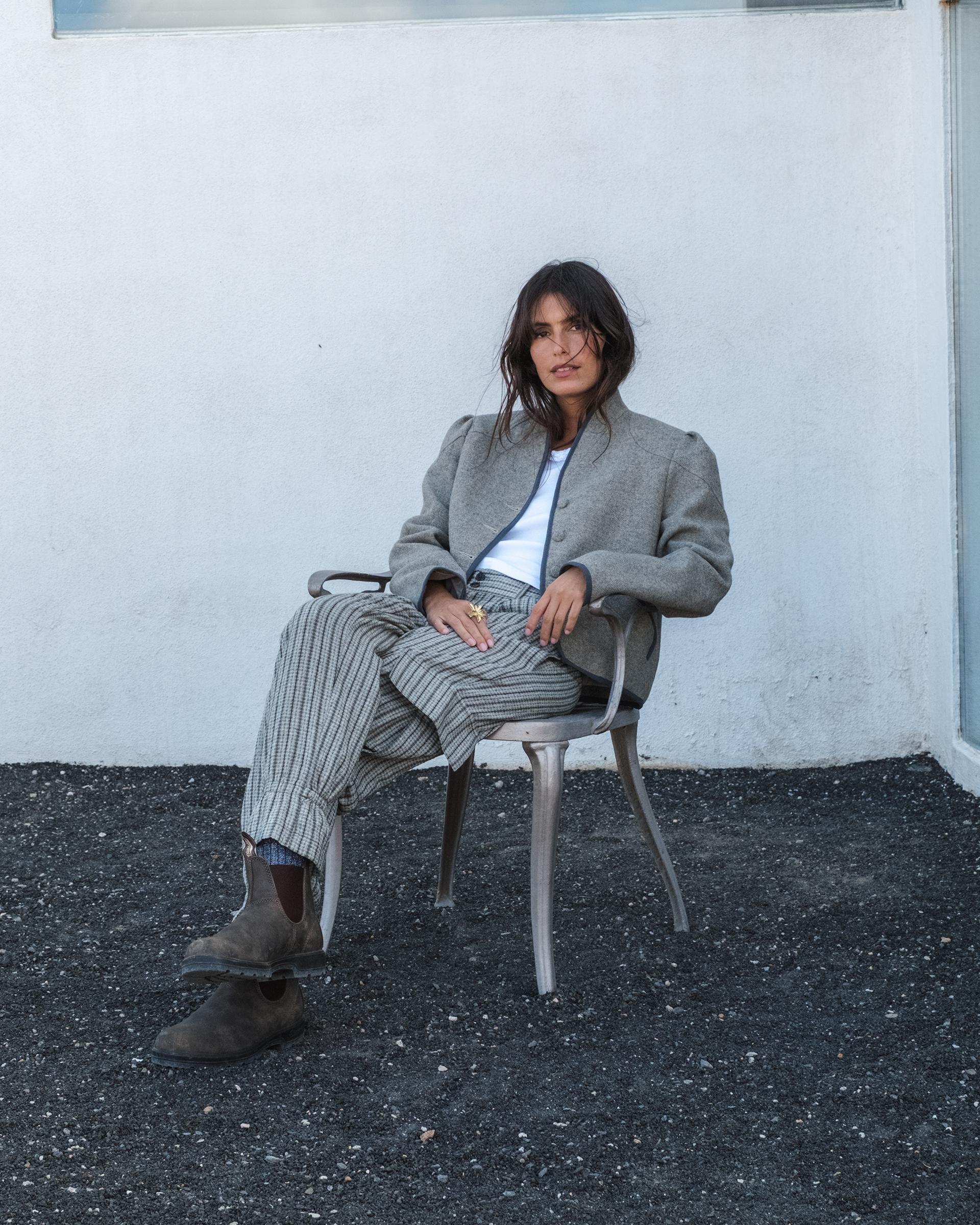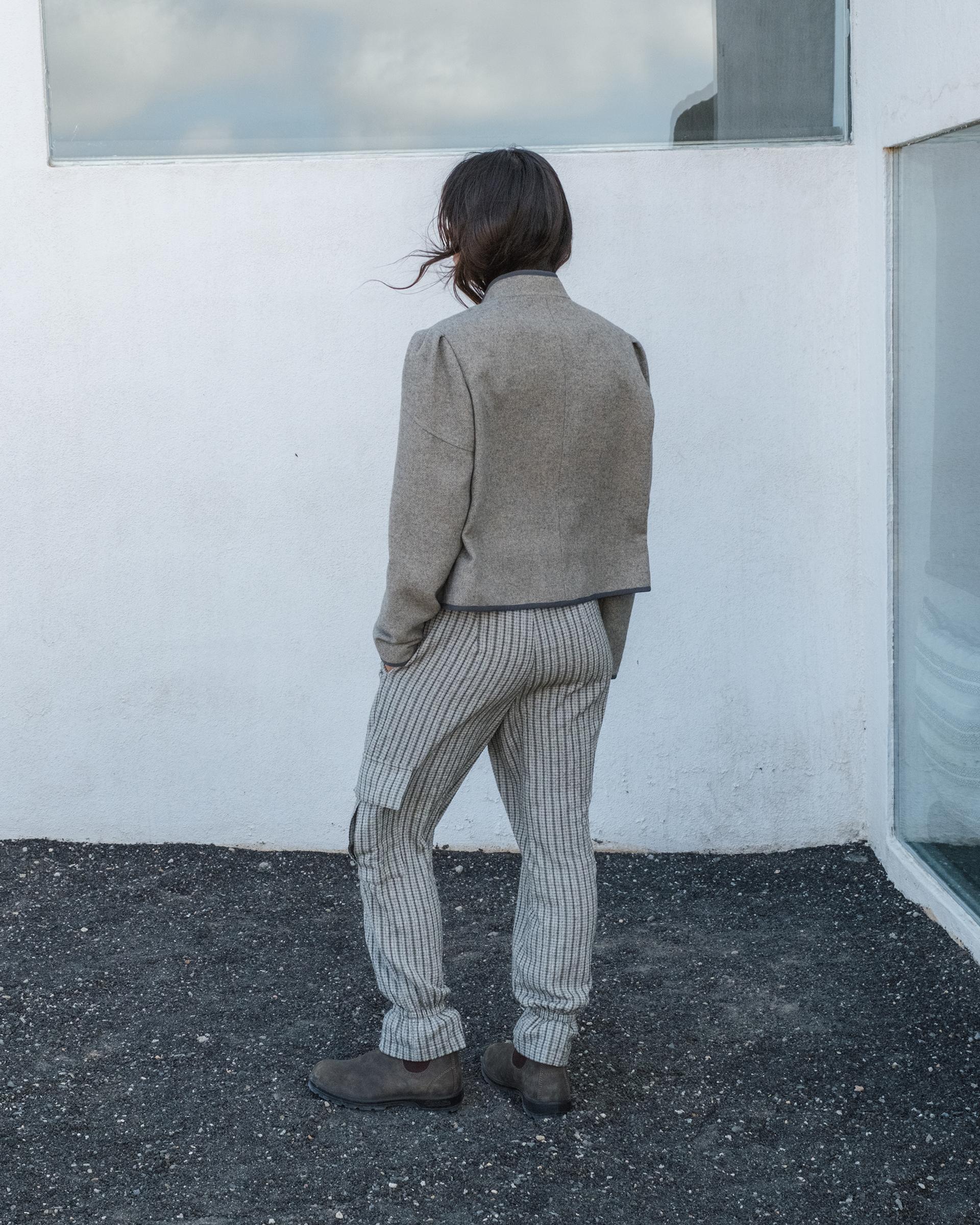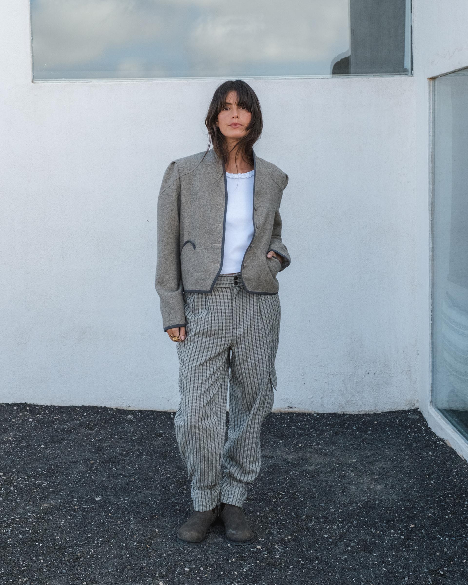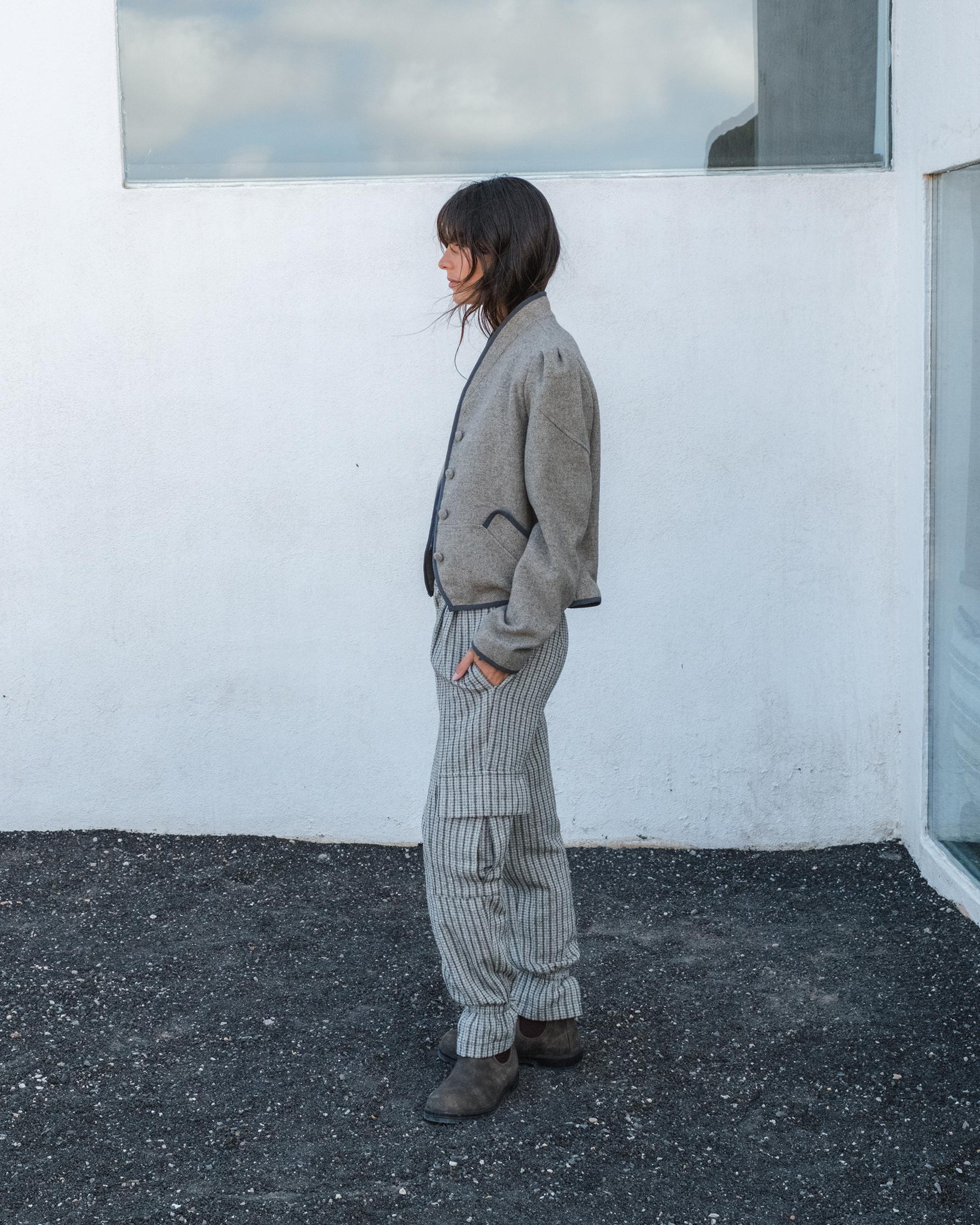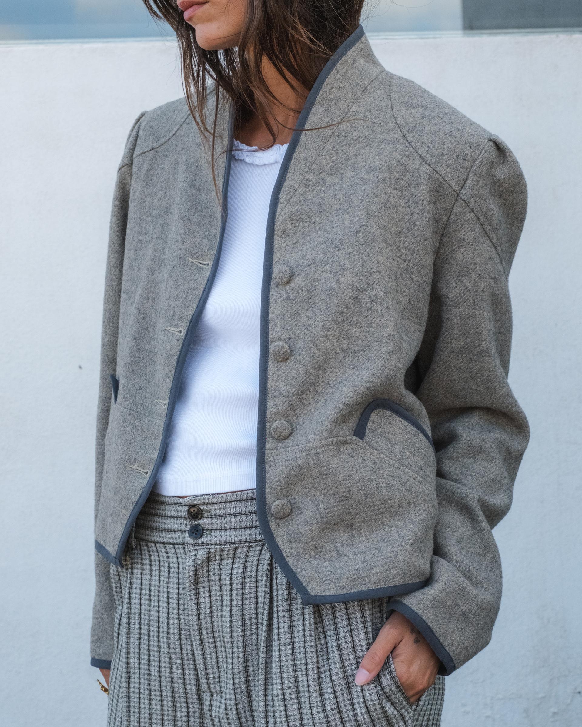 Casaco bomber cinzento com mangas abalonadas, acabamento contrastante e botões forrados em mistura de lã.