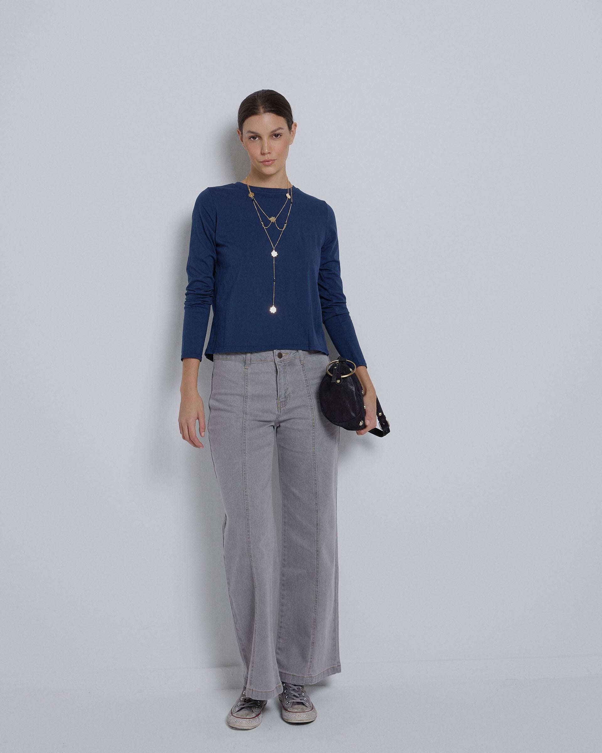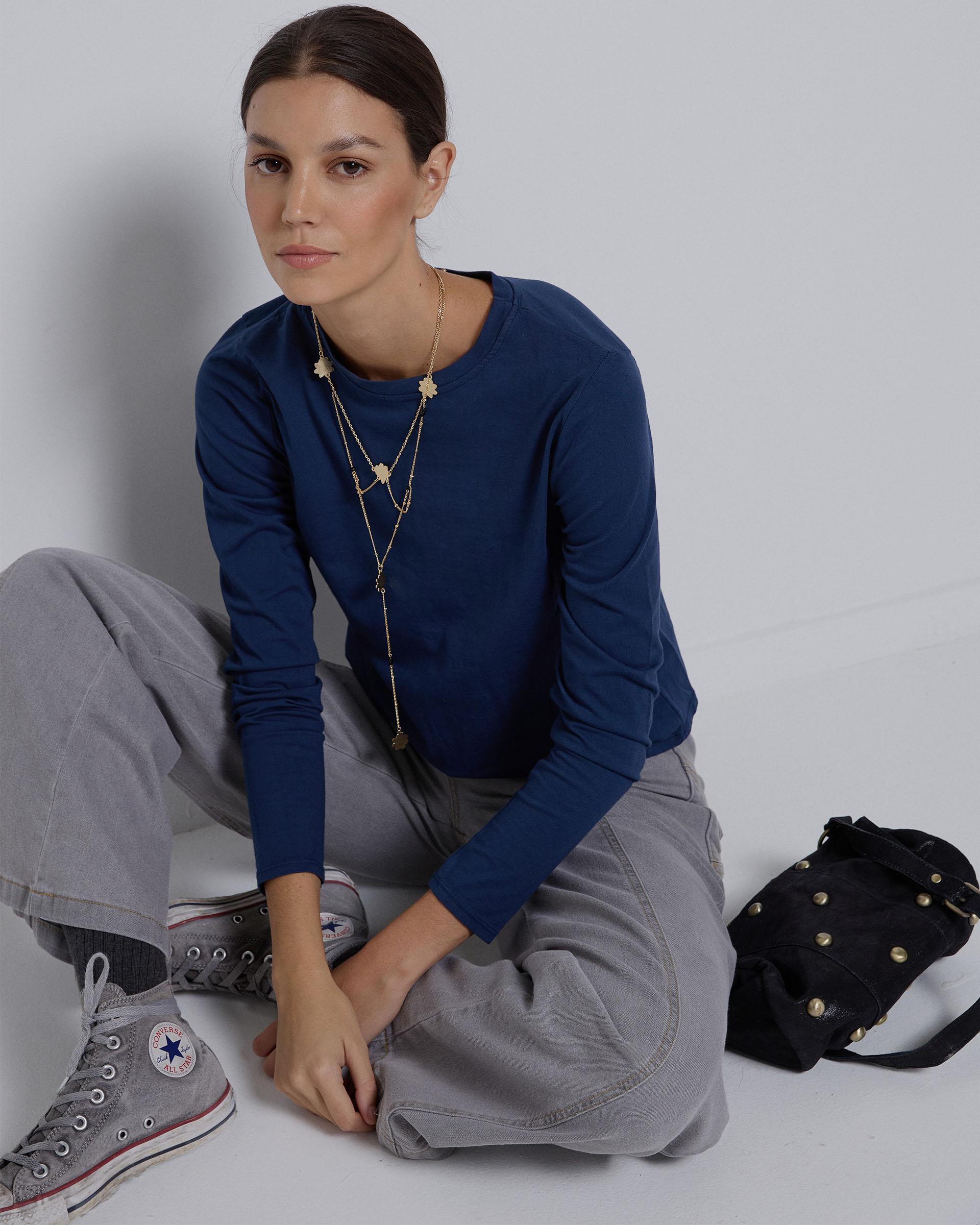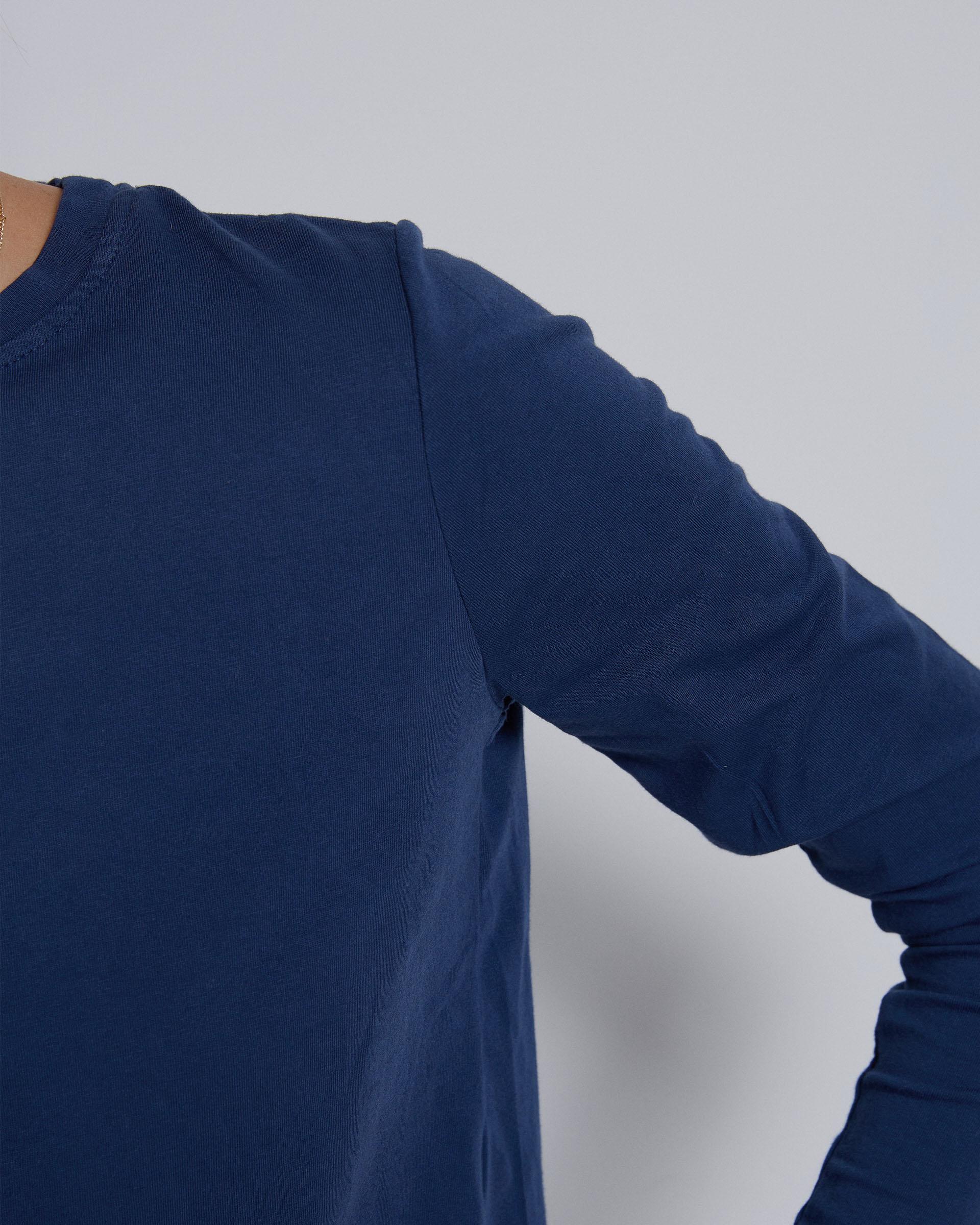 T-shirt básica de manga comprida e gola redonda, em azul marinho.