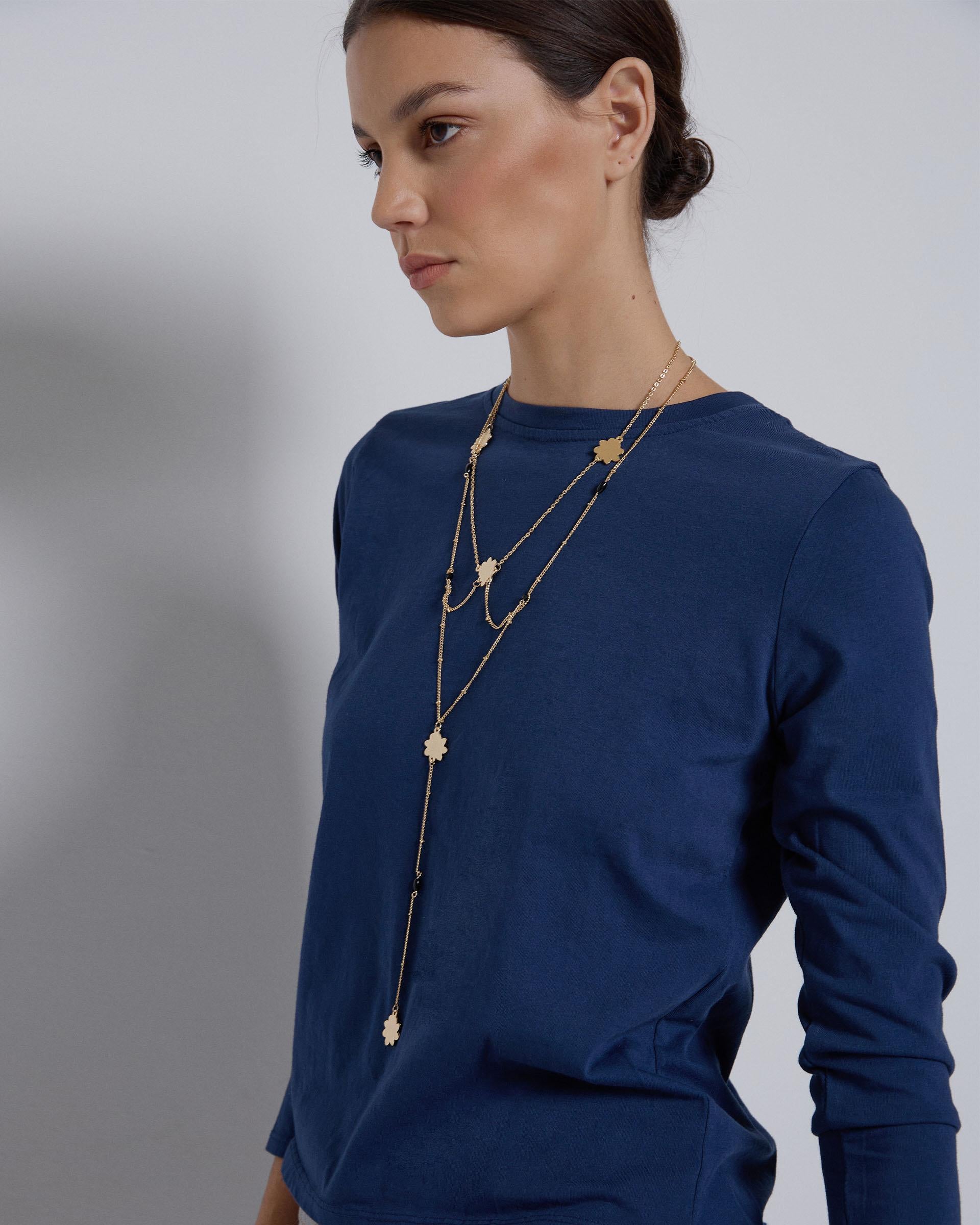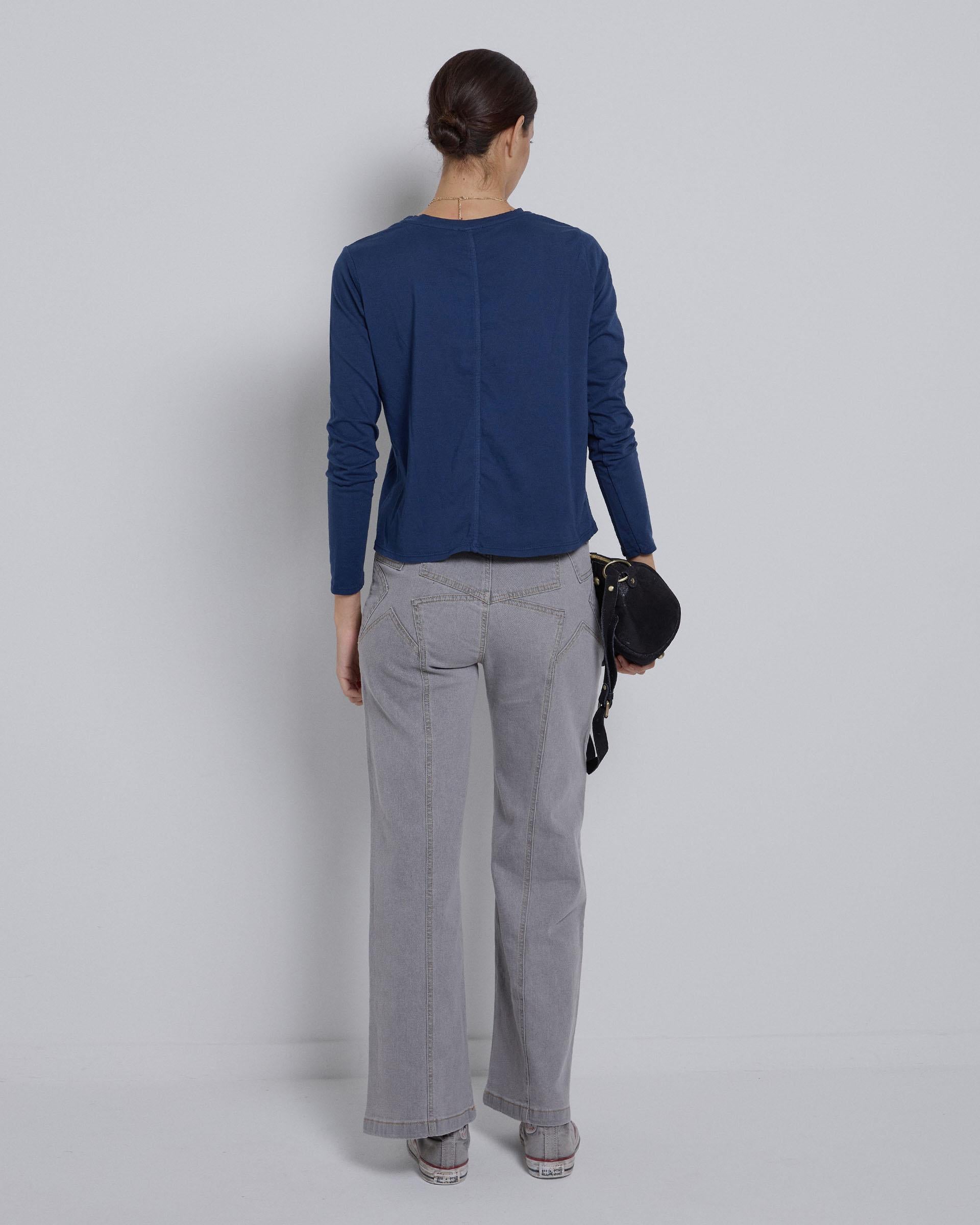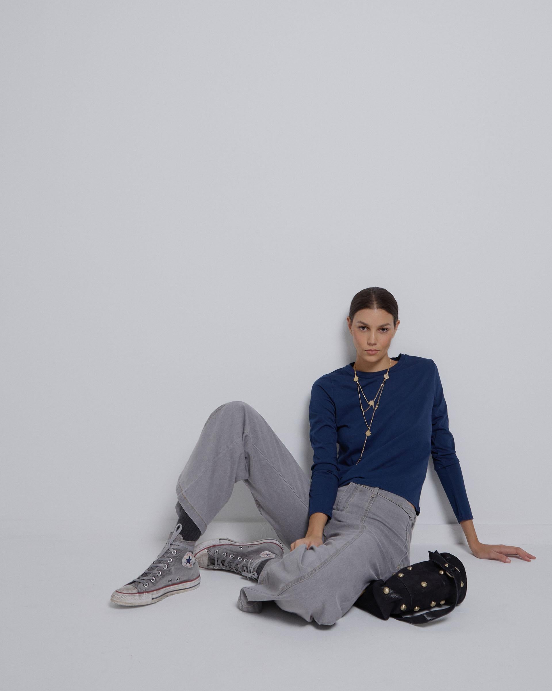 T-shirt básica de manga comprida e gola redonda, em azul marinho.