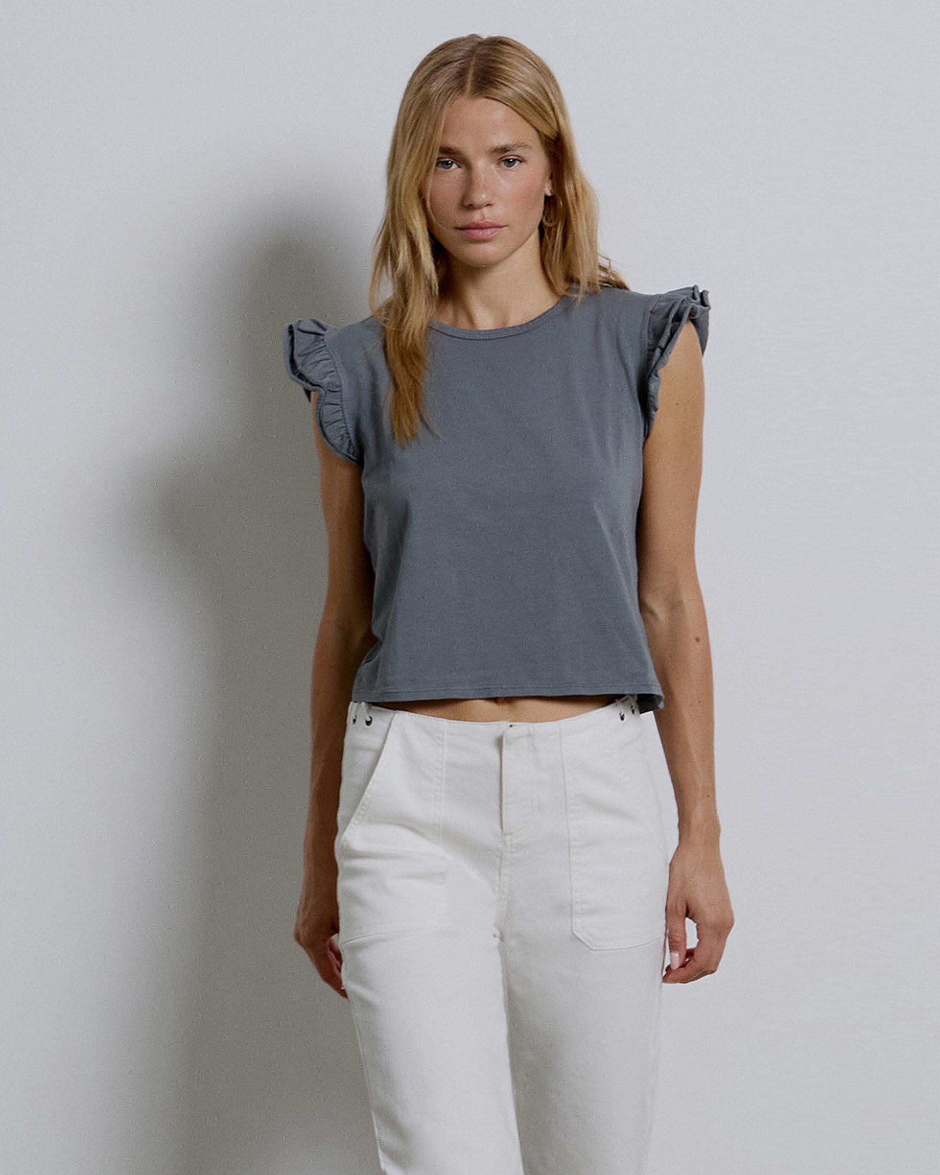 Camiseta de manga curta com babados nas mangas, cinza escuro.