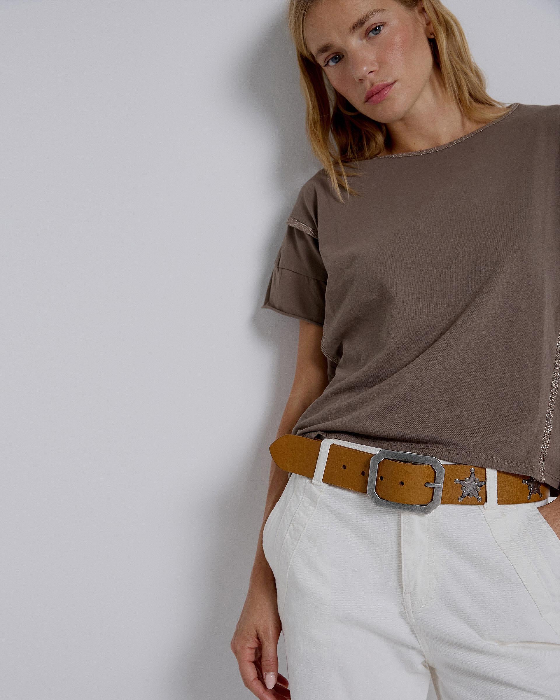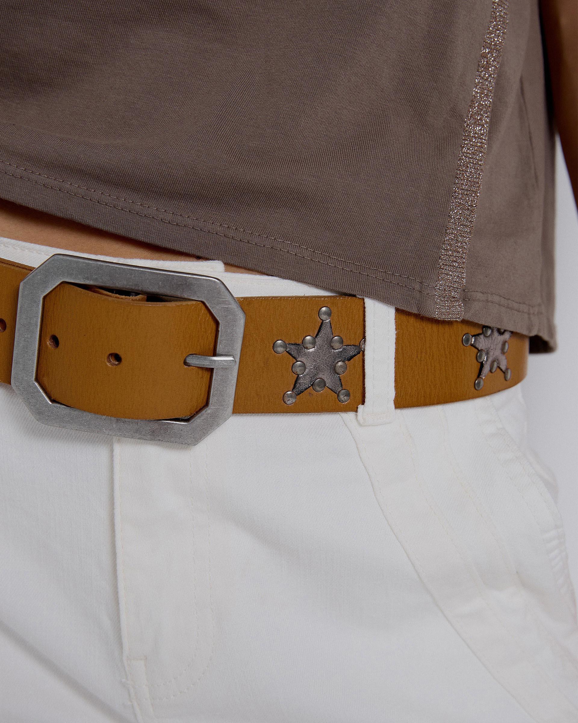 Cinto em pele castanha com estrelas prateadas e tachas prateadas antigas.