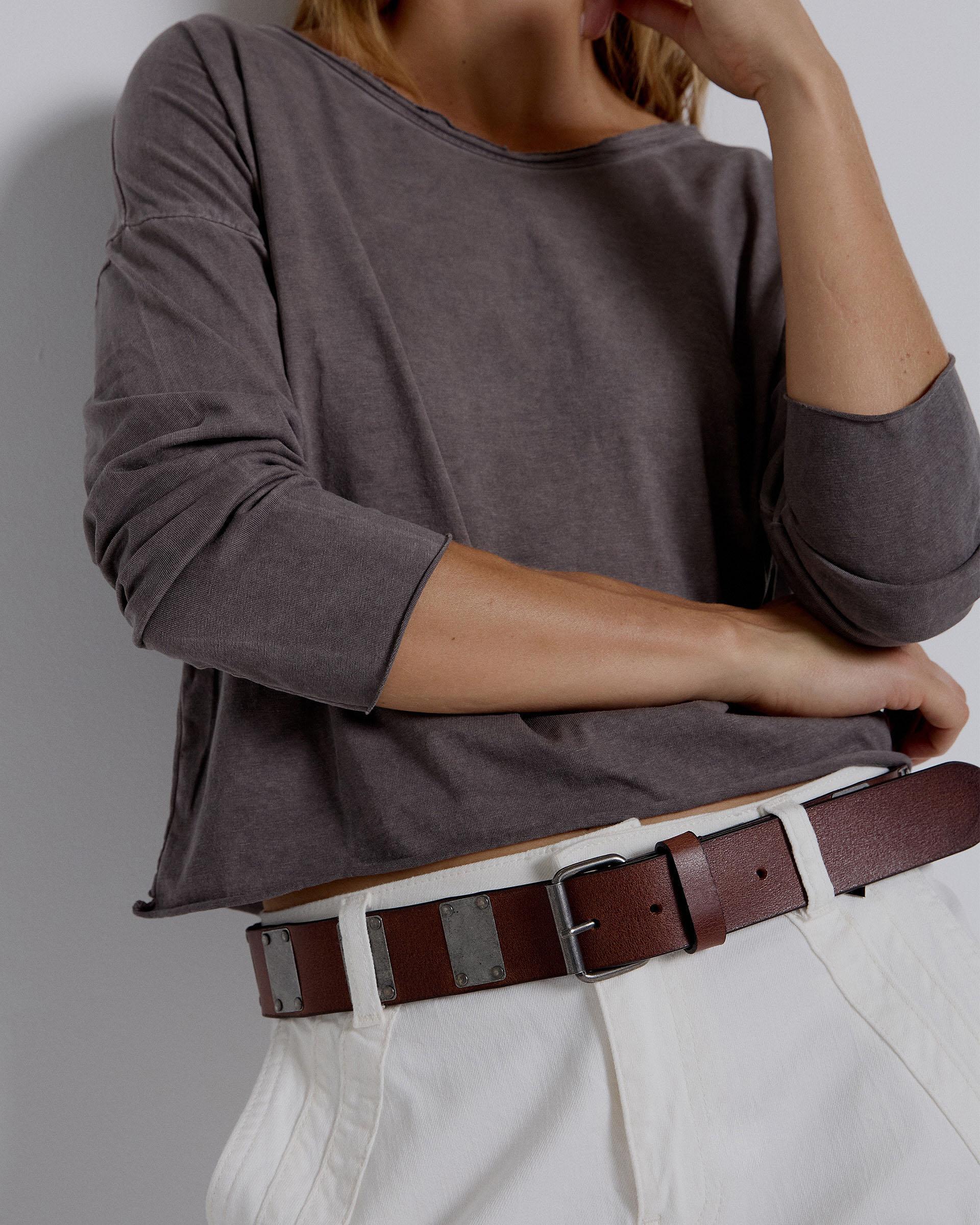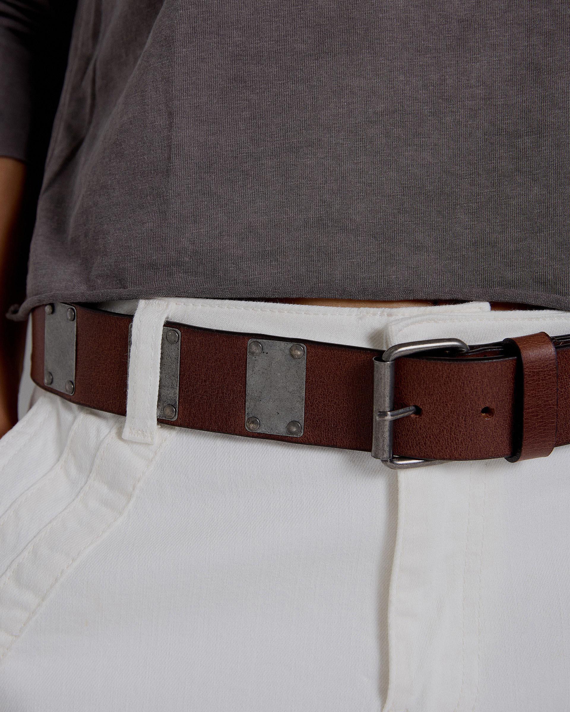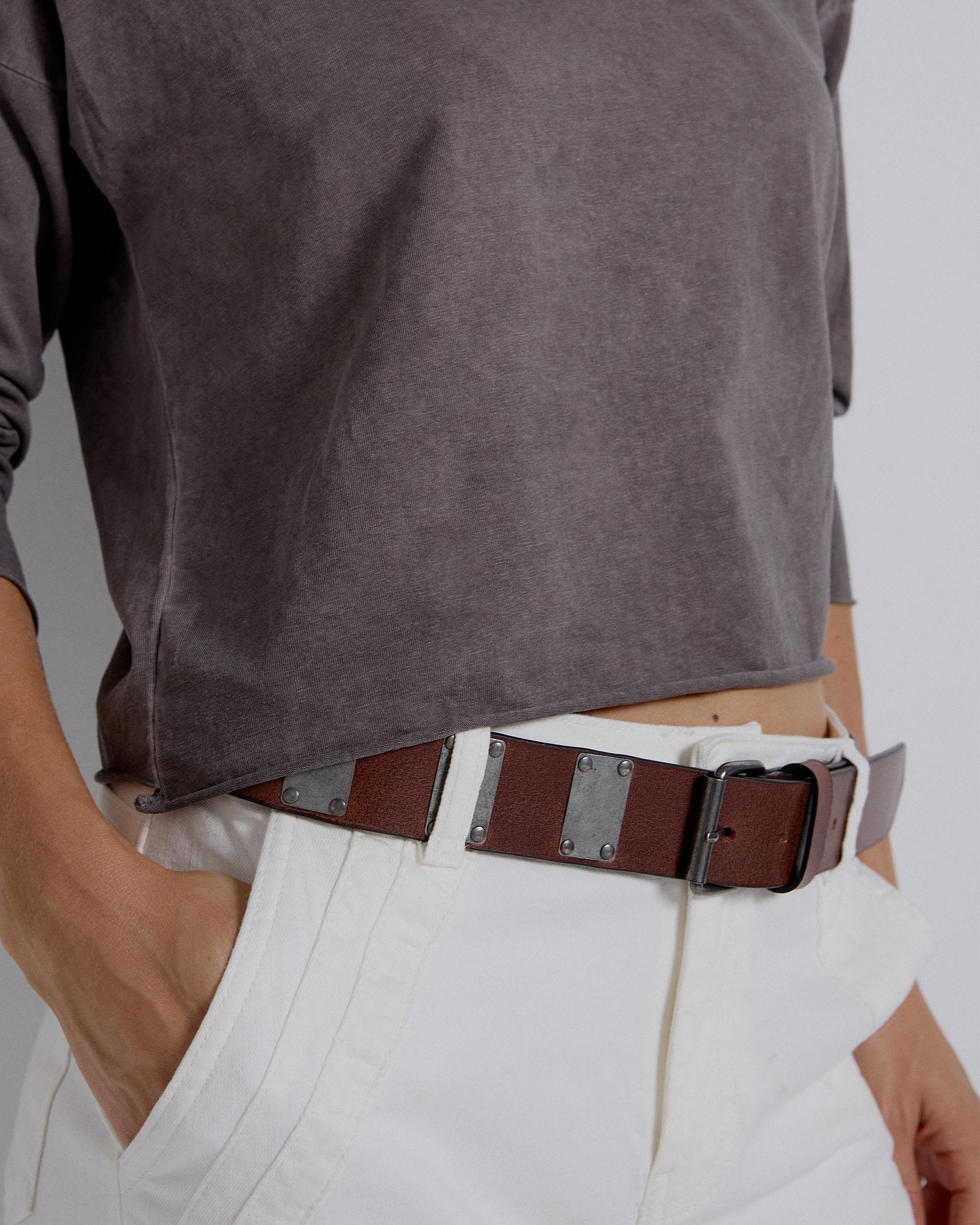 Cinto em pele castanha com detalhe de aplicação em metal.