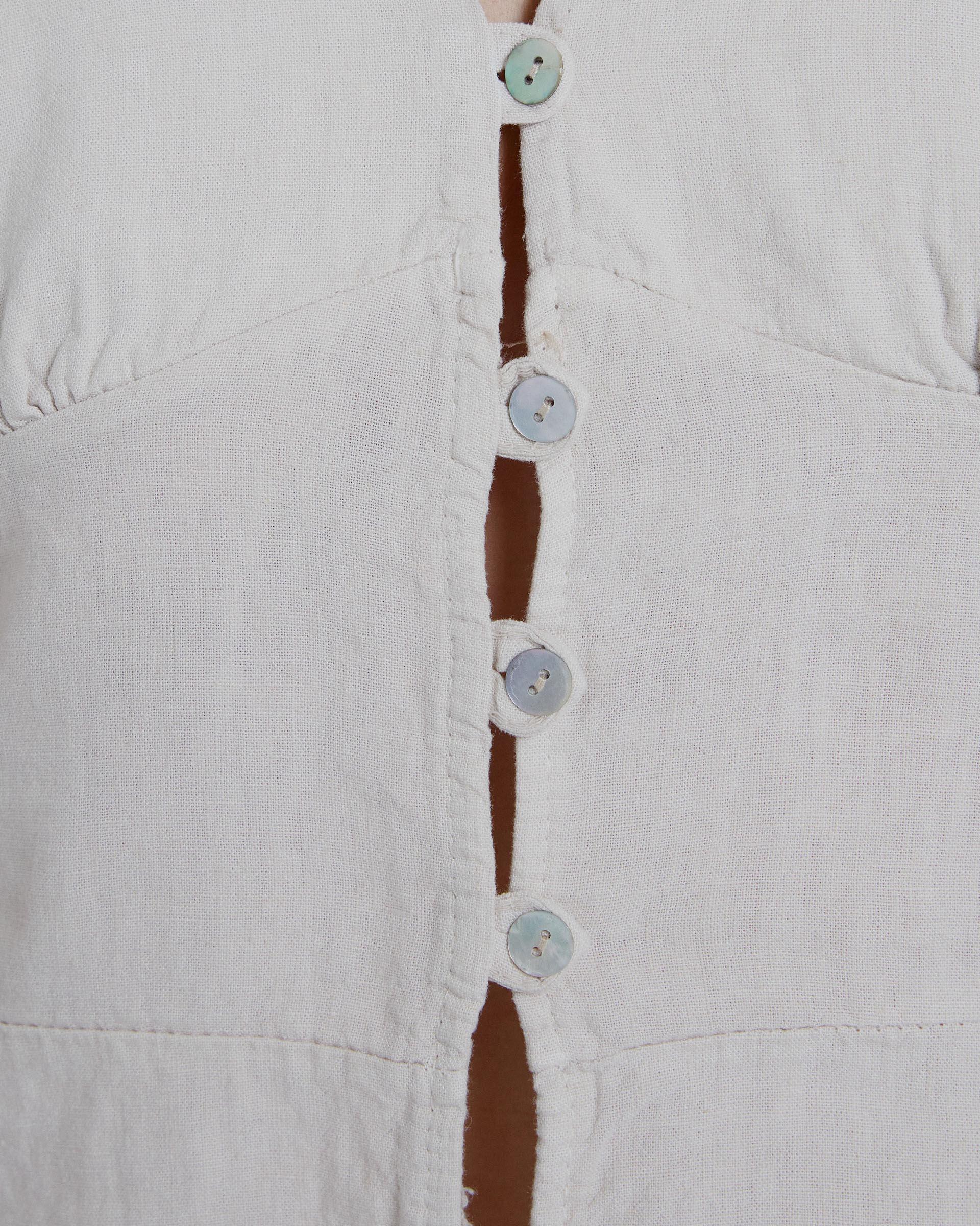 Top cru com decote halter, laço no pescoço, botões à frente e decote nas costas.