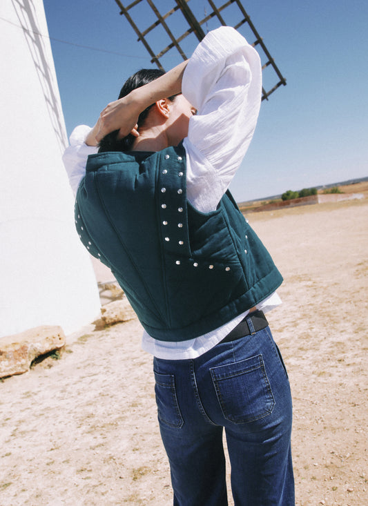 • Calças de ganga com bolsos, perna larga, costura azul.