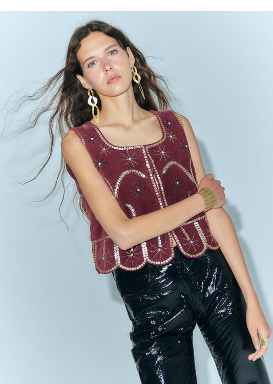 Blusa castanha com decote quadrado e renda