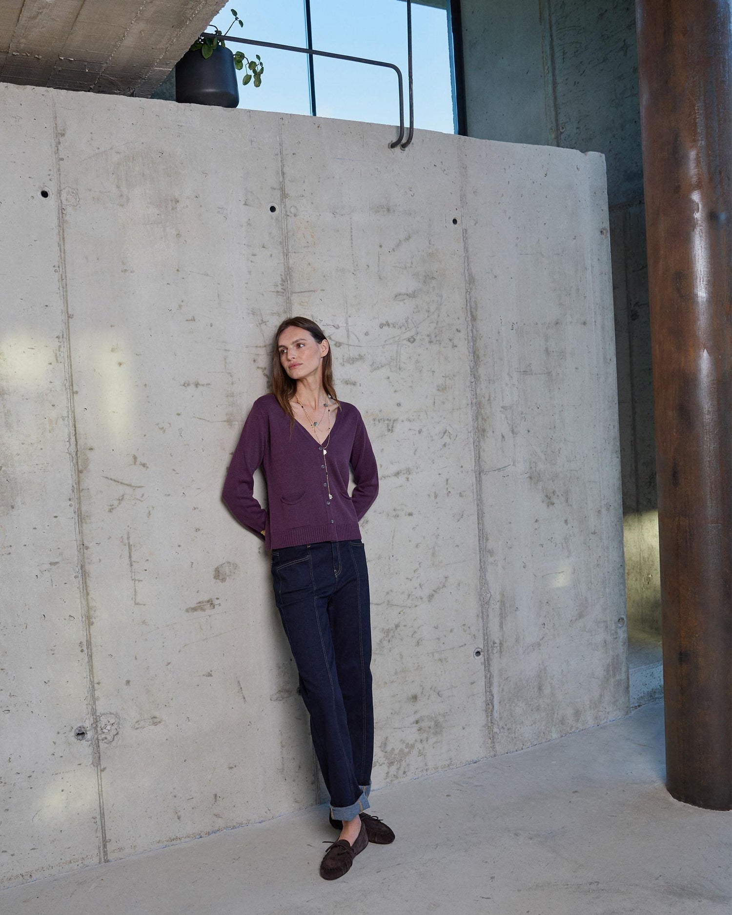 Casaco roxo de abotoamento duplo com fecho de cordões.