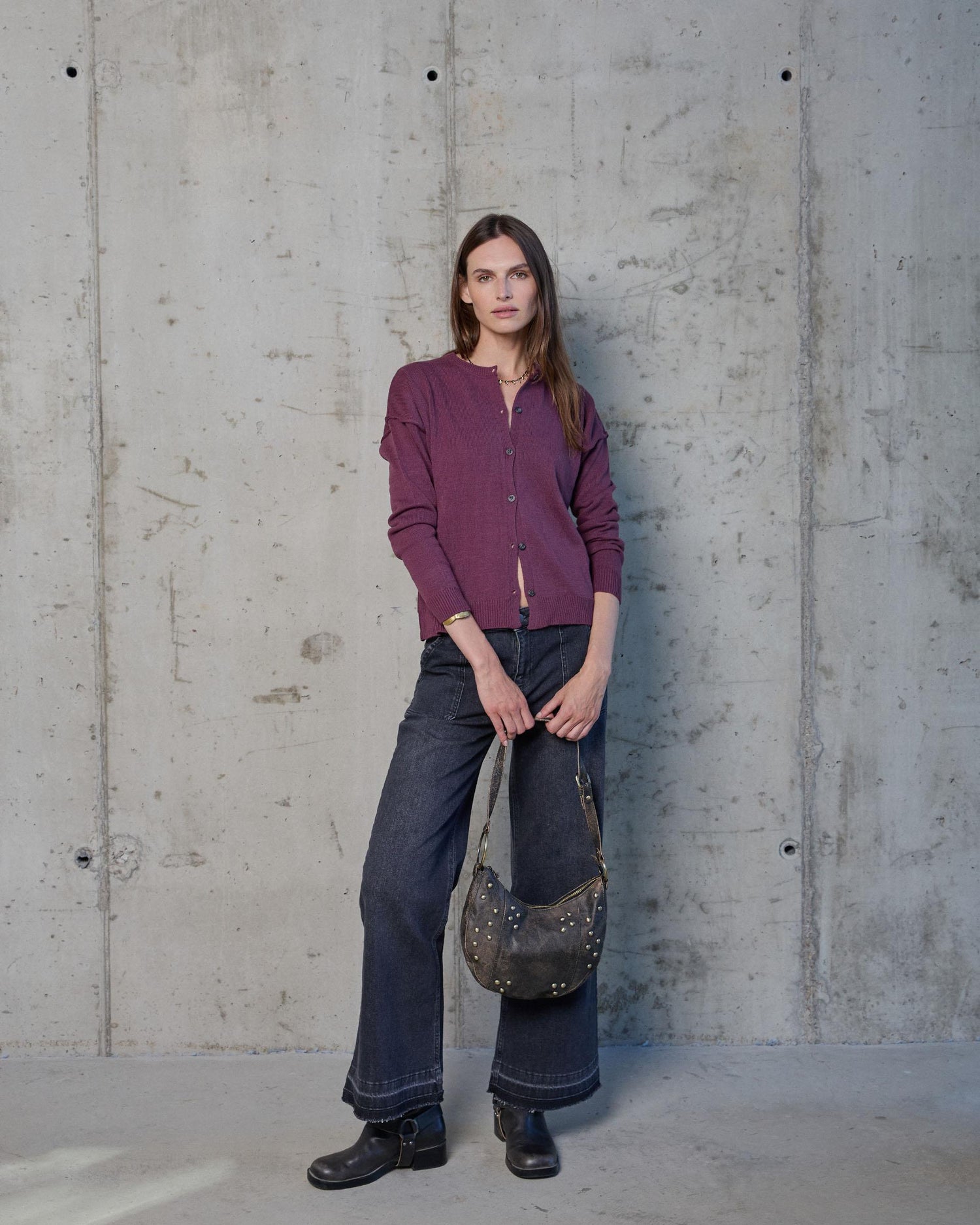 • Casaco roxo de abotoamento duplo com fecho de cordões.