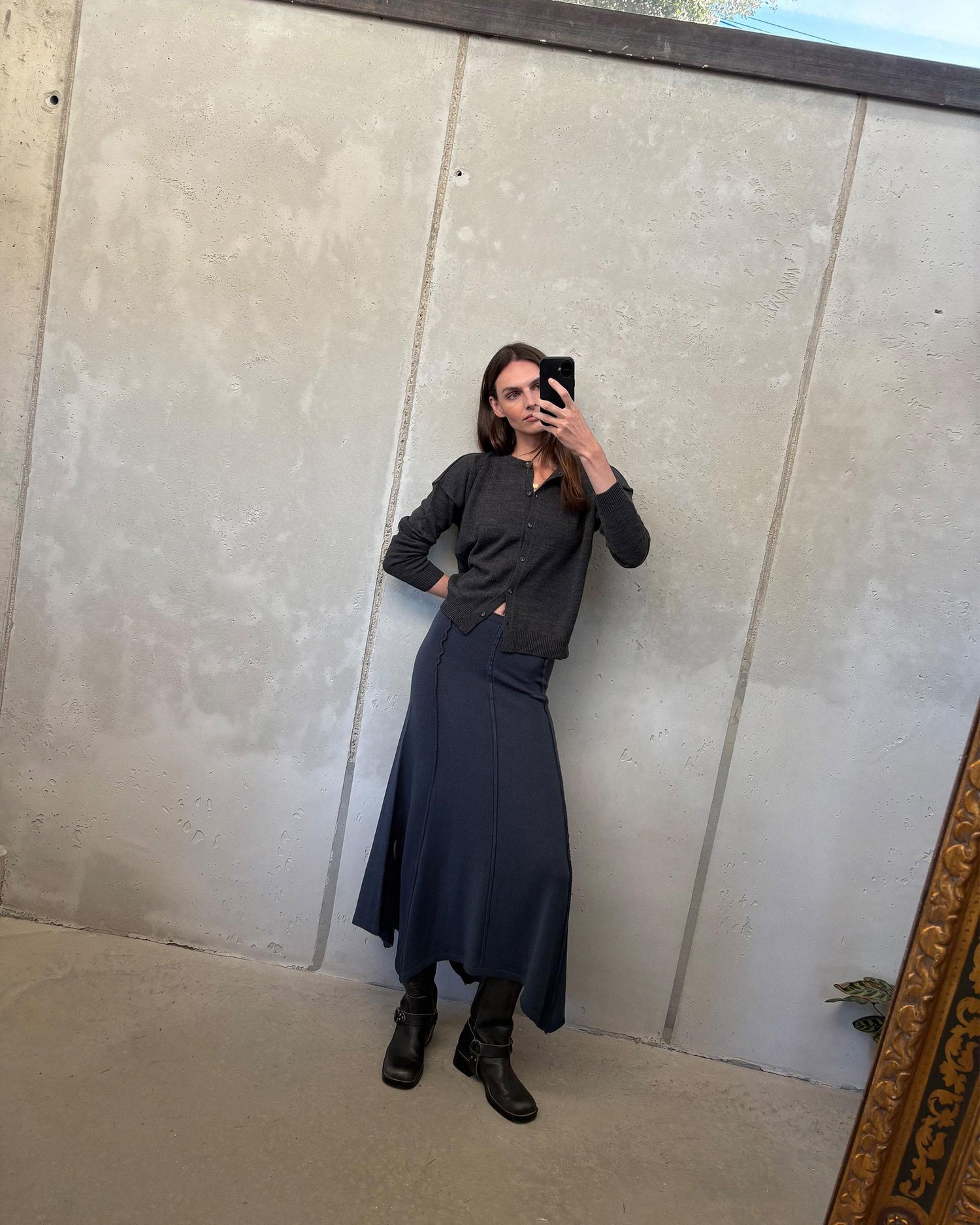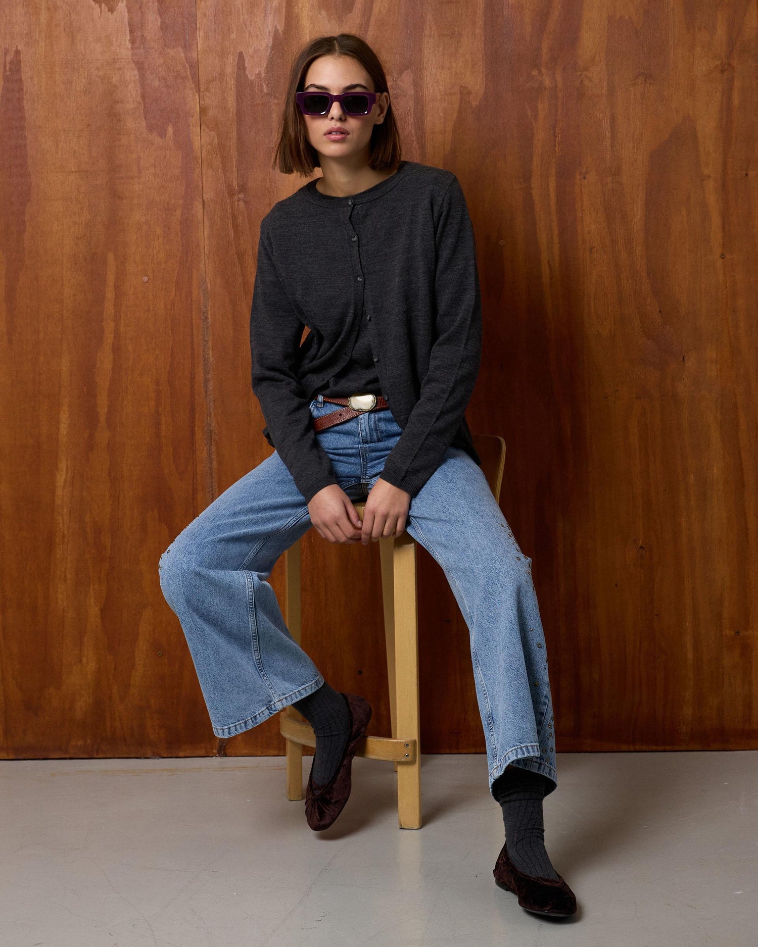 • Calças de ganga com passadores de cinto e botões, antracite.