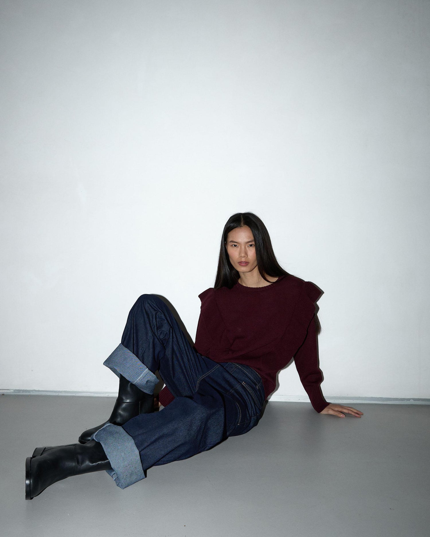 • Casaco roxo de abotoamento duplo com fecho de cordões.