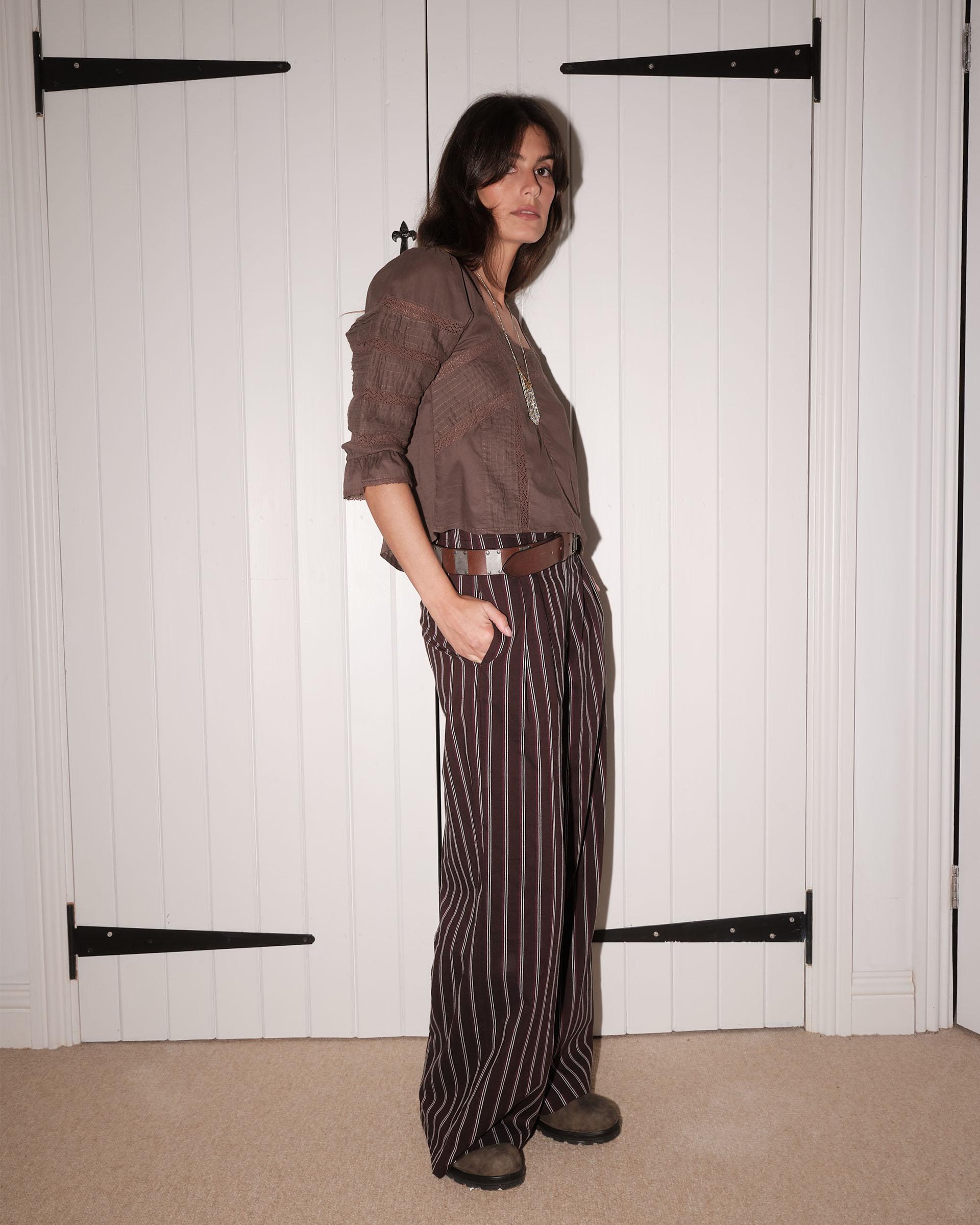 Blusa com mangas a três quartos, decote quadrado e acabamento em renda castanha.