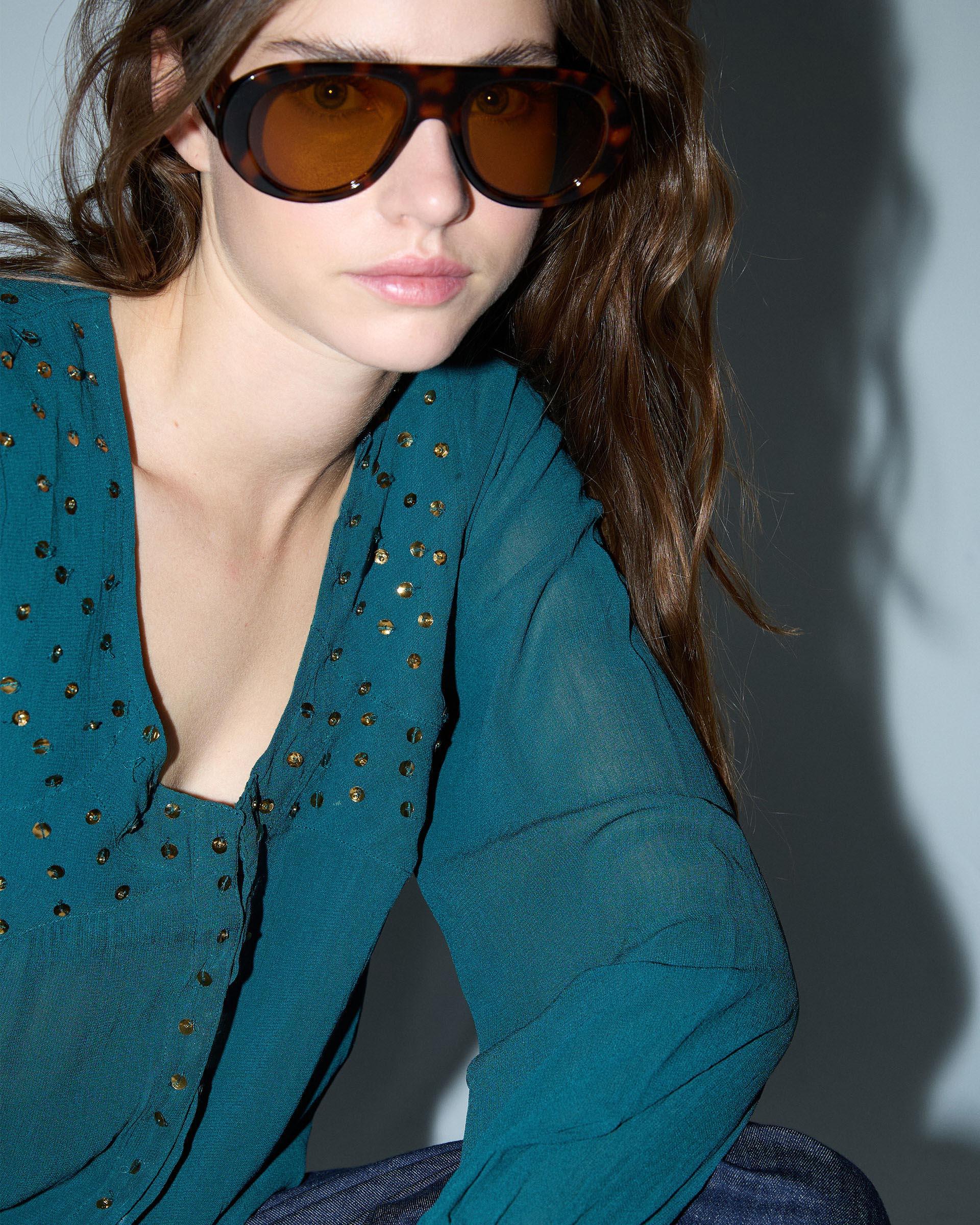 Blusa de lantejoulas, detalhe no decote em tom petróleo.