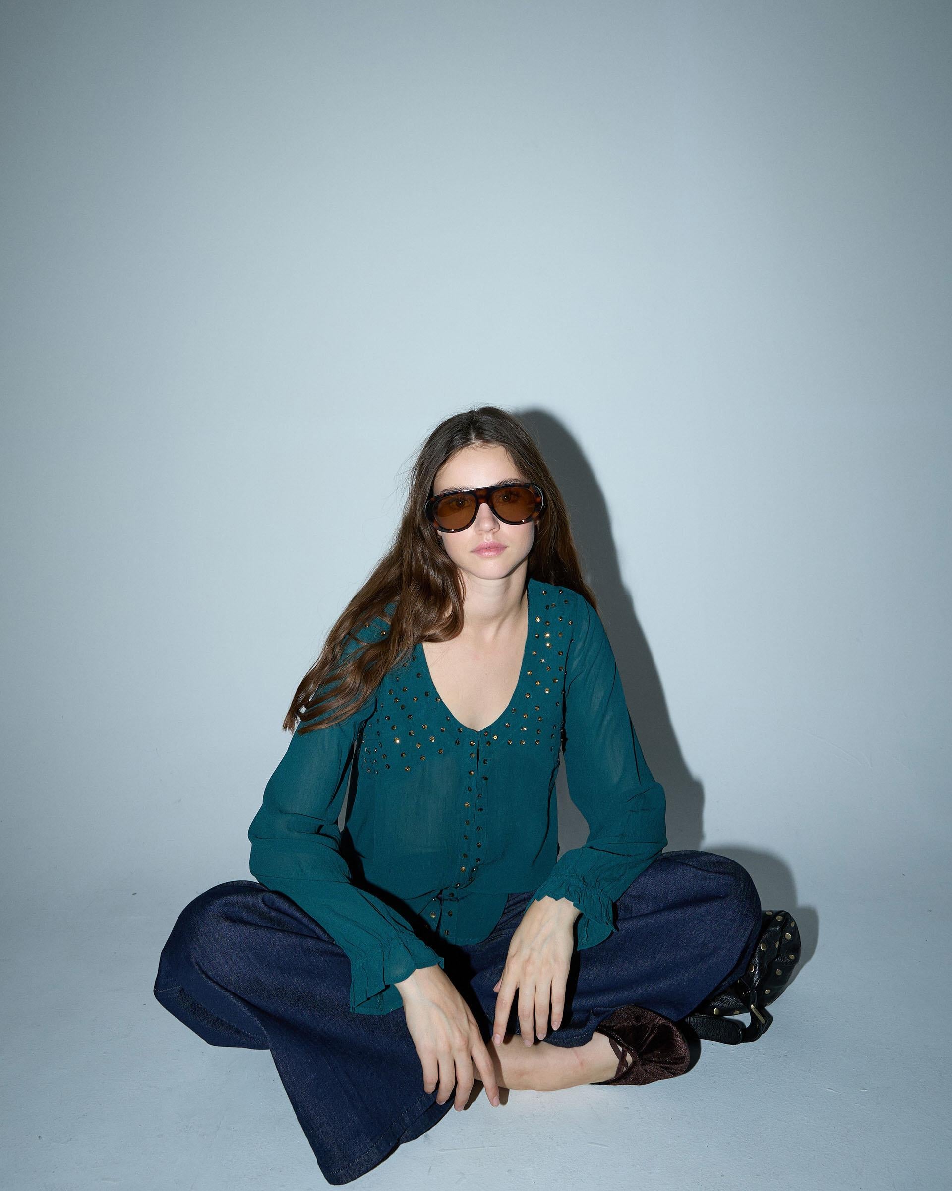 Blusa azul petróleo de manga comprida com detalhes em lantejoulas douradas, decote em V e fecho invisível com colchetes.