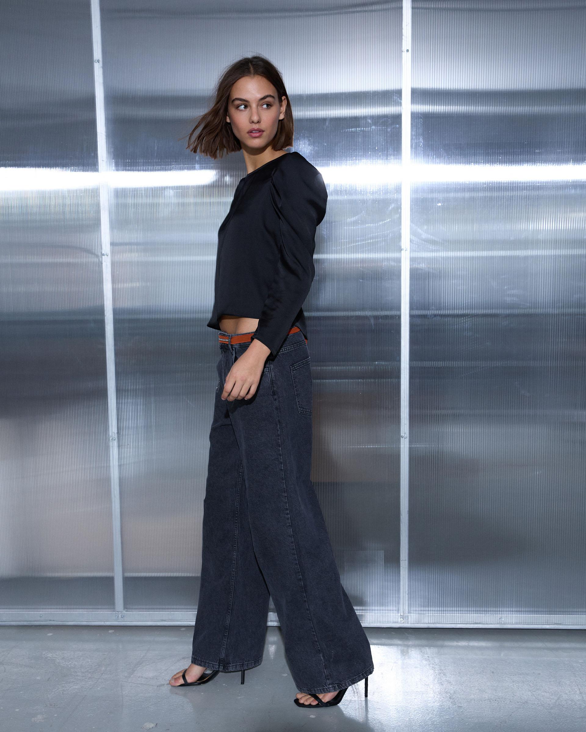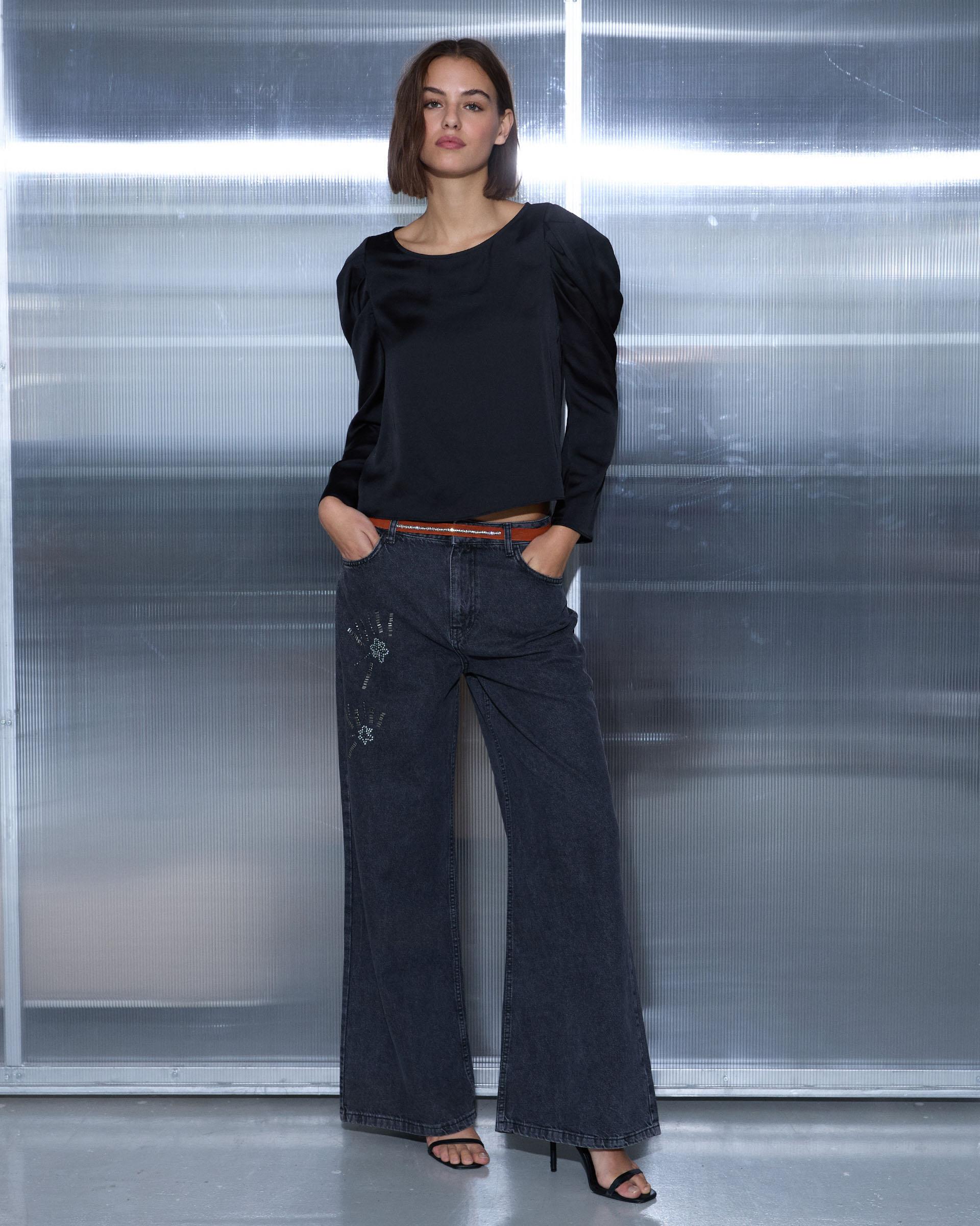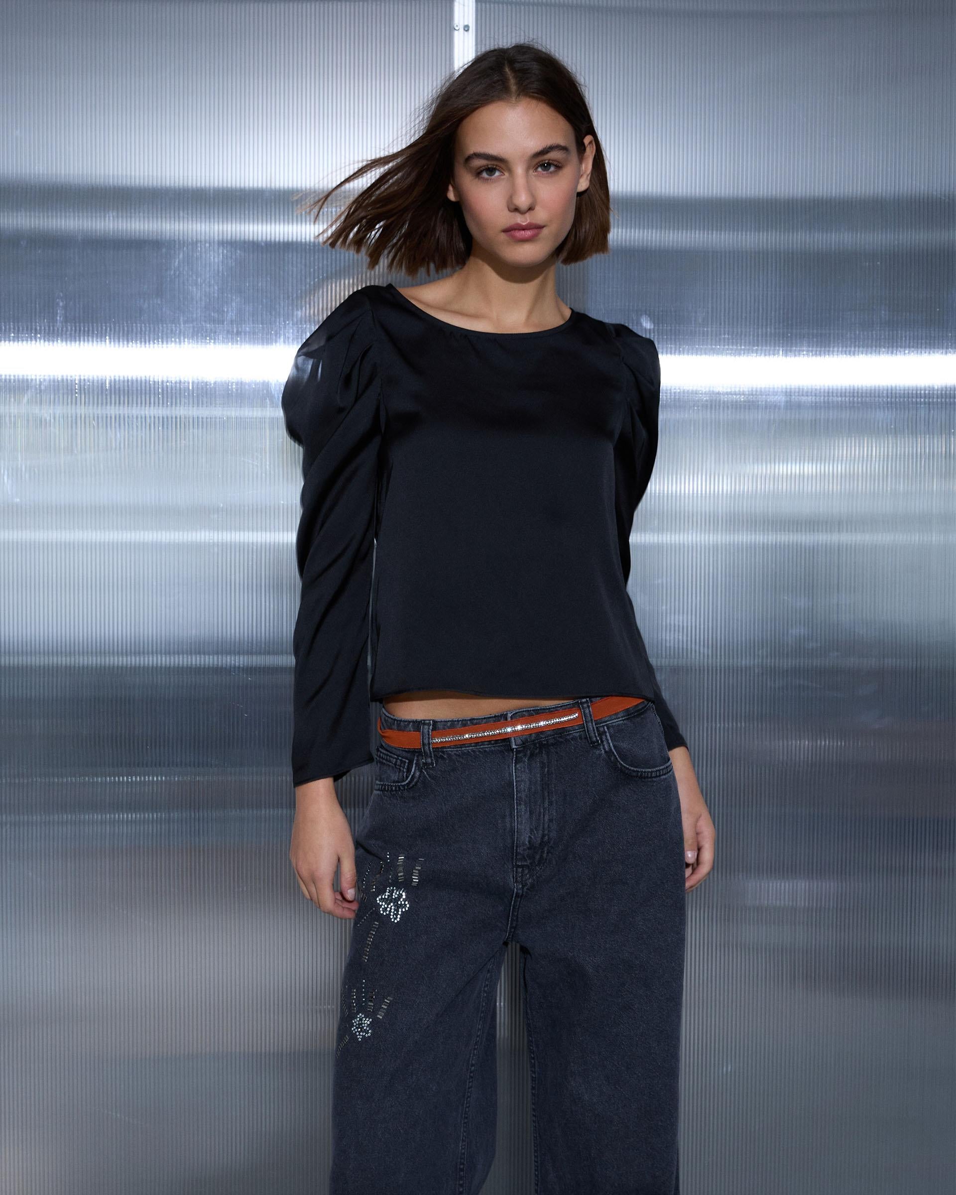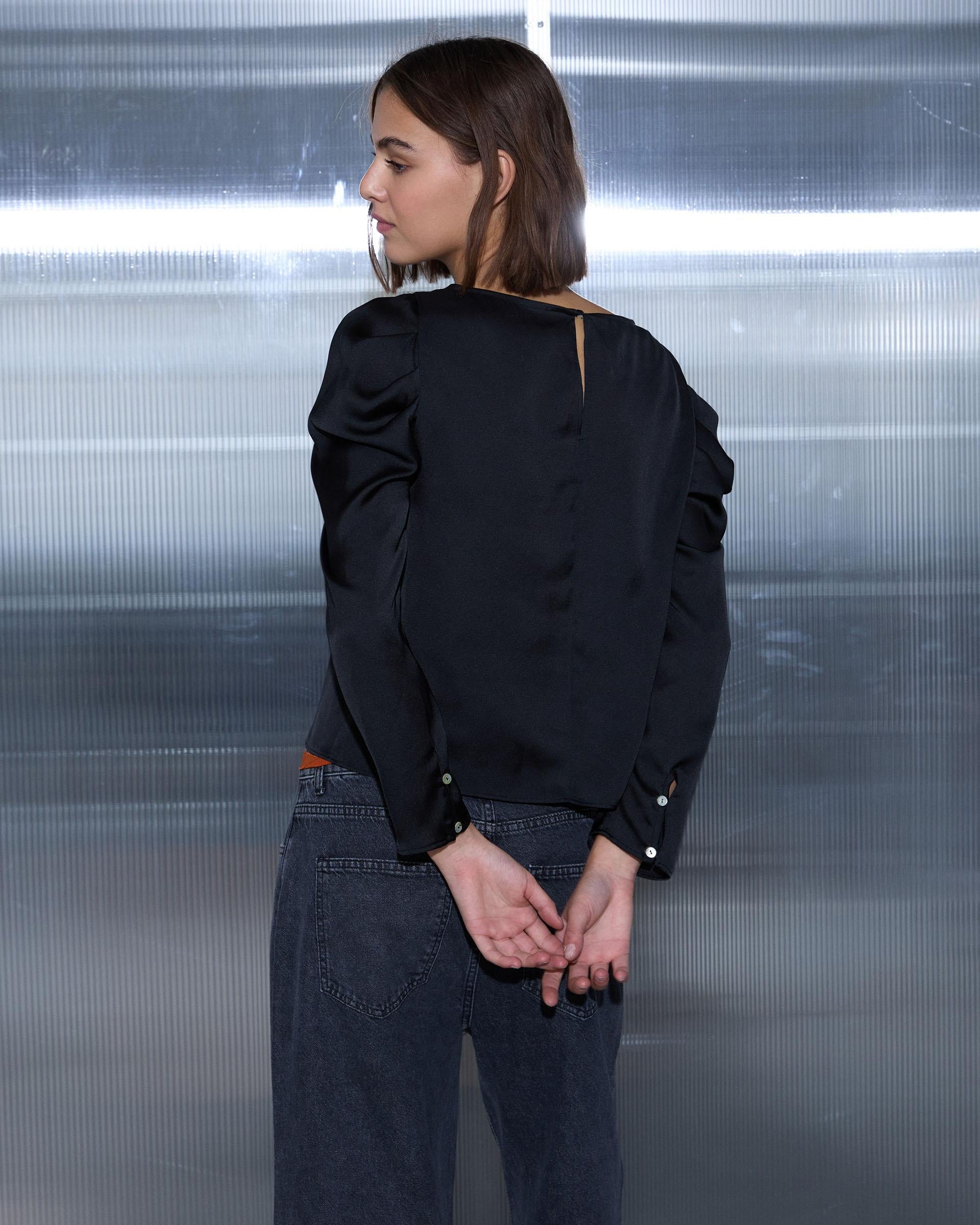 Blusa abalonada de manga comprida, gola redonda e fecho em lágrima e botão nas costas, em preto.