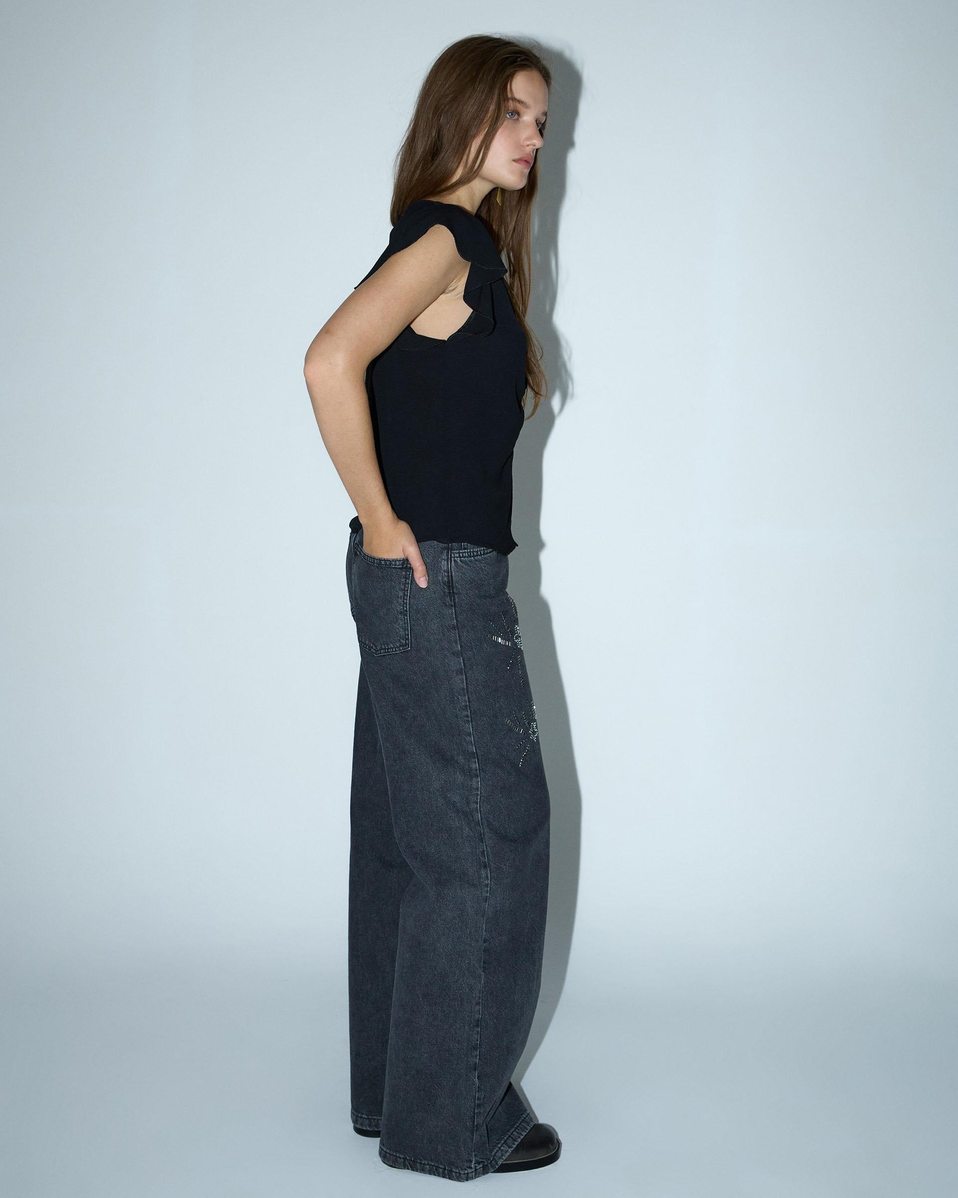 Blusa de manga curta com decote em V e franzido na frente, em preto.