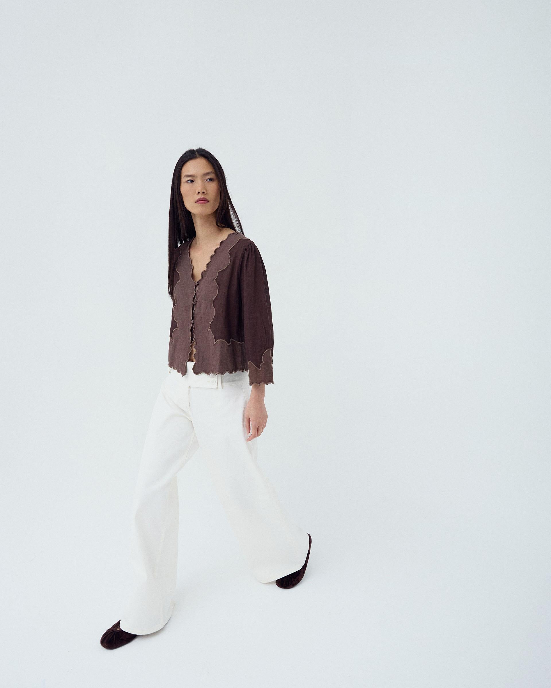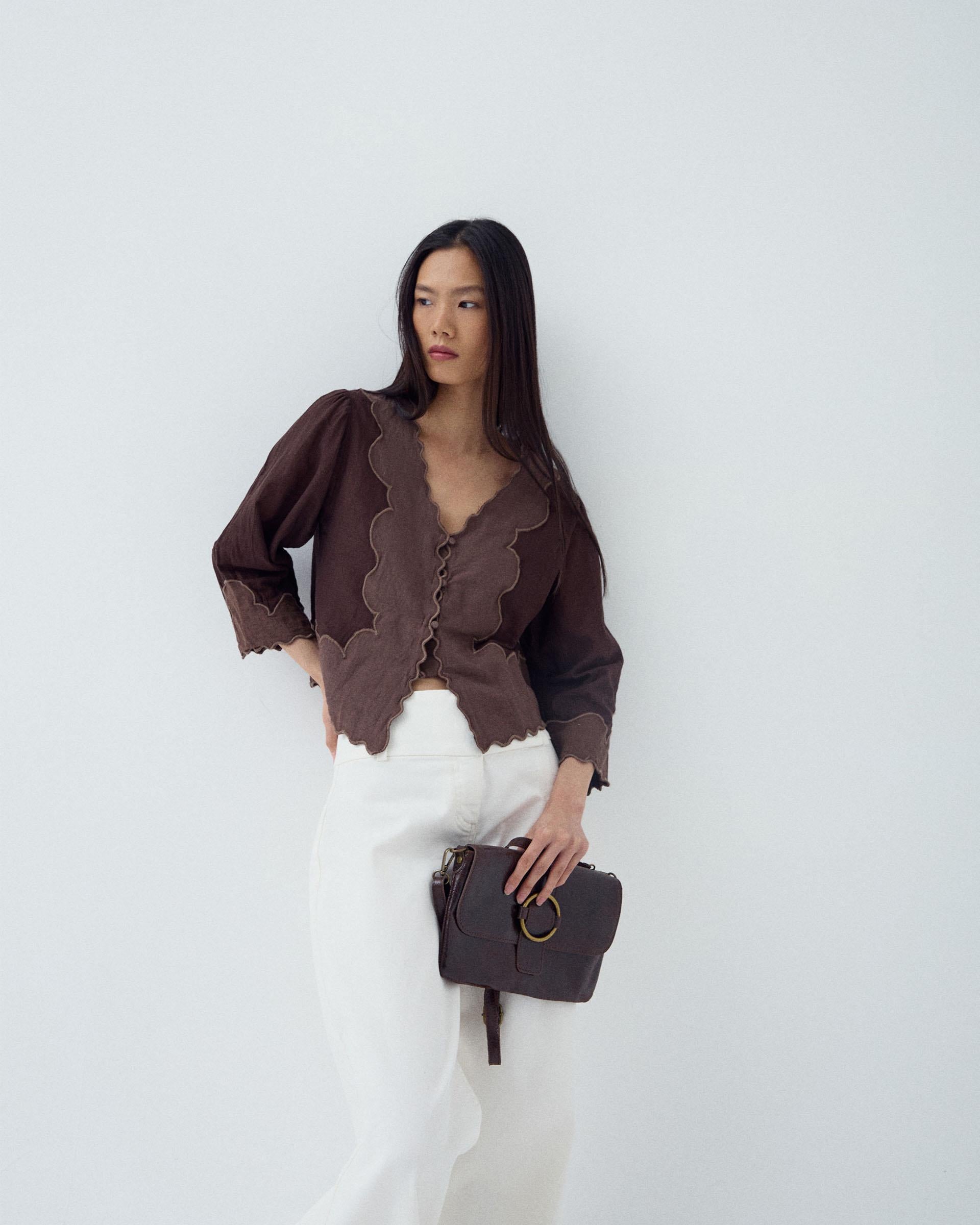 Blusa com mangas francesas, detalhe ondulado contrastante, decote em V e fecho frontal com botões a condizer.