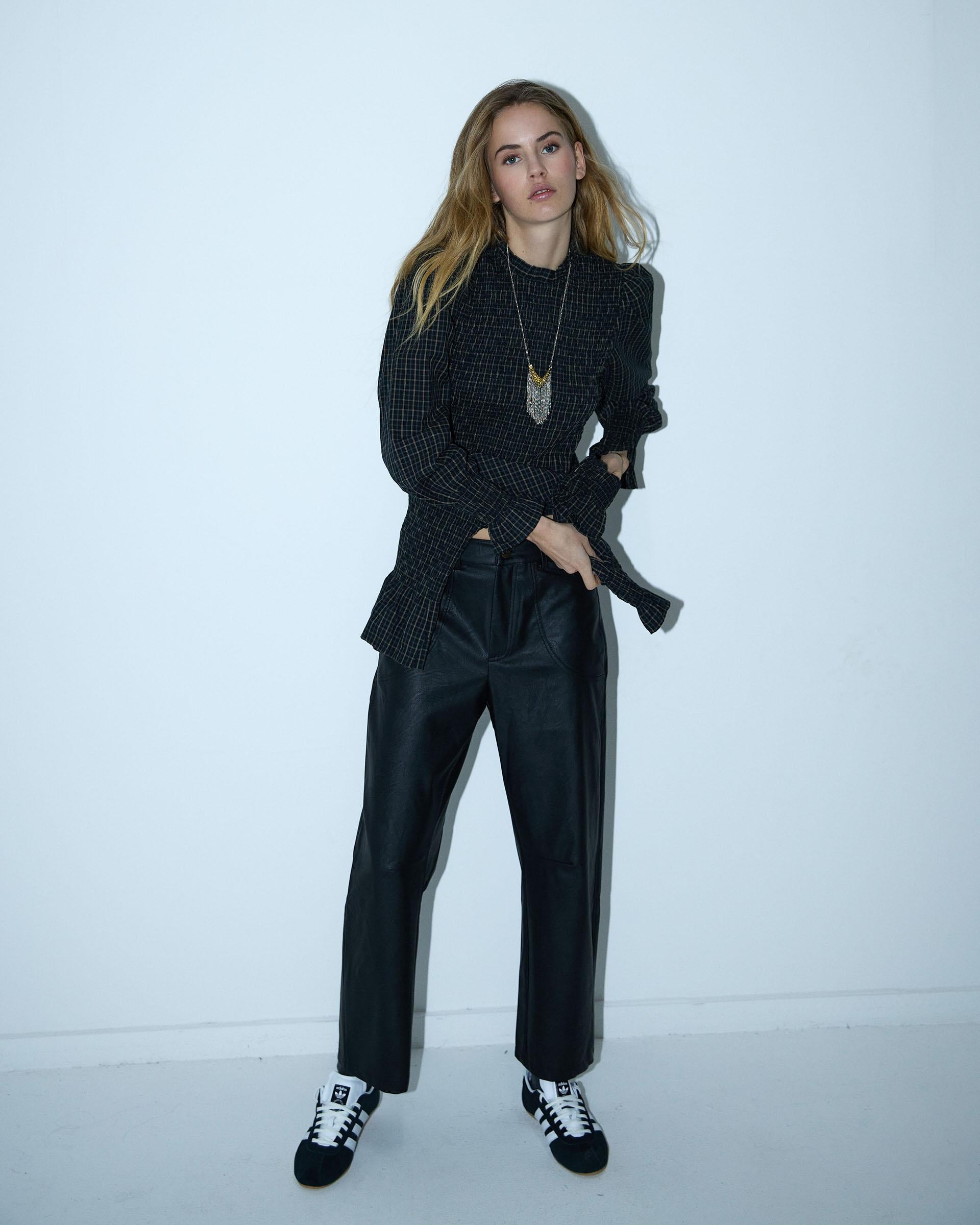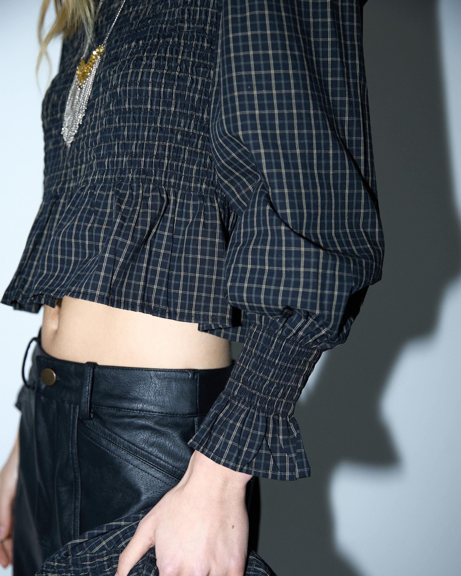Blusa de manga comprida com estampado xadrez preto e detalhe em favo de mel.