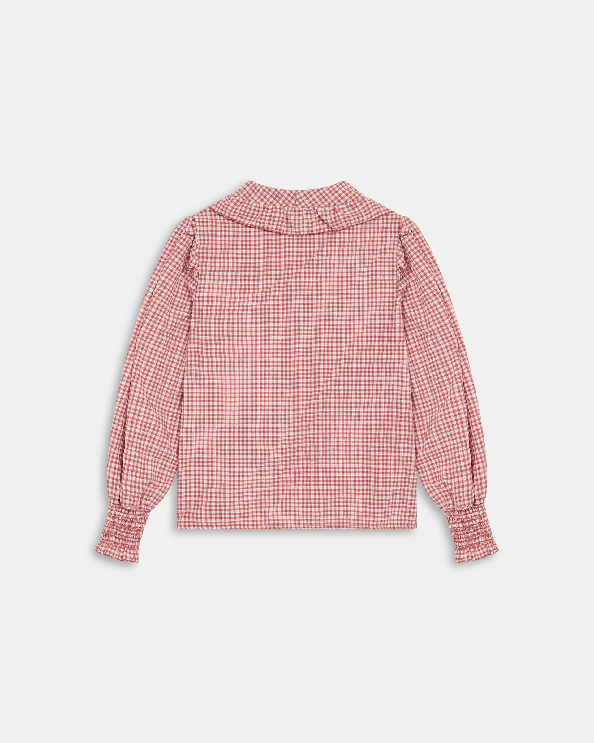 Blusa de quadros vichy em cor tijolo, detalhe de gola ampla com folho e botões na frente.