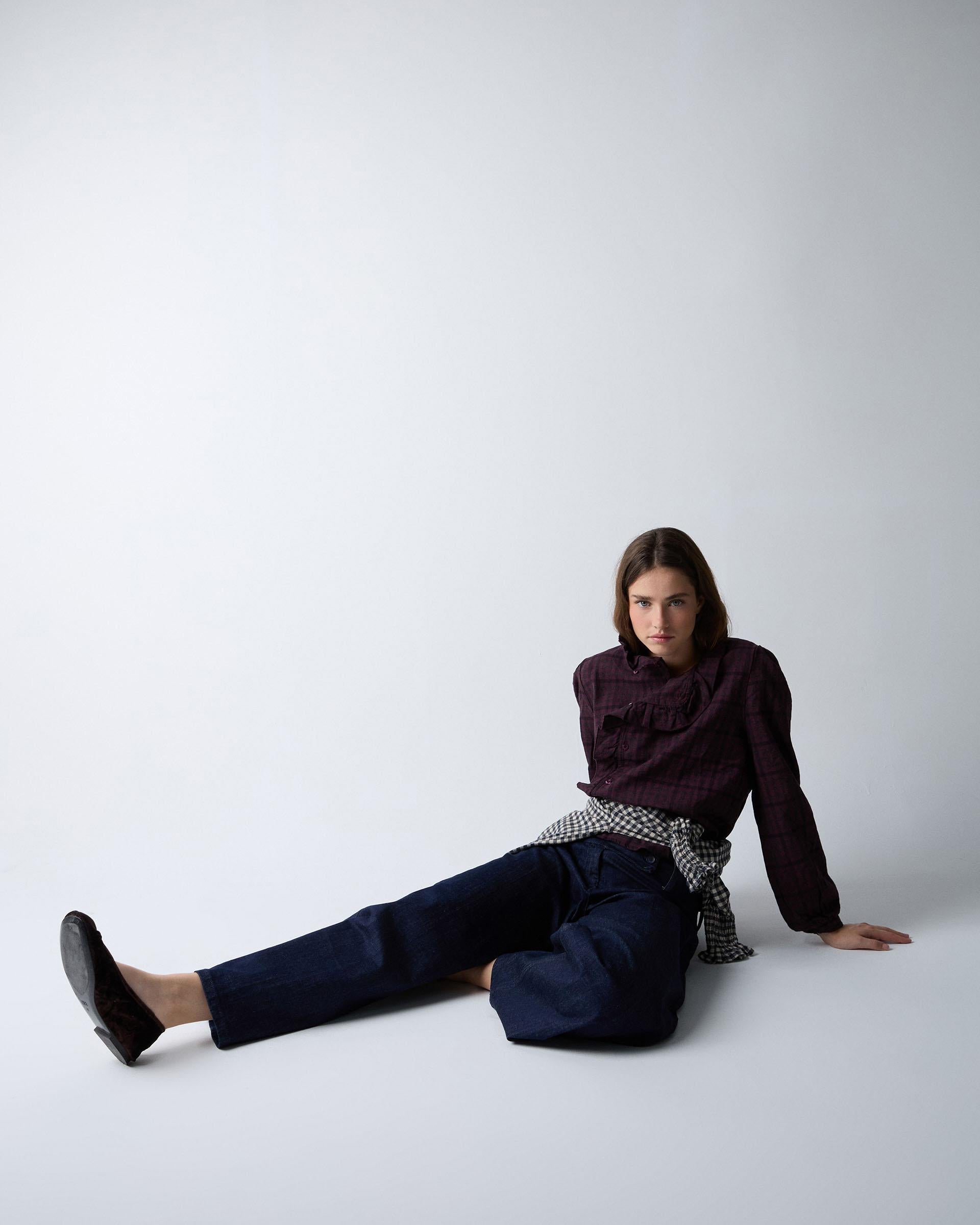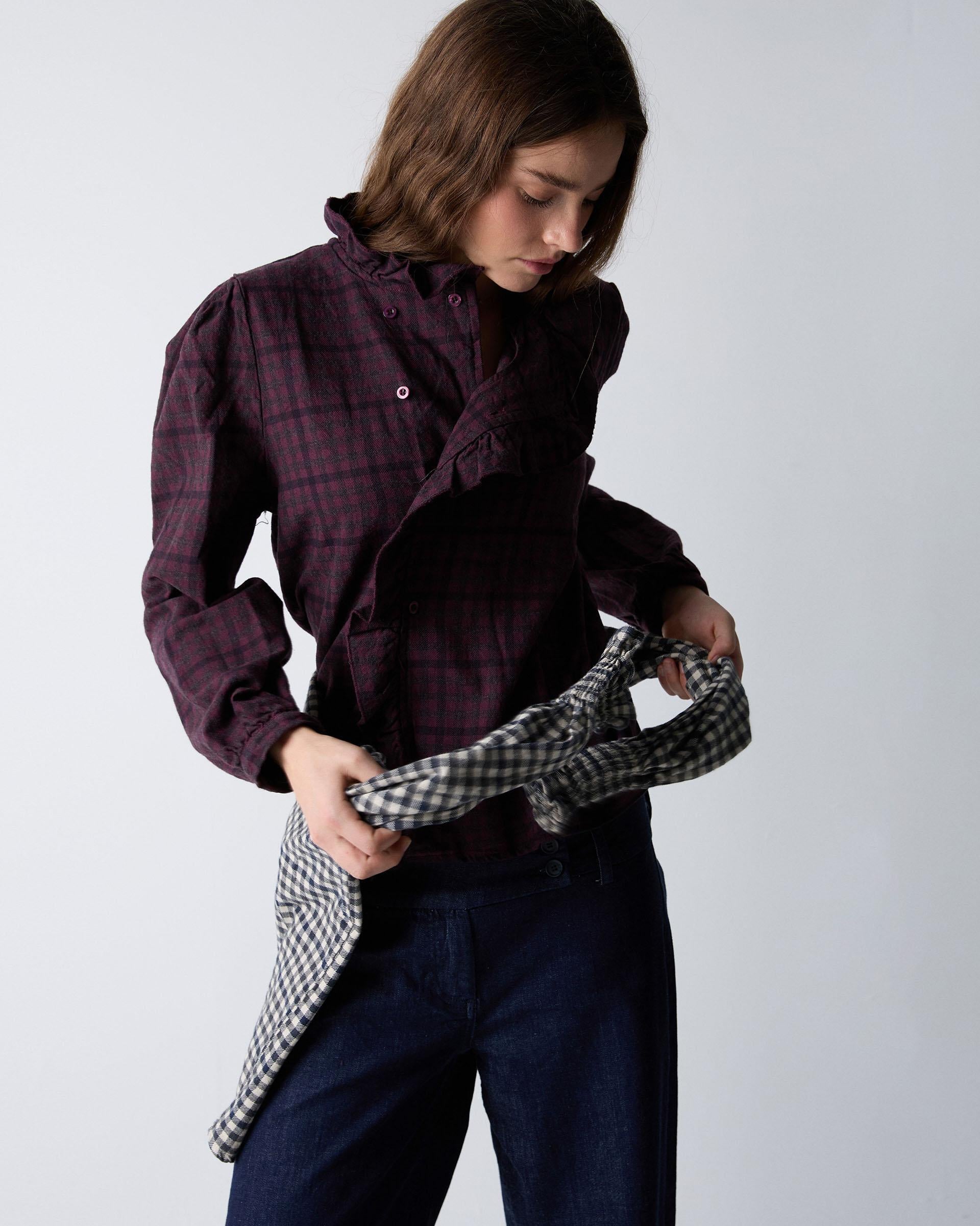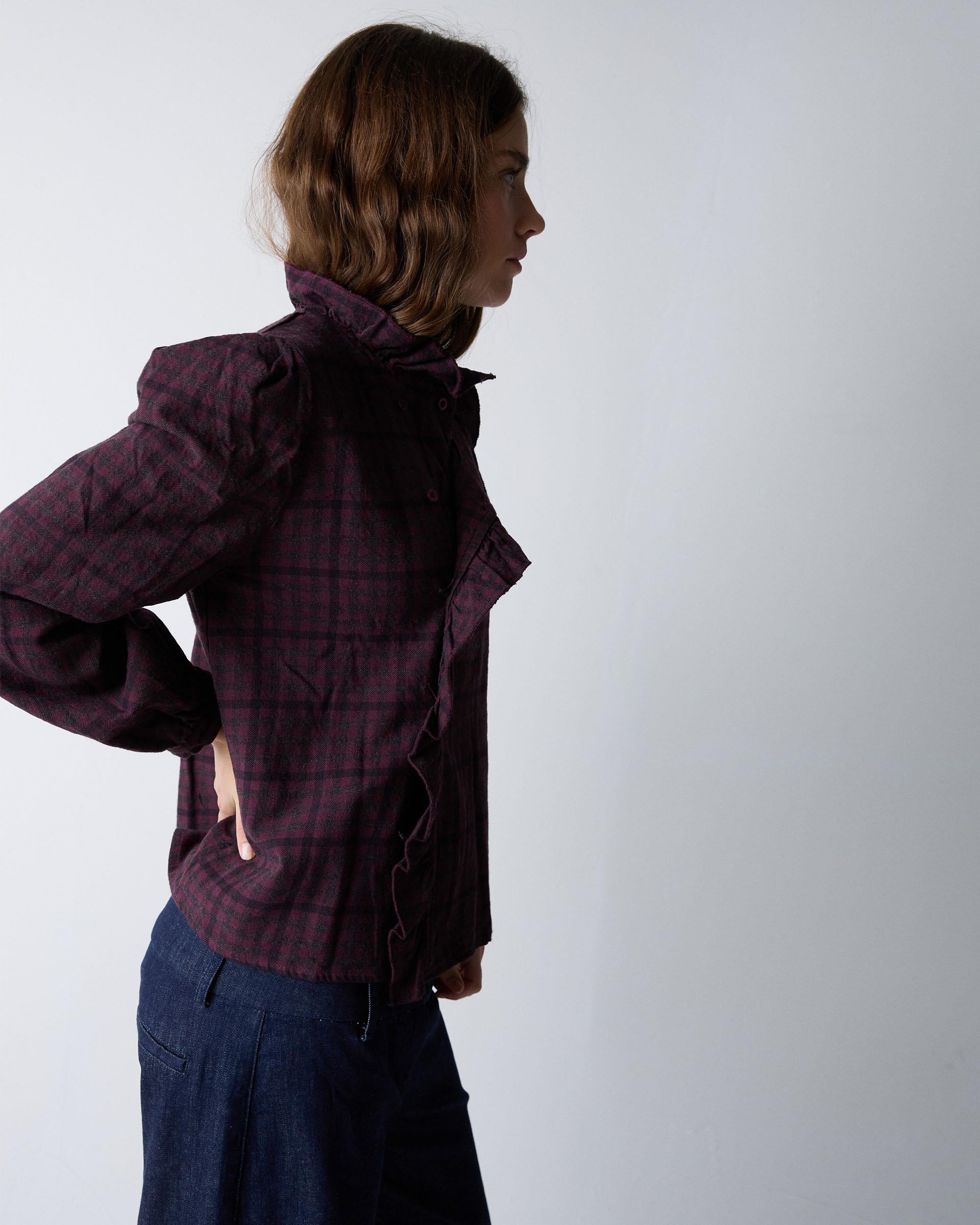 Blusa de manga comprida com estampado xadrez roxo e detalhe de folho no decote e na lateral.