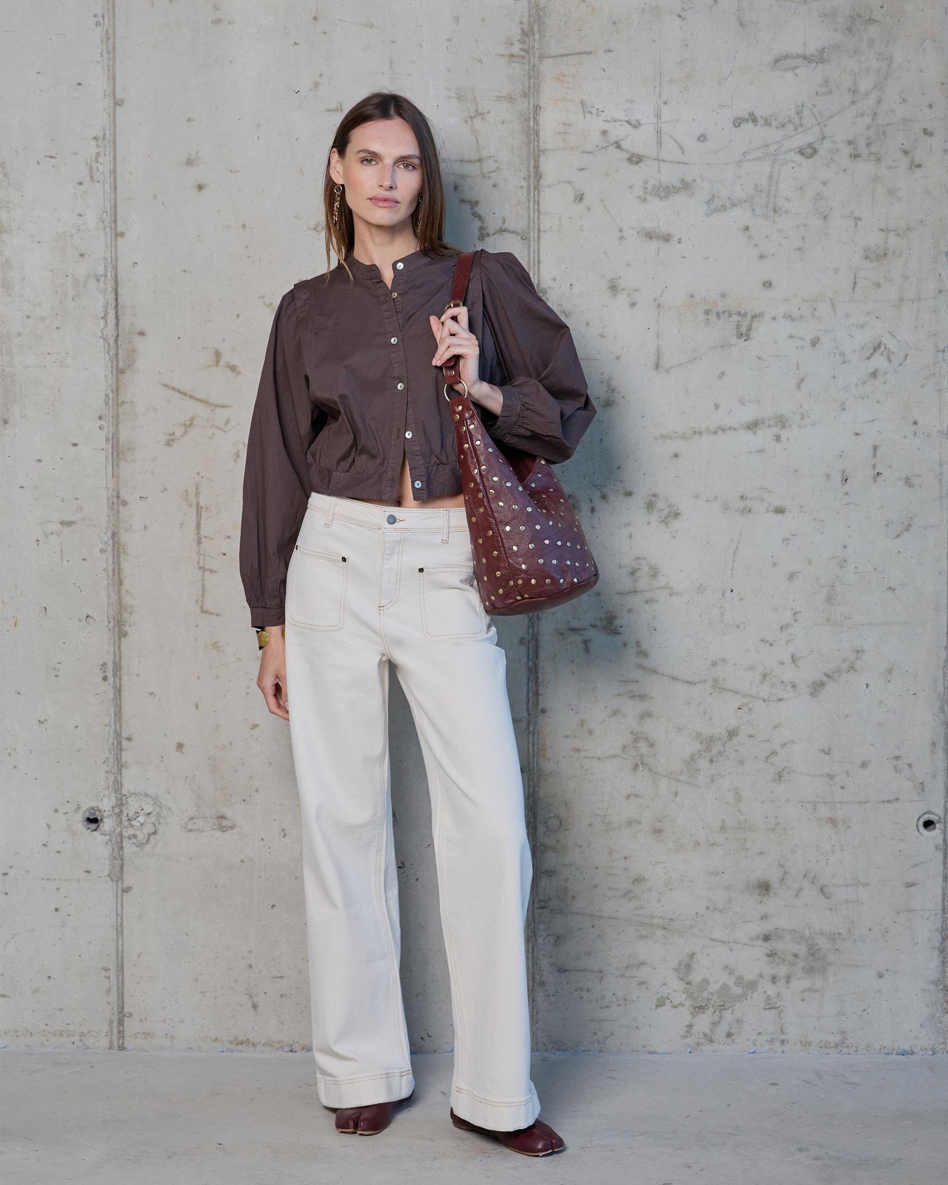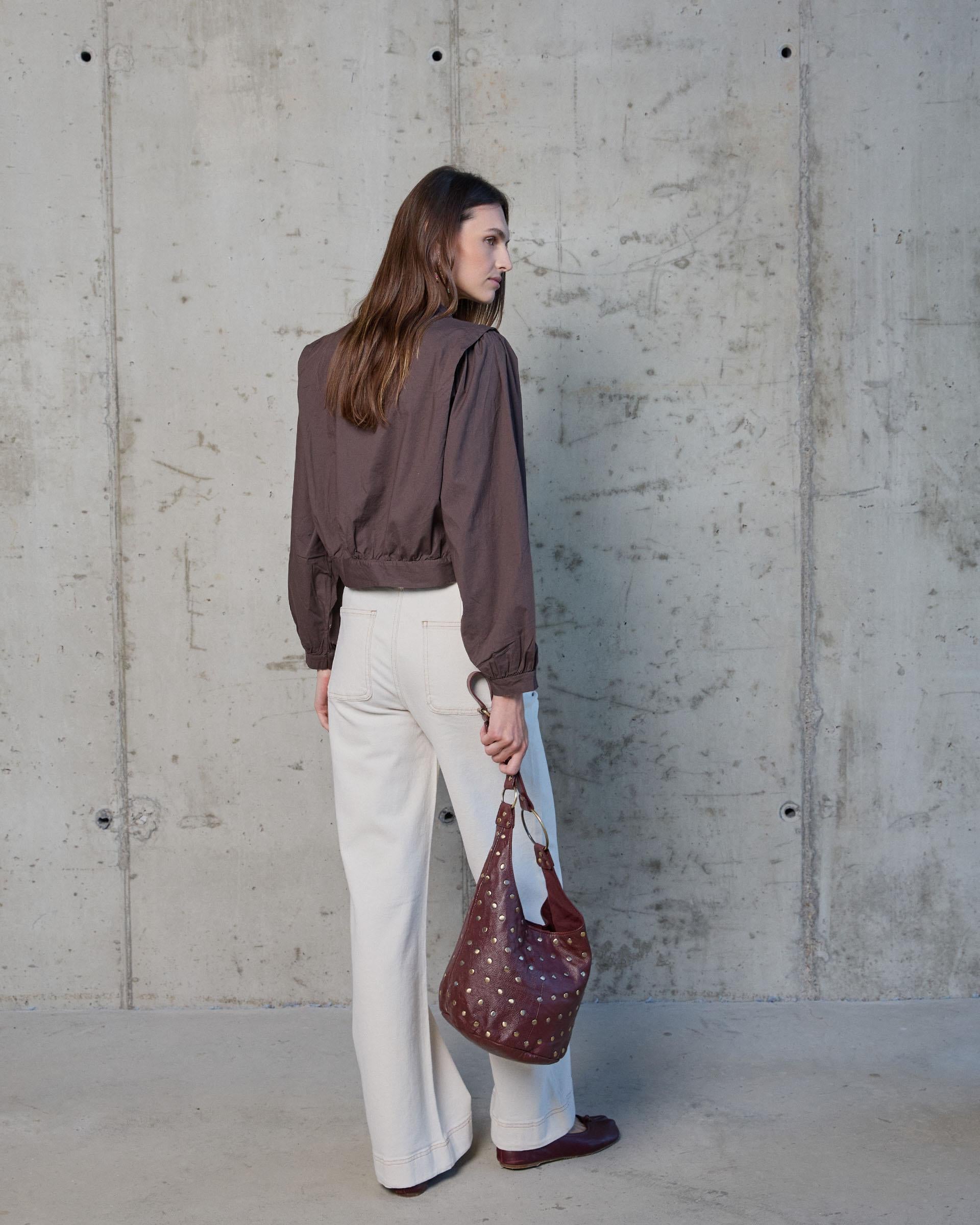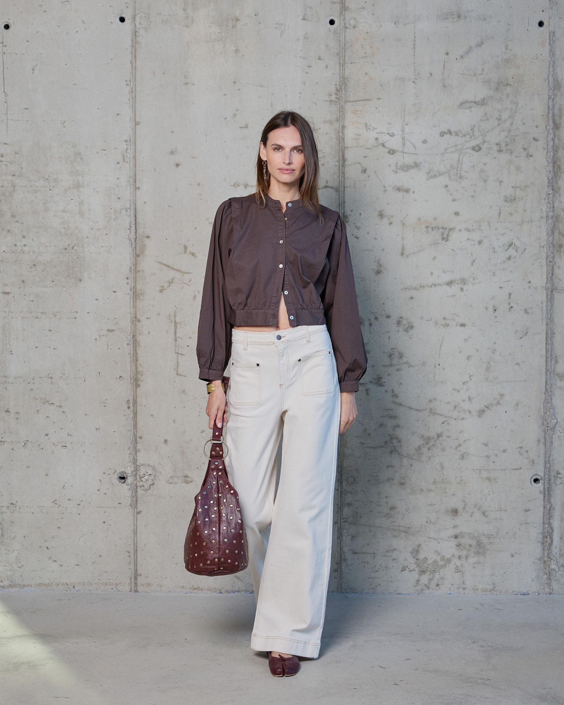 Camisola castanha com gola Mao, detalhe de lapela no ombro e pala na parte inferior.