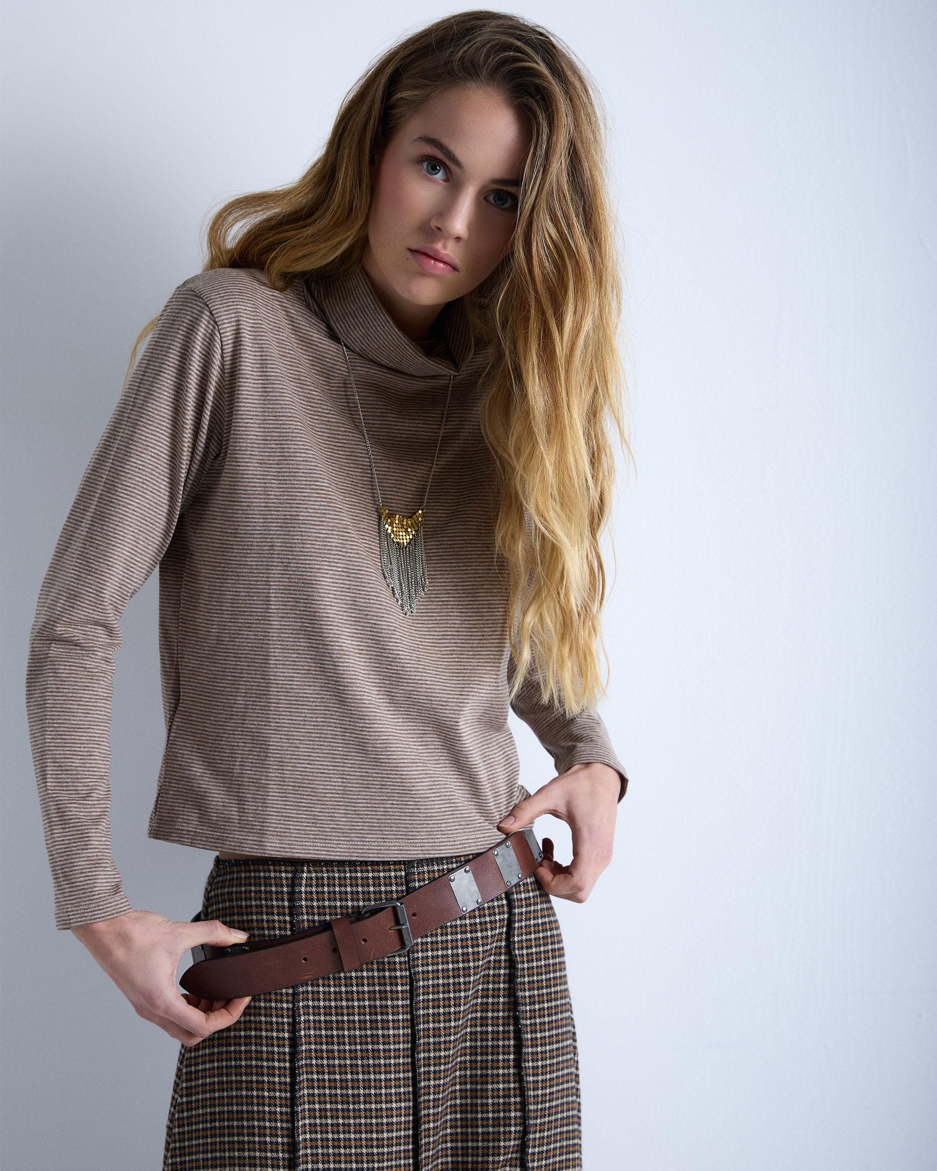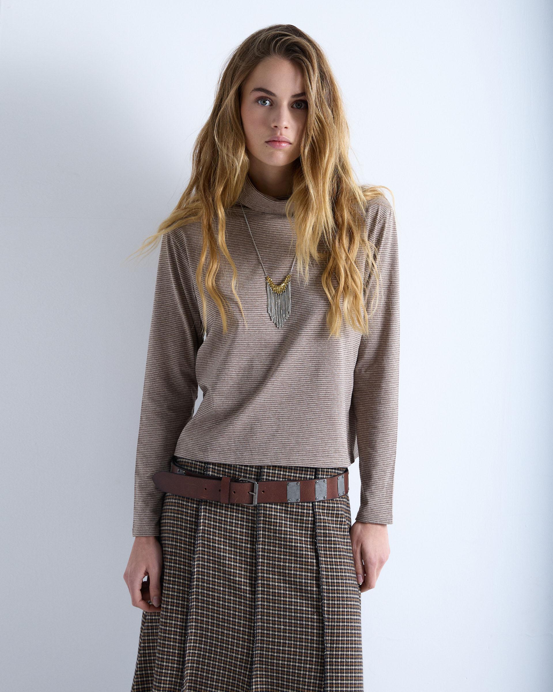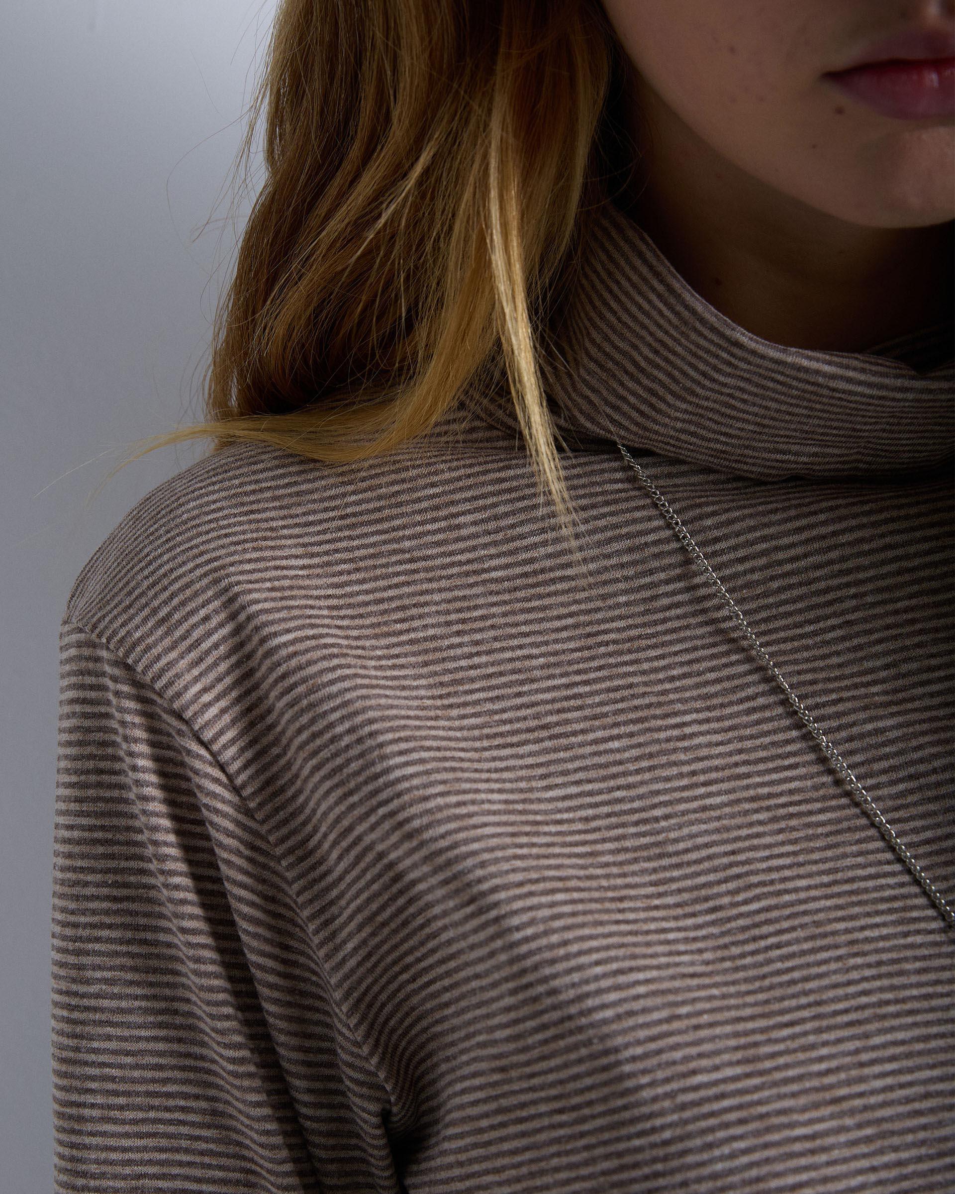 T-shirt de gola alta e manga comprida, às riscas em tons de castanho e bege.