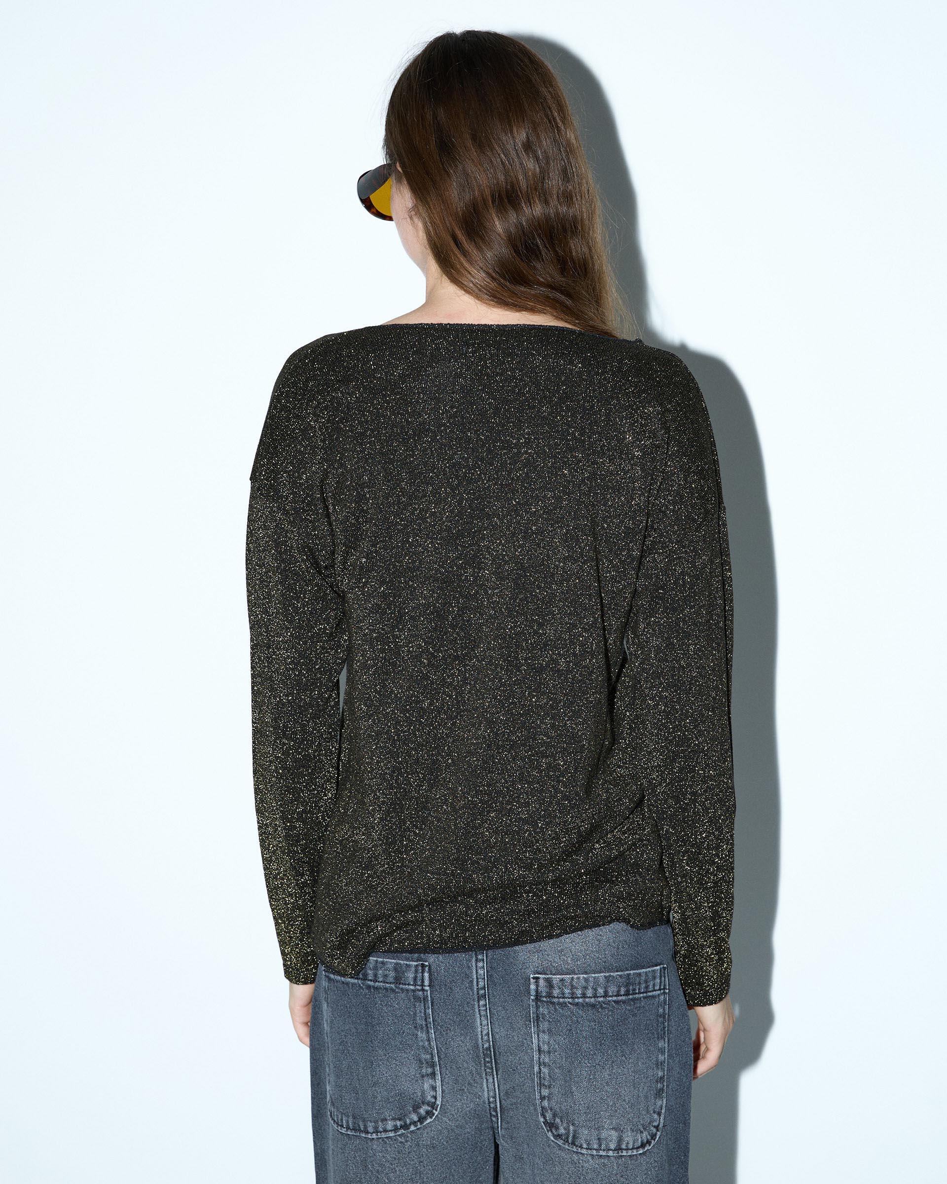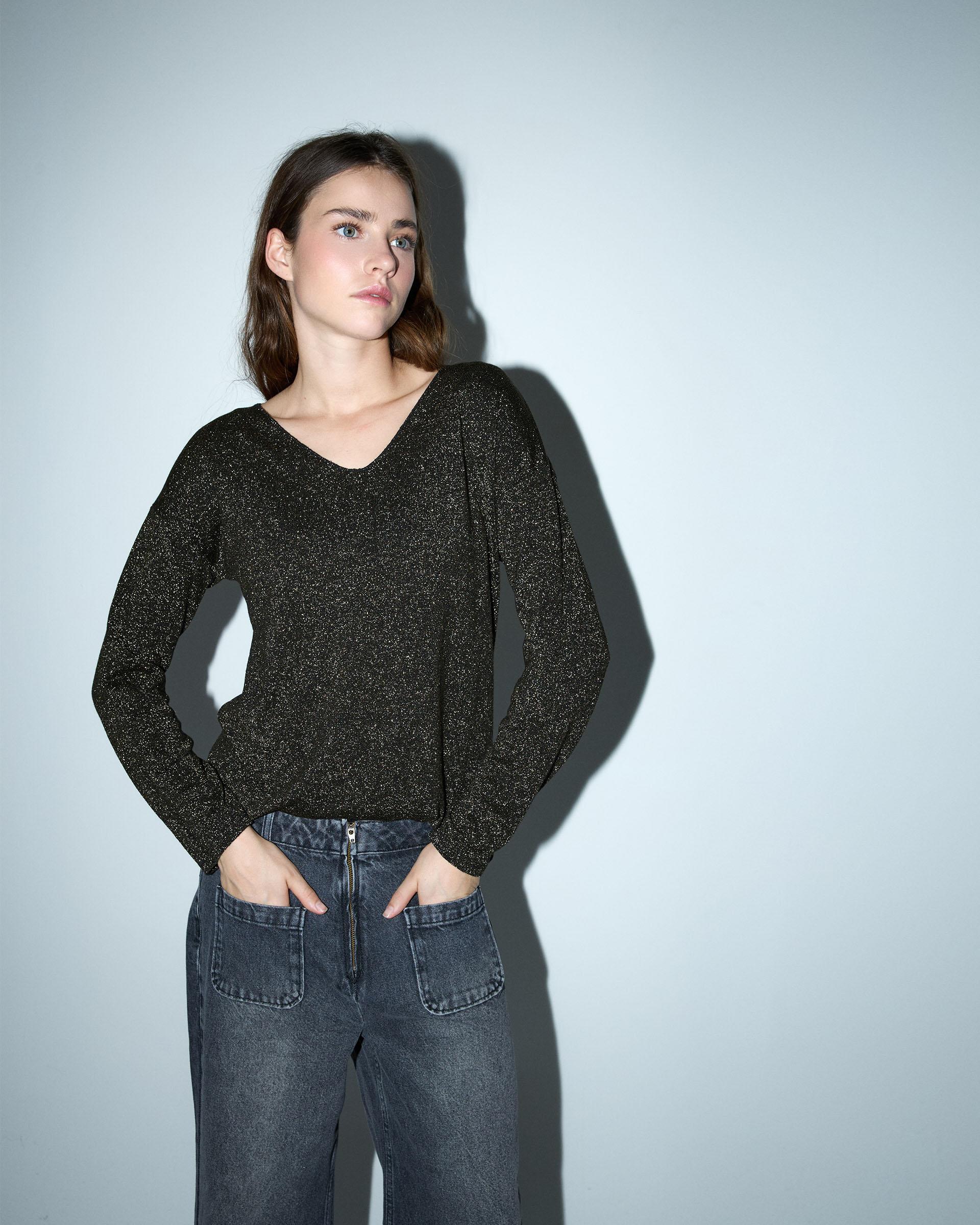 T-shirt de manga comprida com decote em V, em preto com detalhes em lurex.