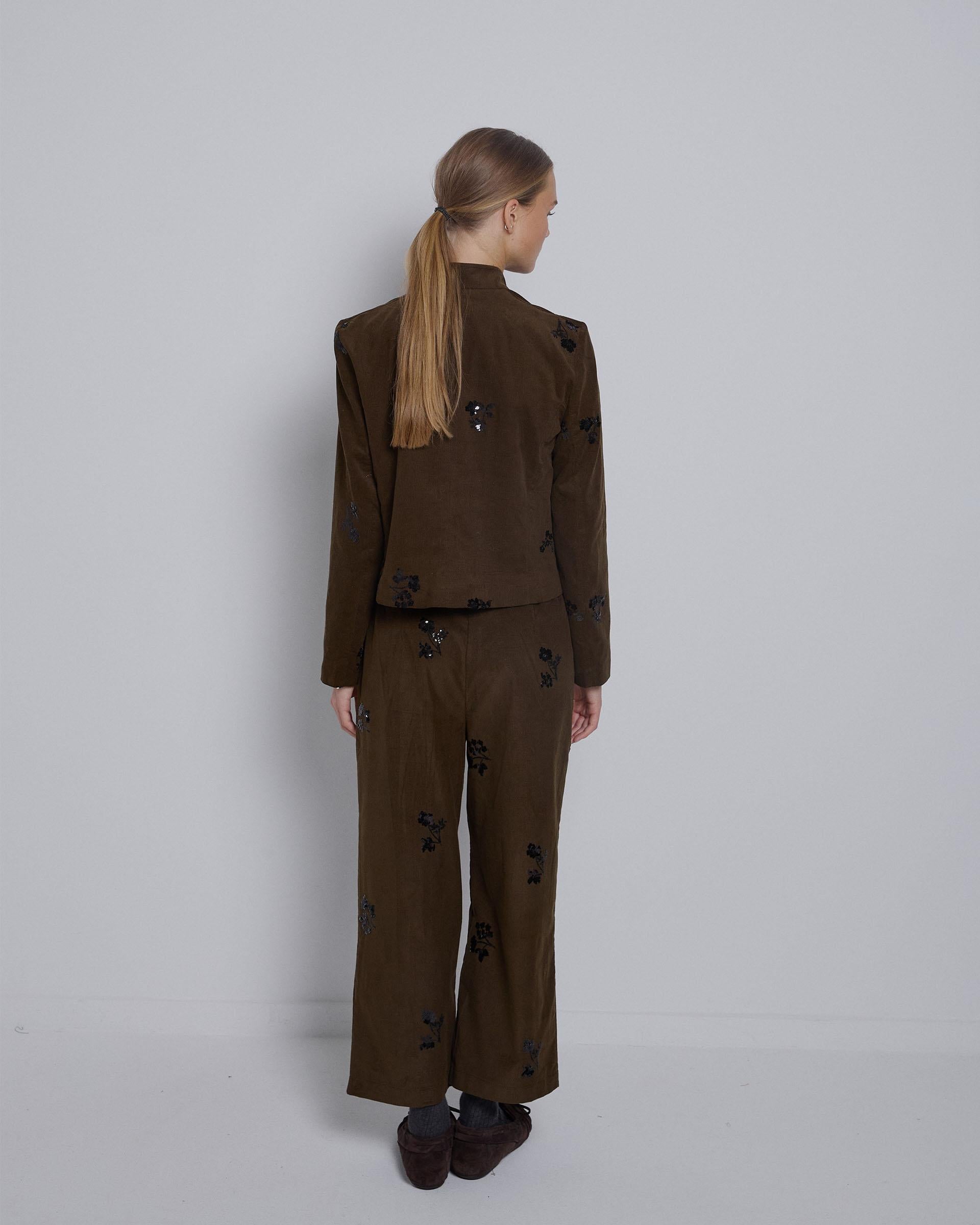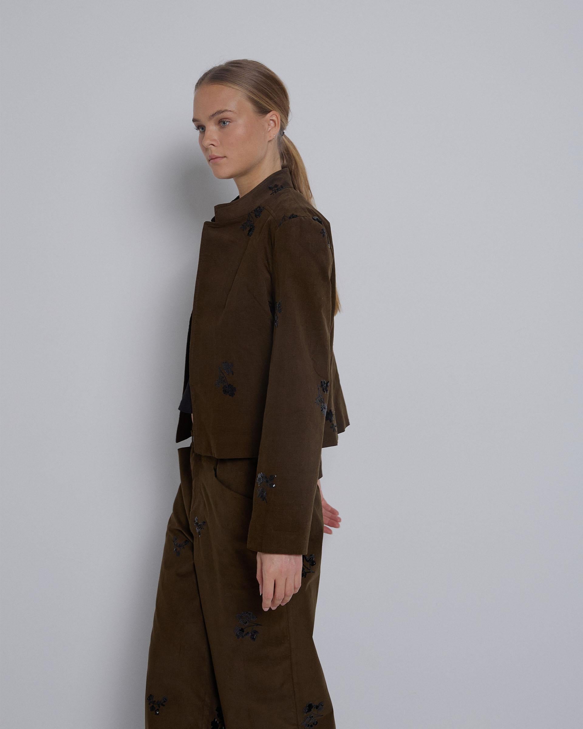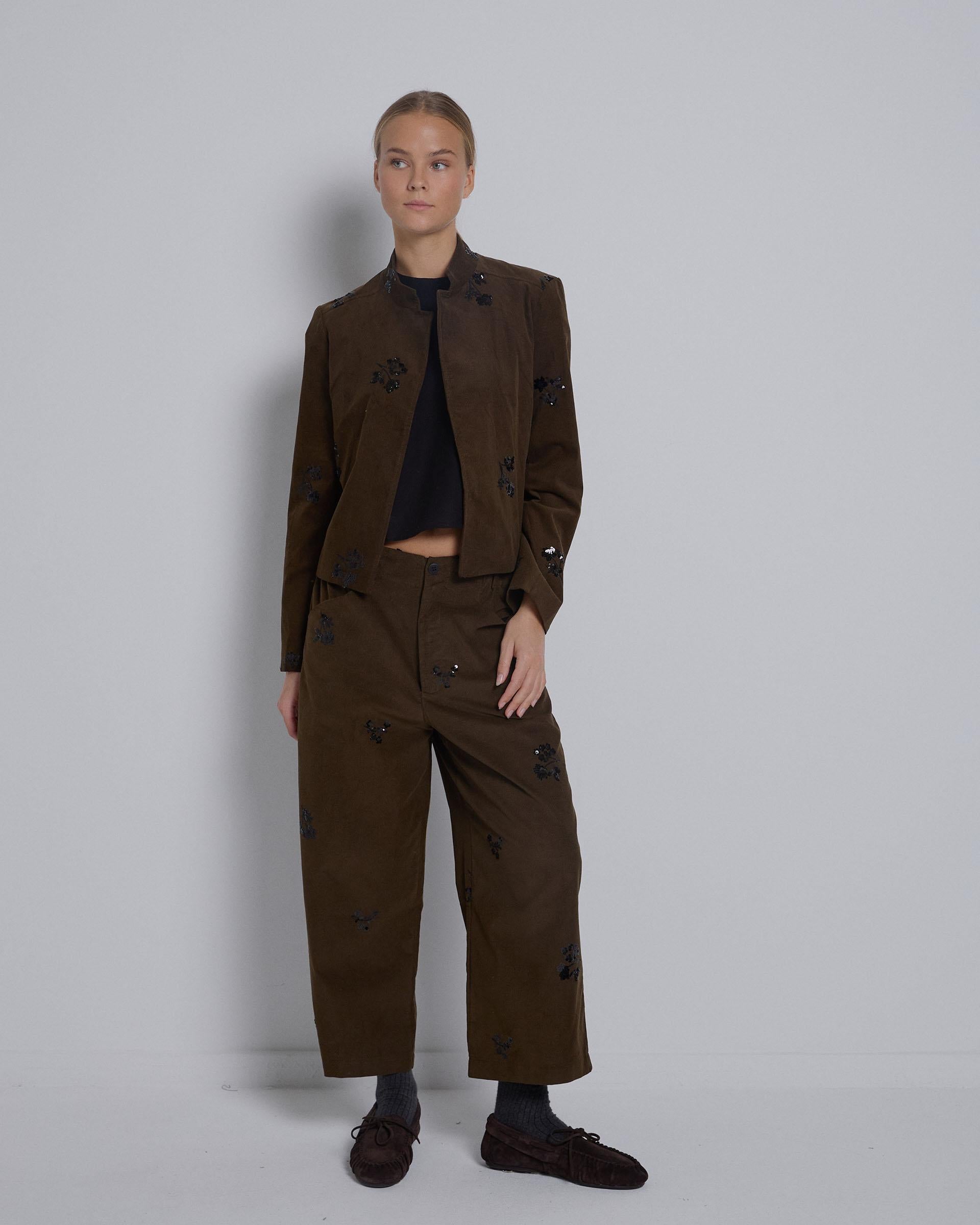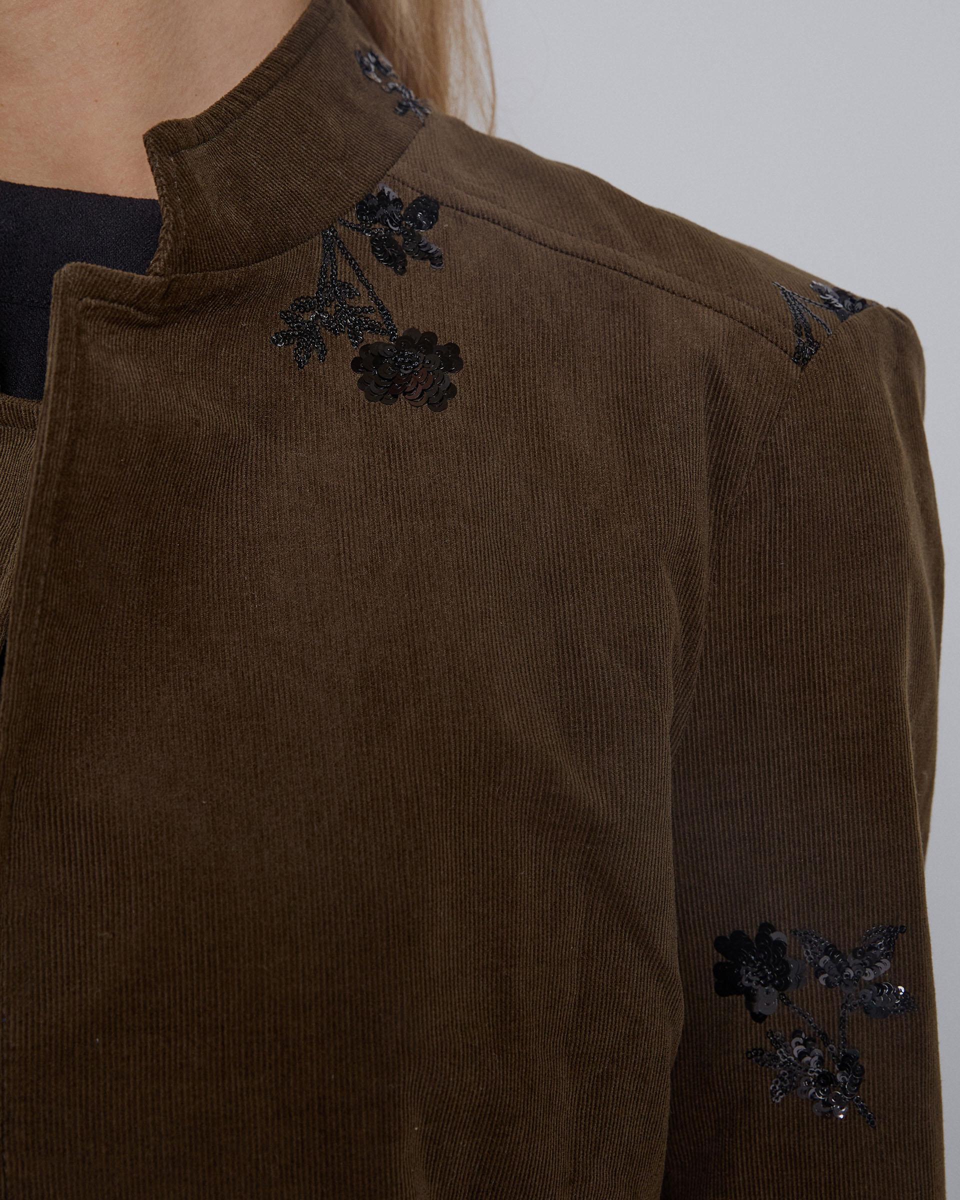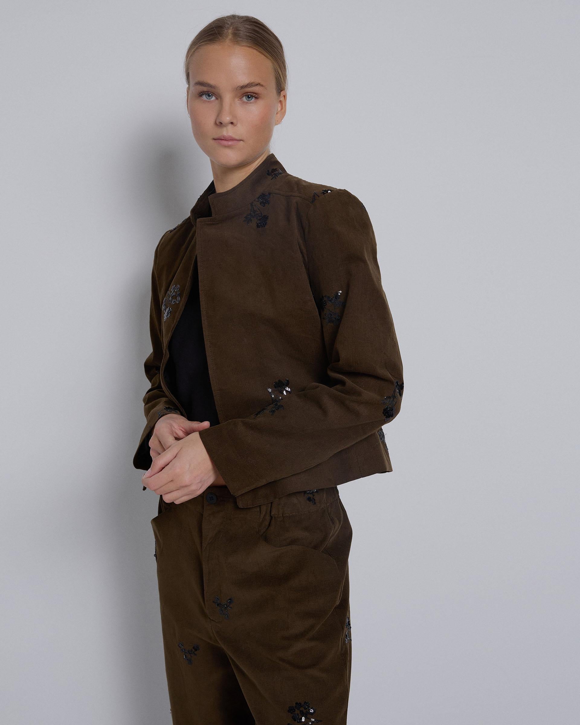 Blazer de bombazine verde escuro com detalhes florais de lantejoulas, gola mandarim levantada e sem fecho.