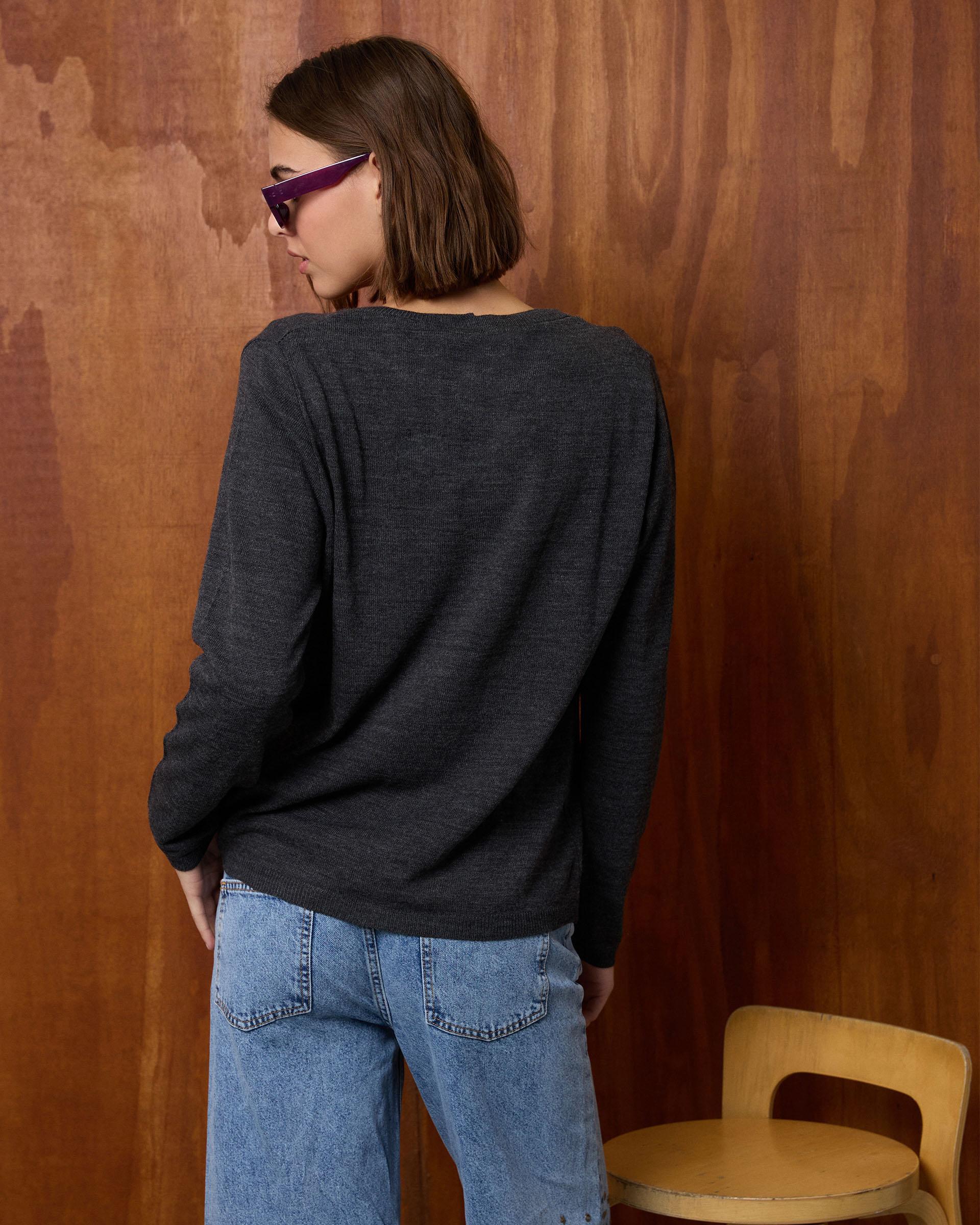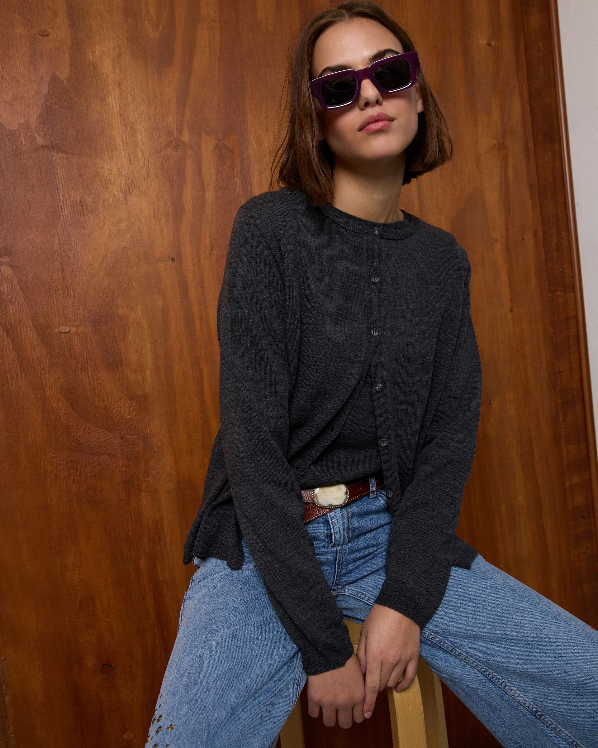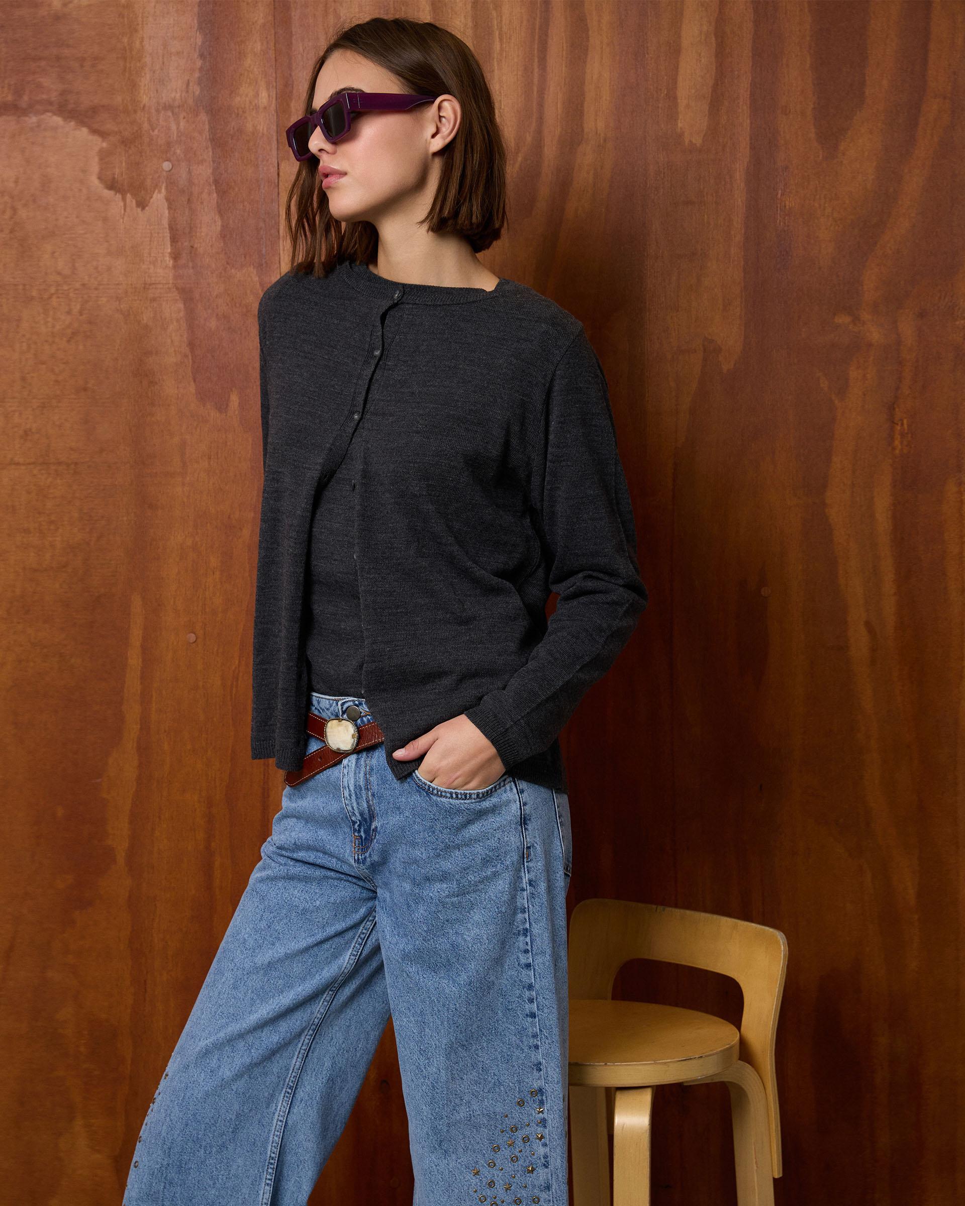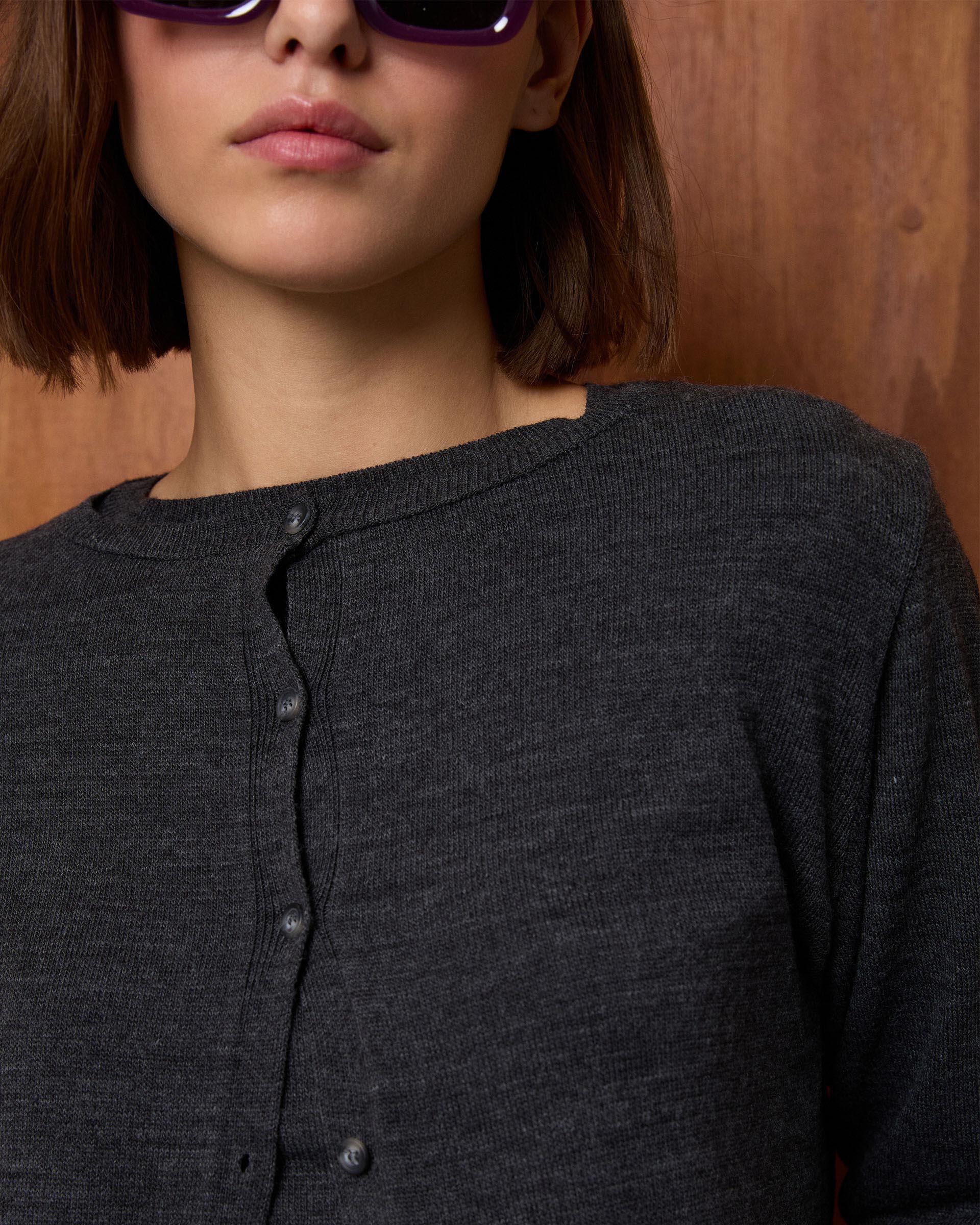 Casaco de malha fina na cor antracite, com gola redonda e botões em madrepérola.