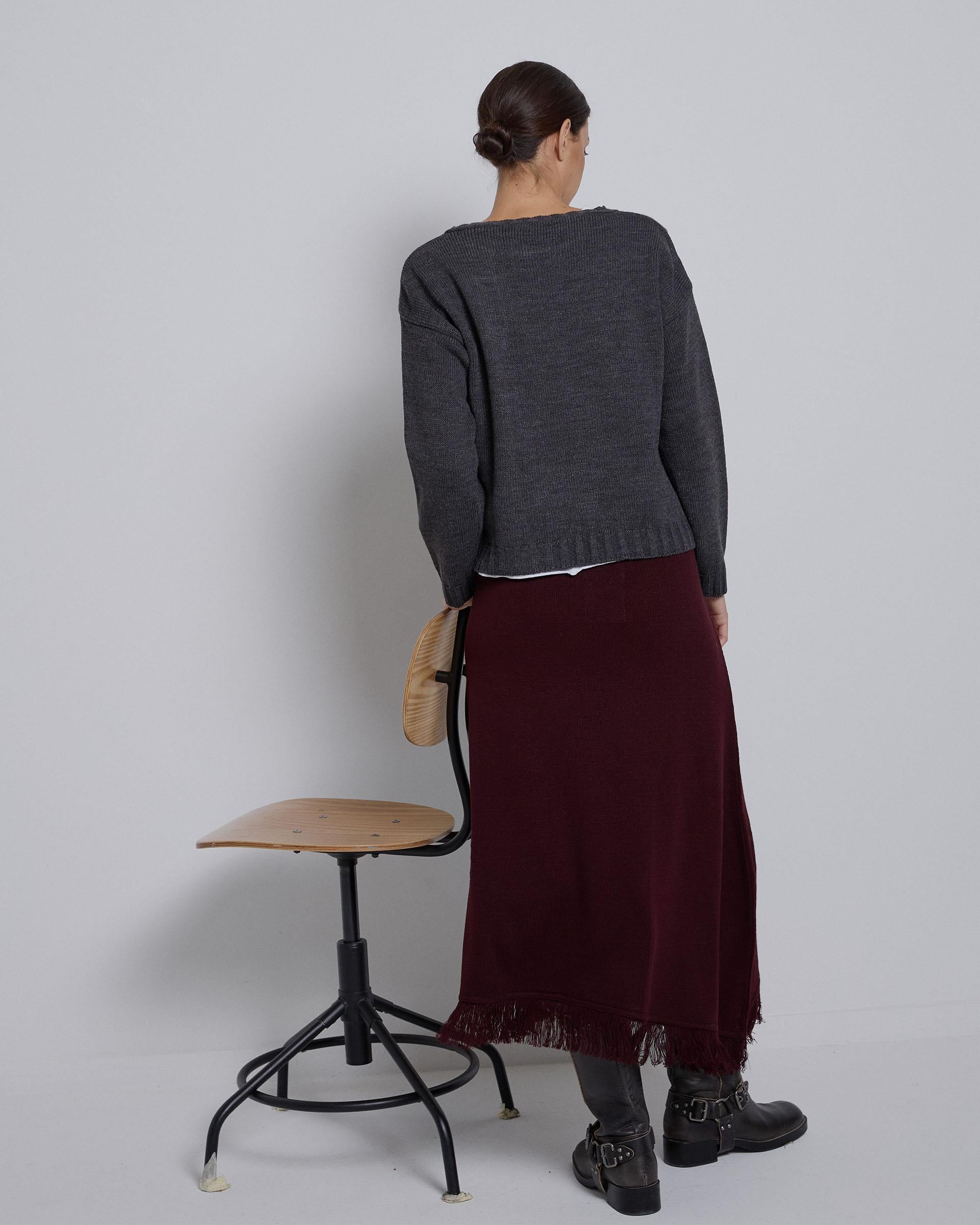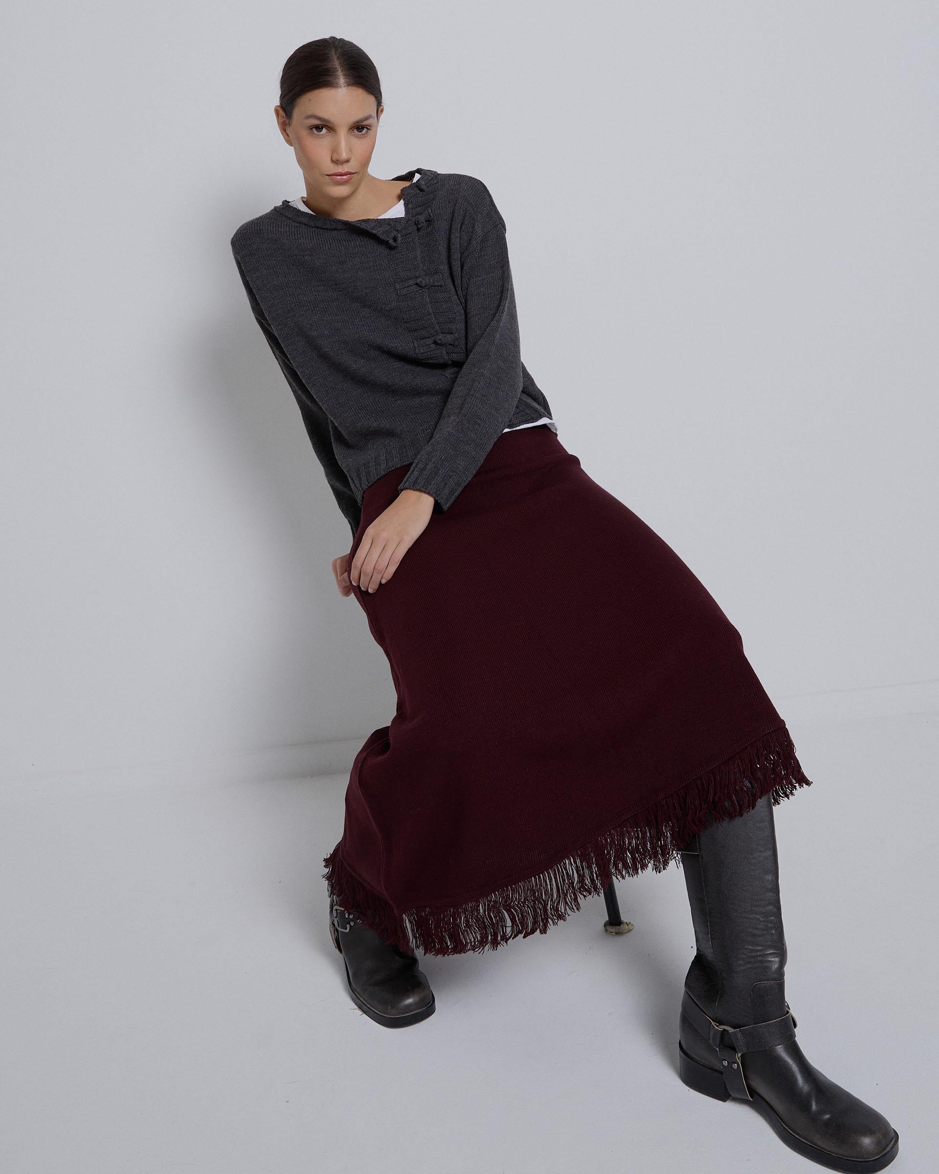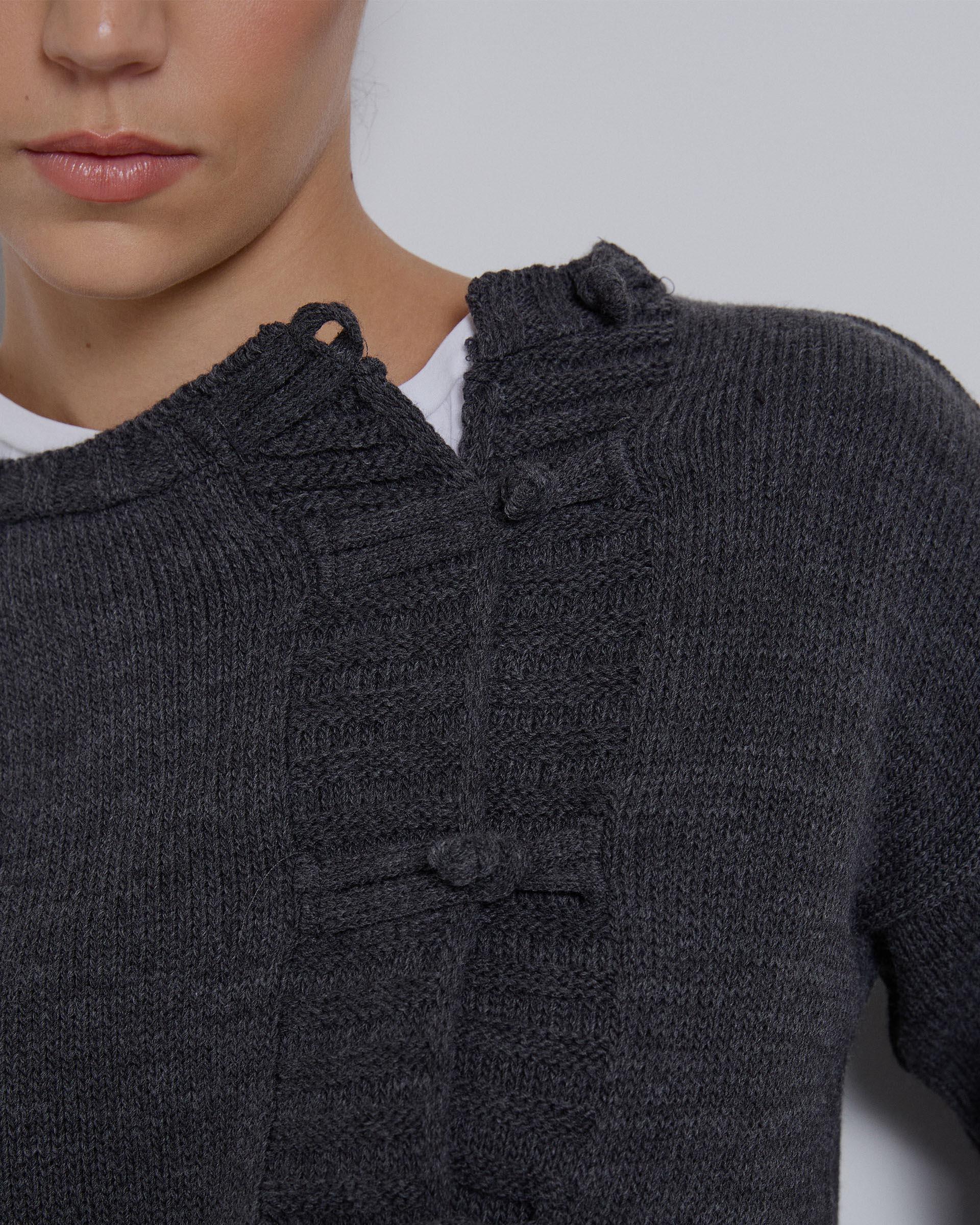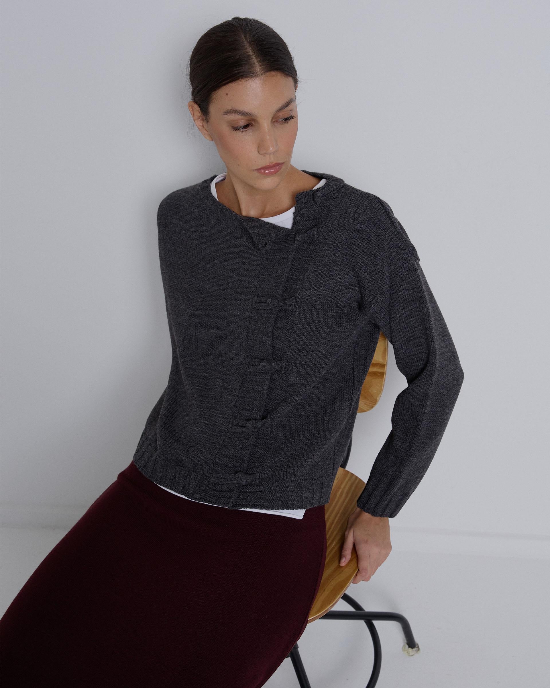 Casaco de malha na cor antracite com detalhe de botão estilo japonês na lateral.