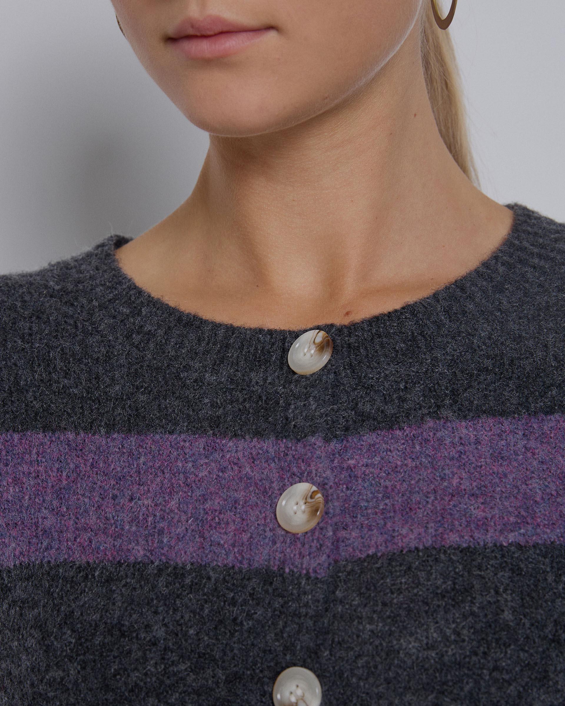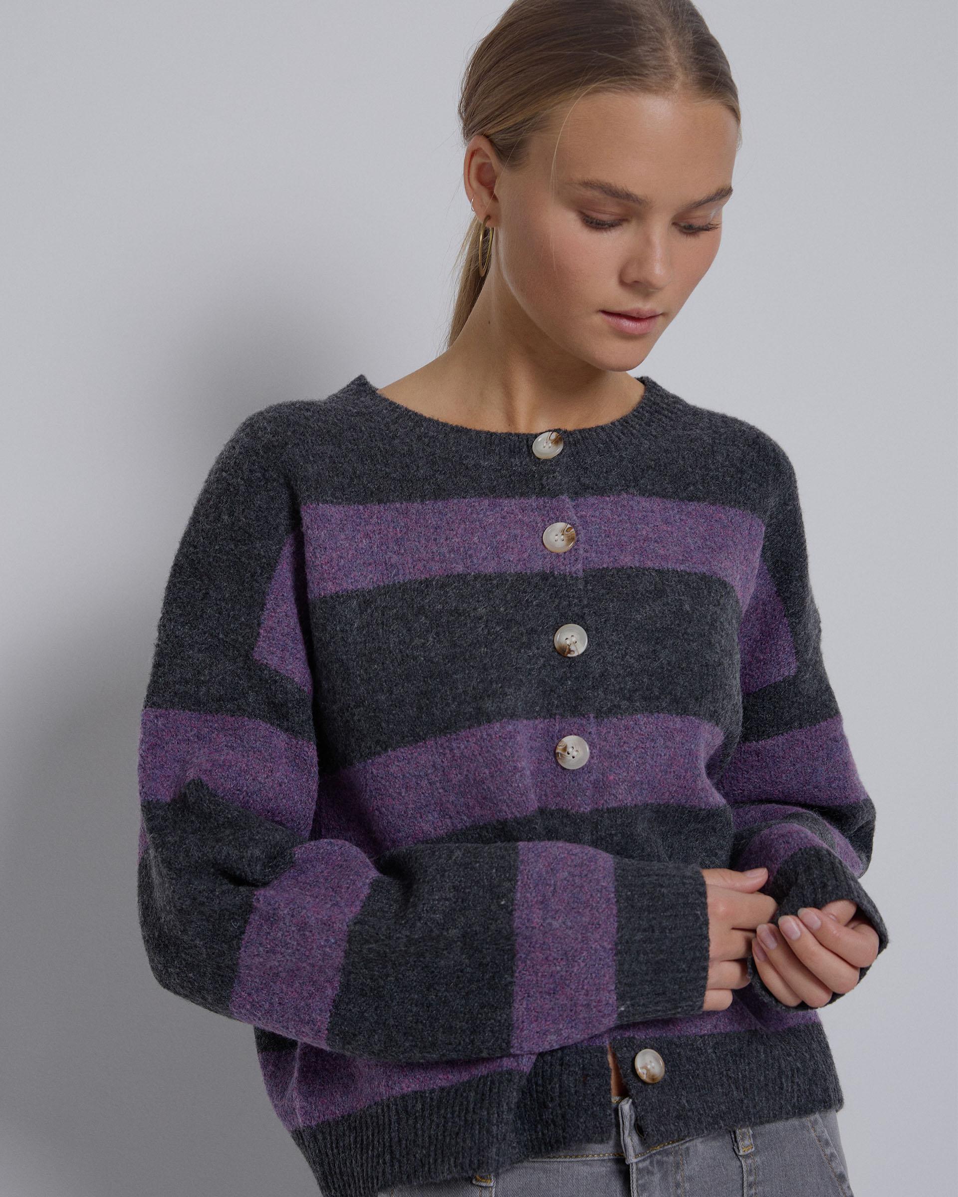 Casaco de malha às riscas em tons de cinza com gola redonda e botões na frente.
