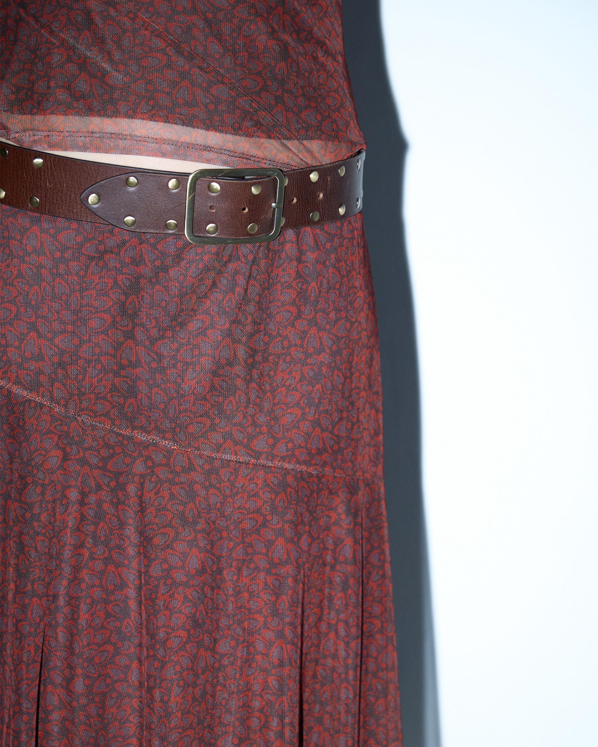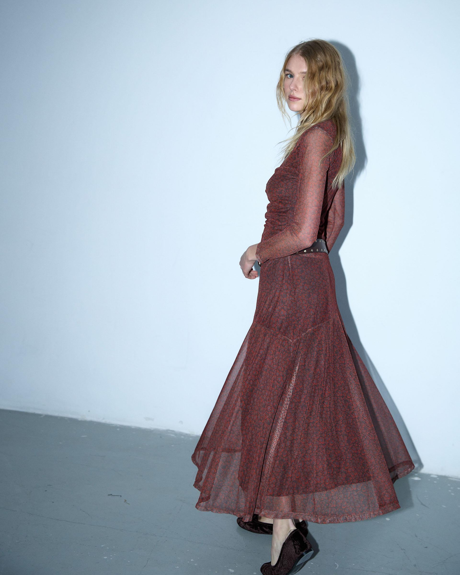 Falda larga de tul con goma en cinturilla y estampado floral de color marrón.