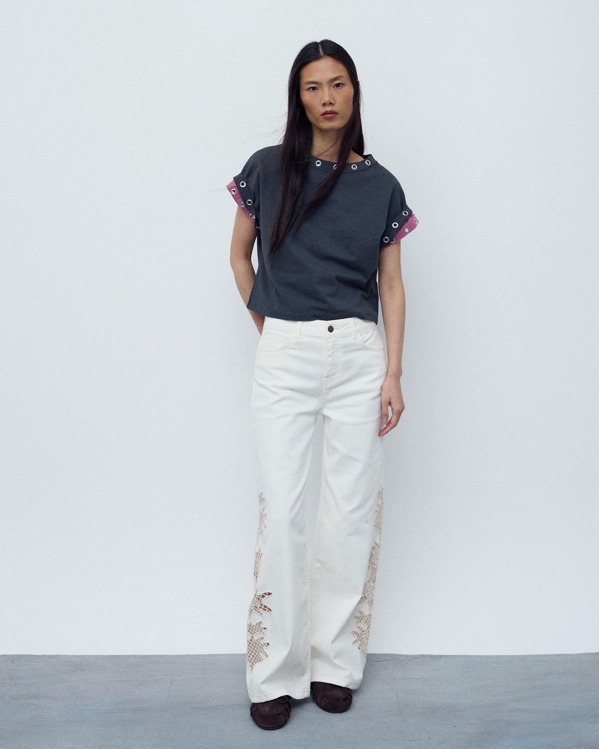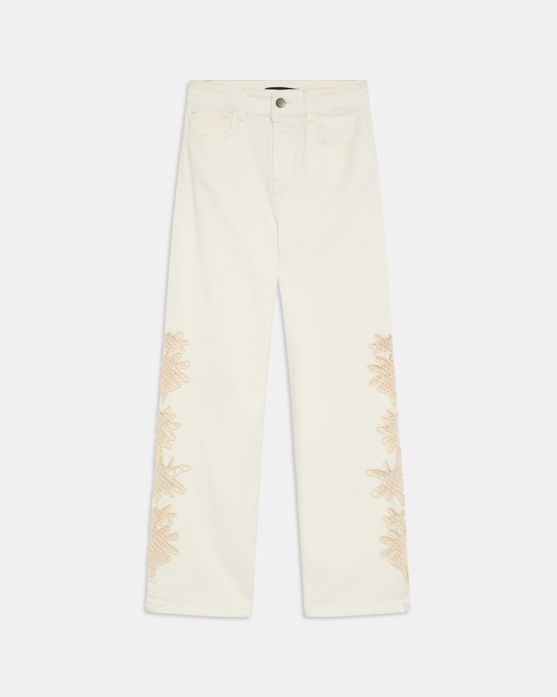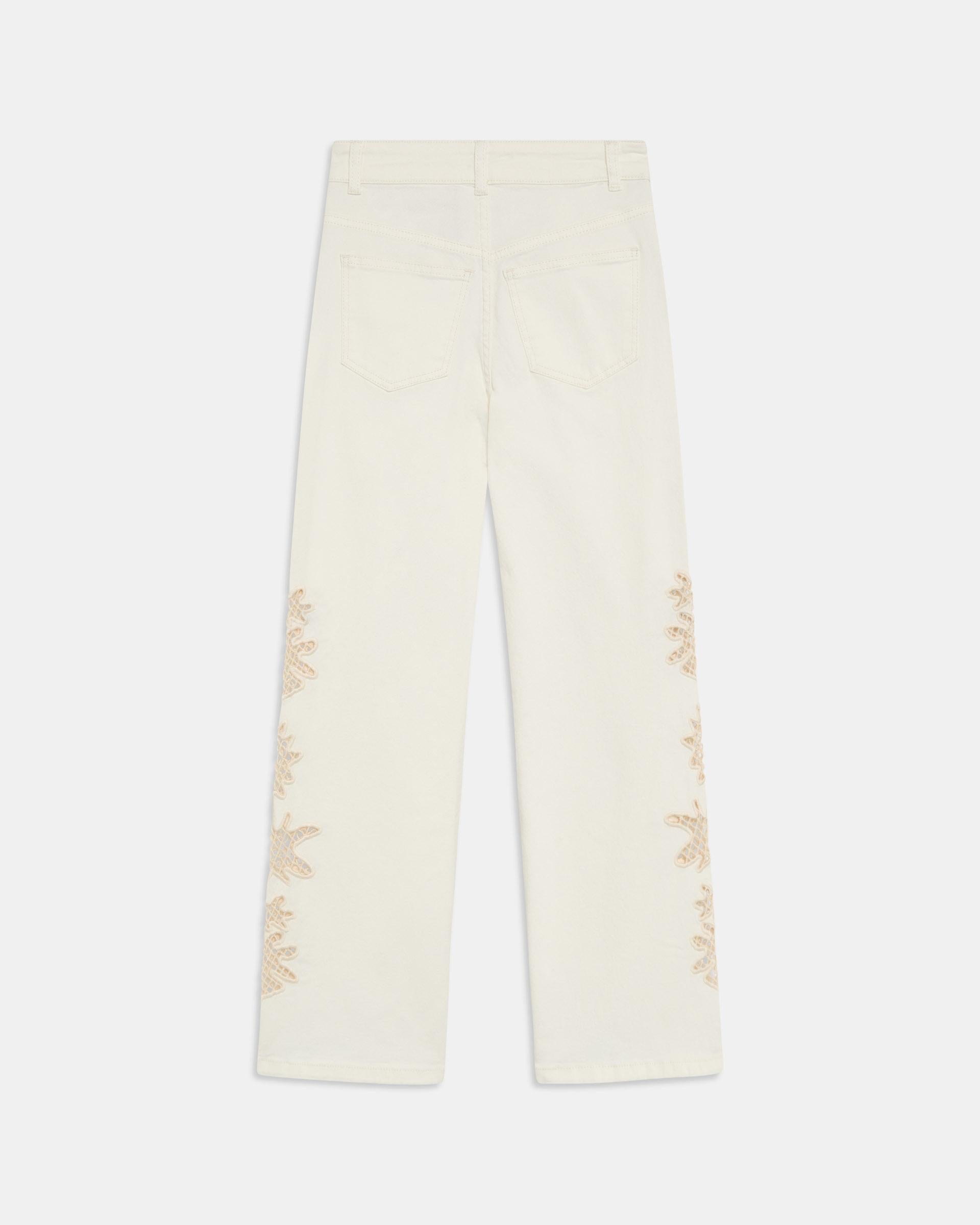Calça branca estilo ganga com detalhe em crochet nas laterais e fecho com zíper e botão.