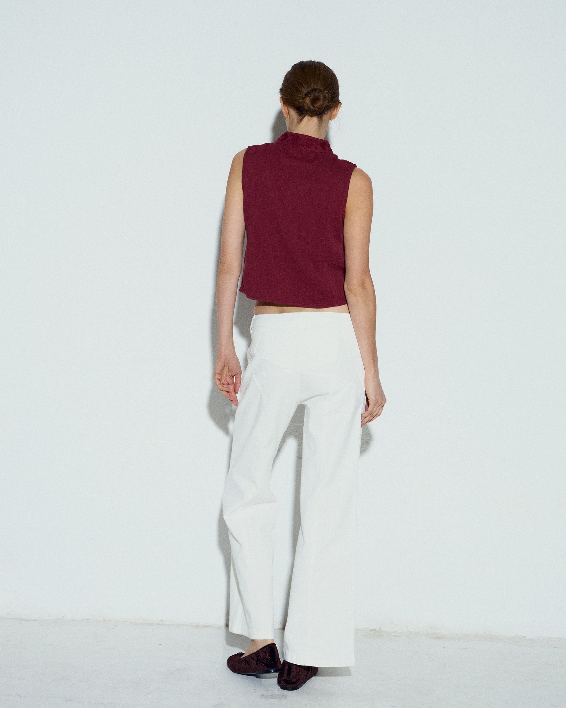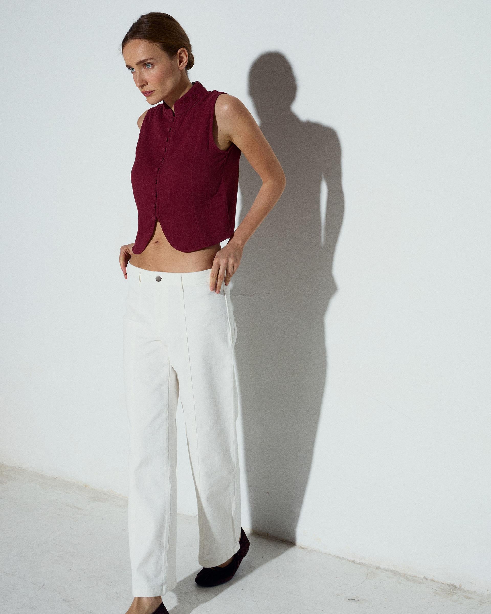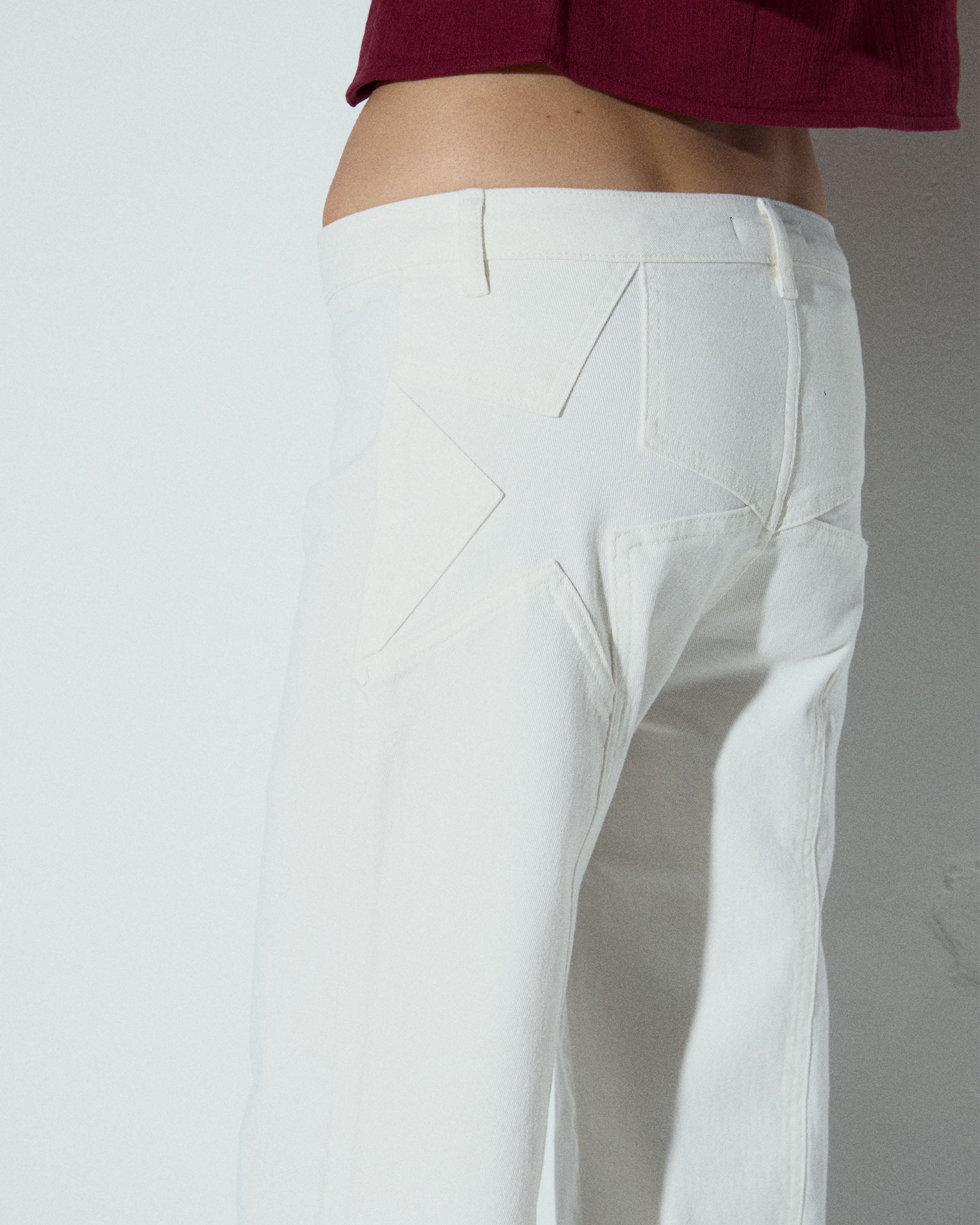 Calça jeans com detalhe de estrela nas costas e costuras na frente, na cor branca.