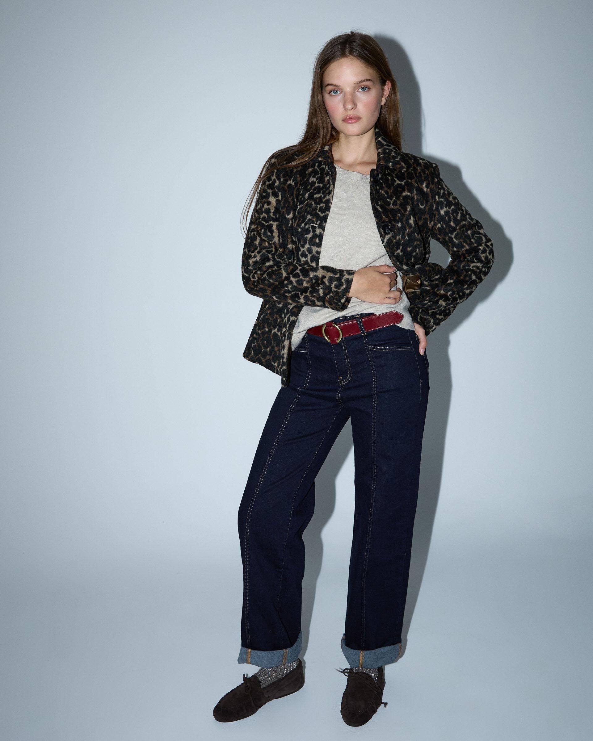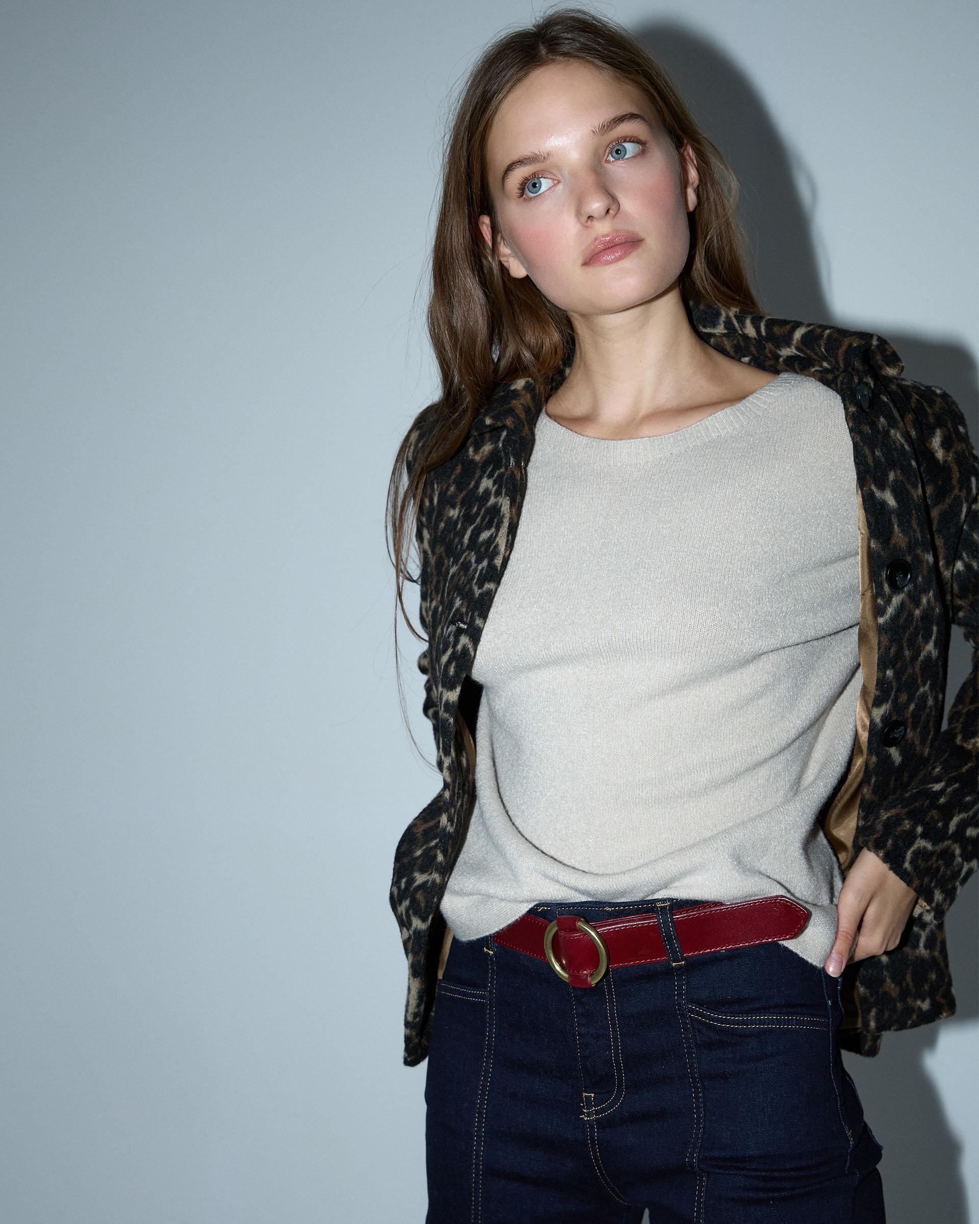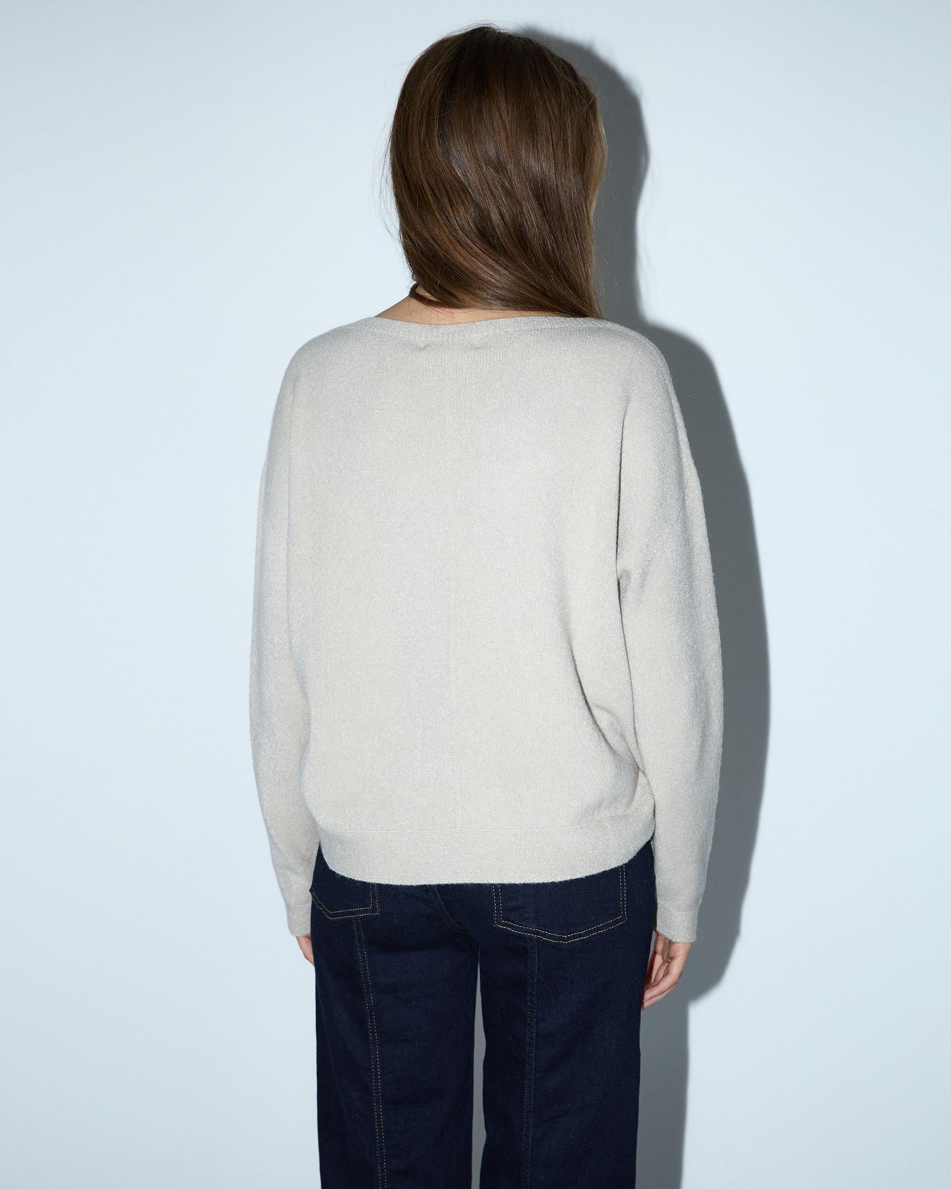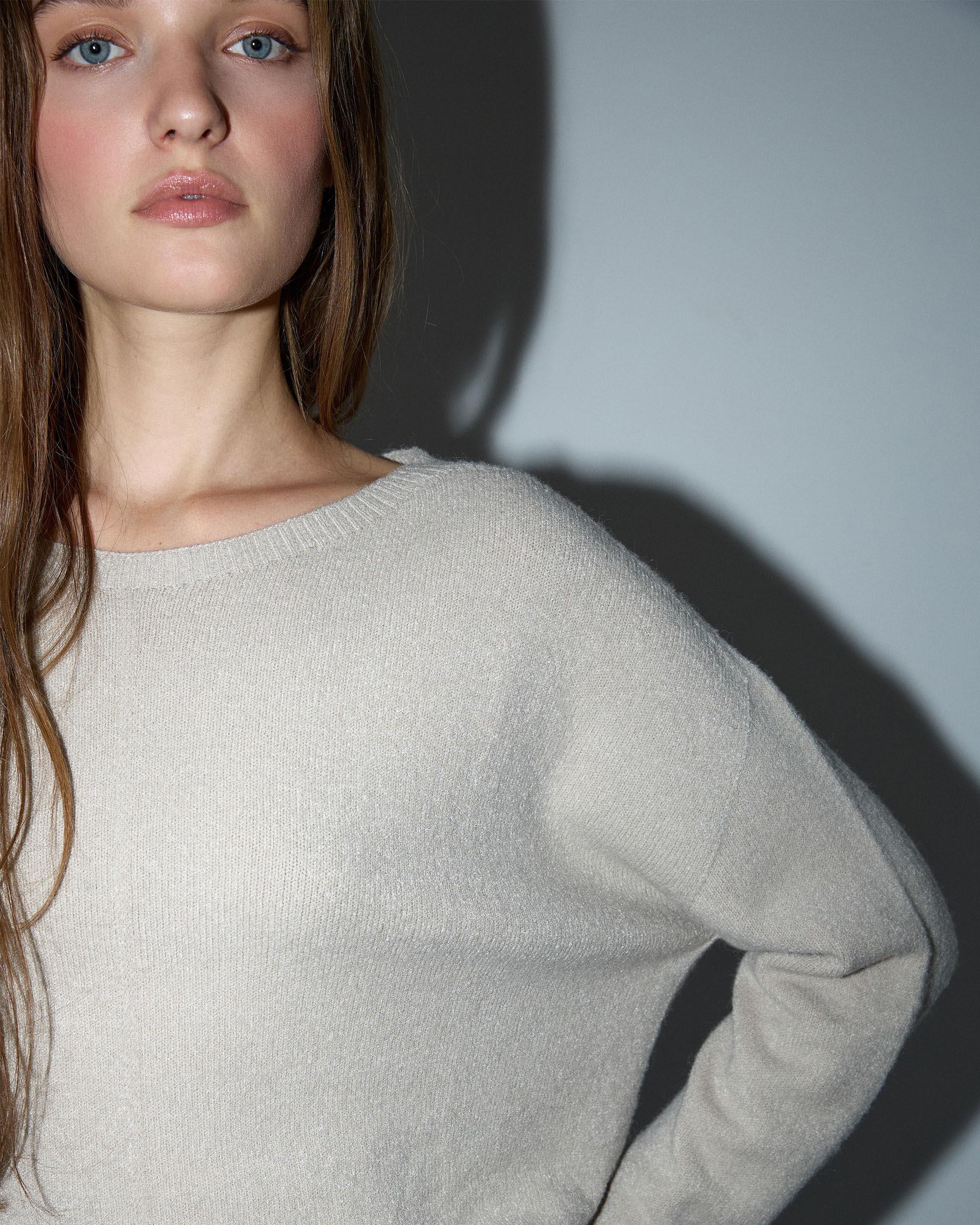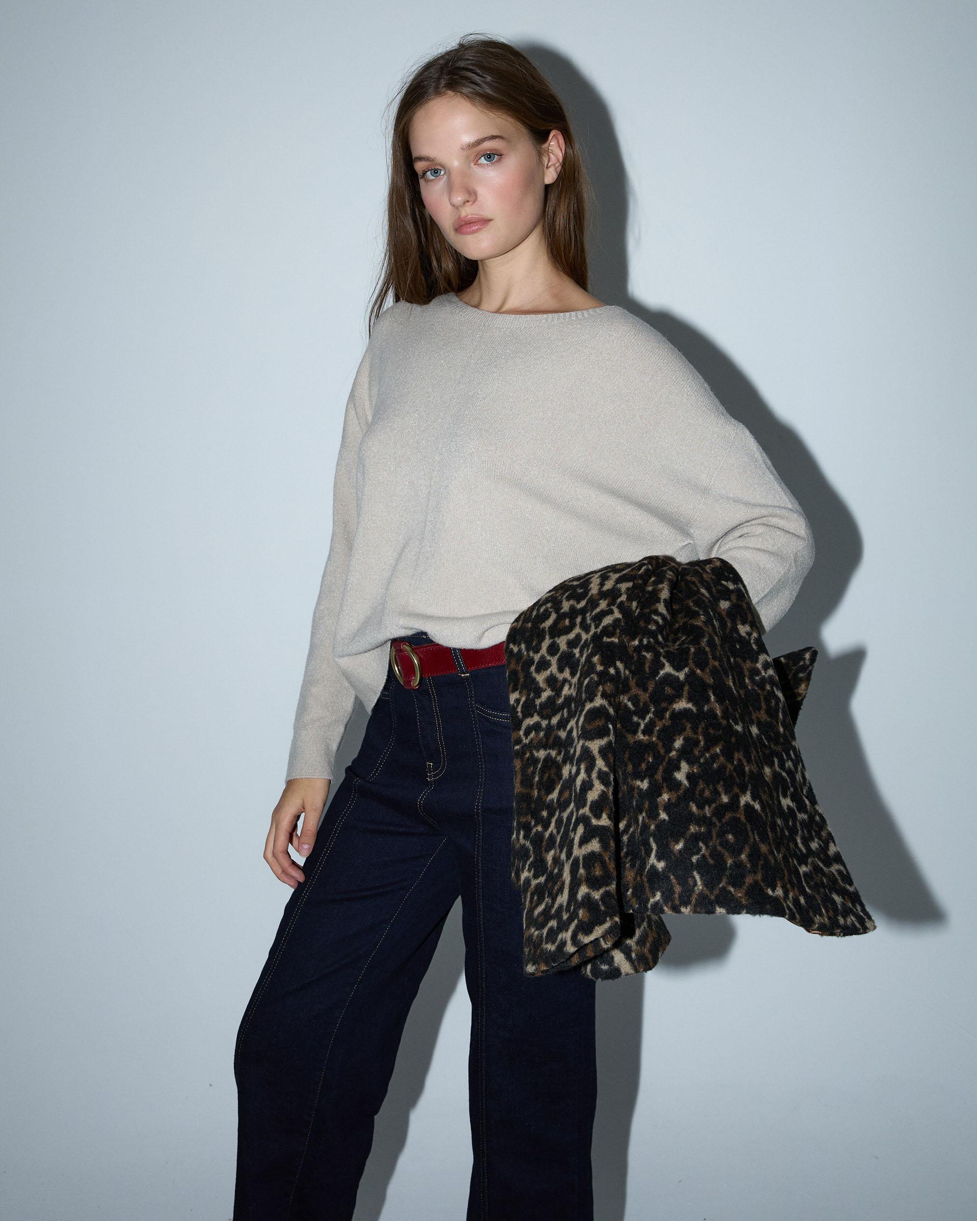 Camisola de malha bege com gola redonda e detalhe de nervura central.