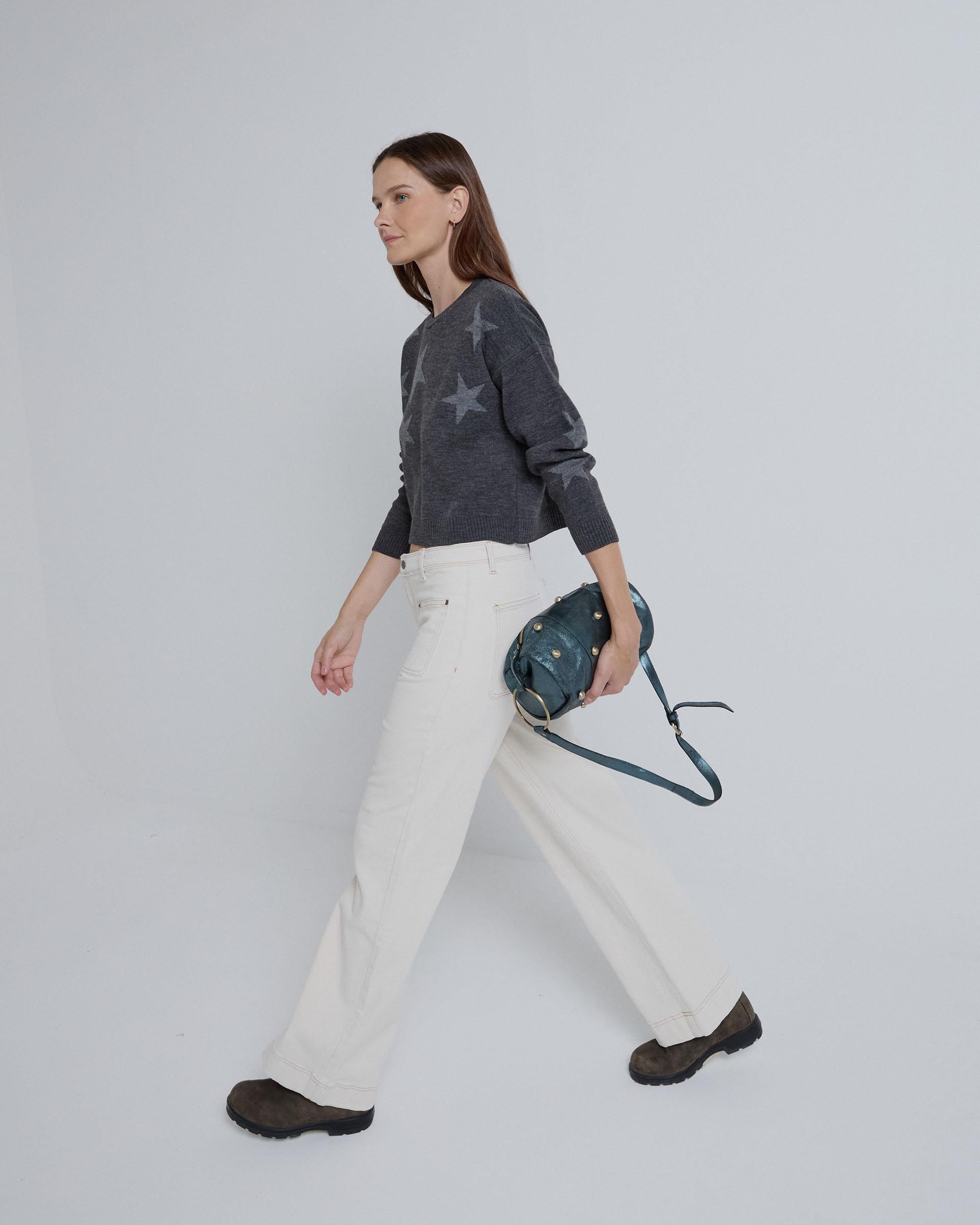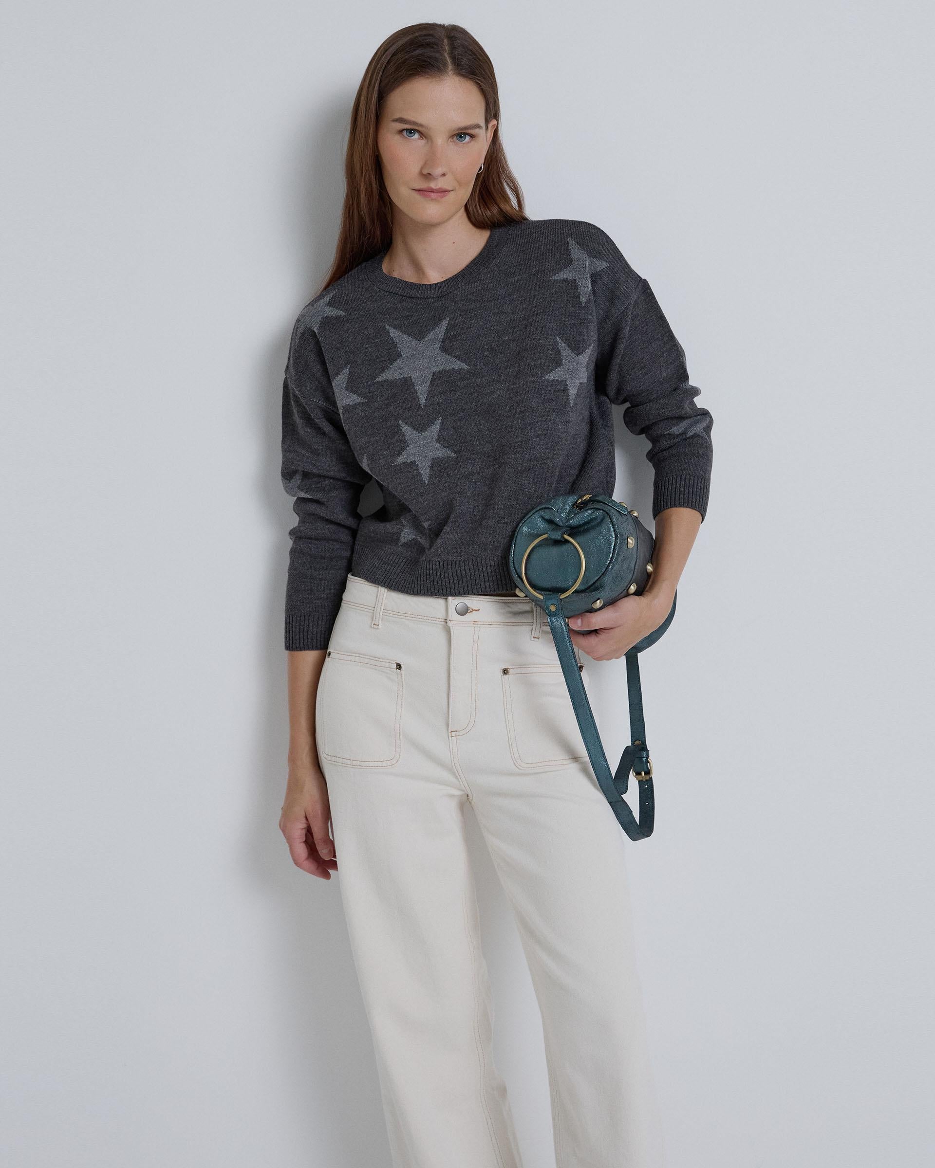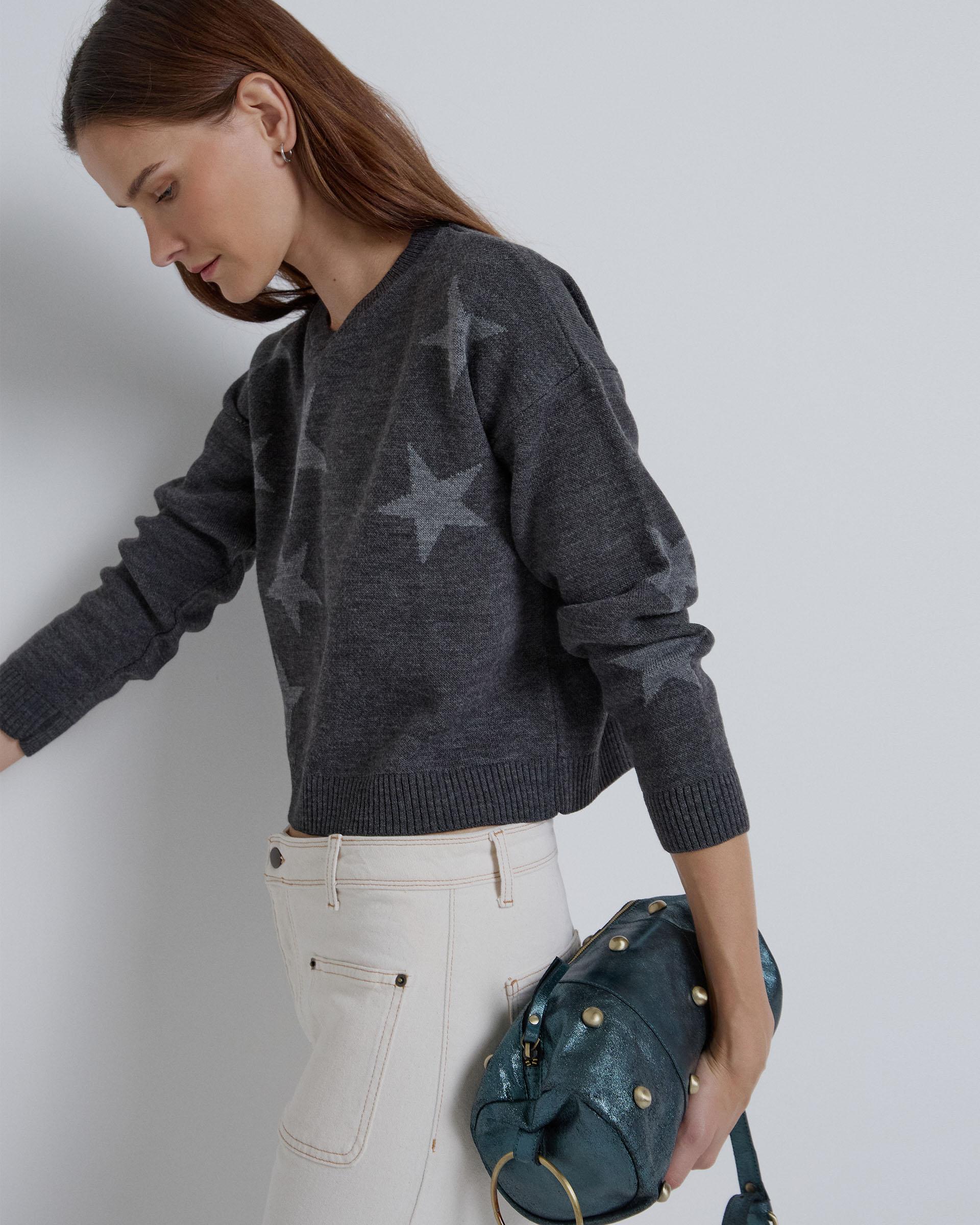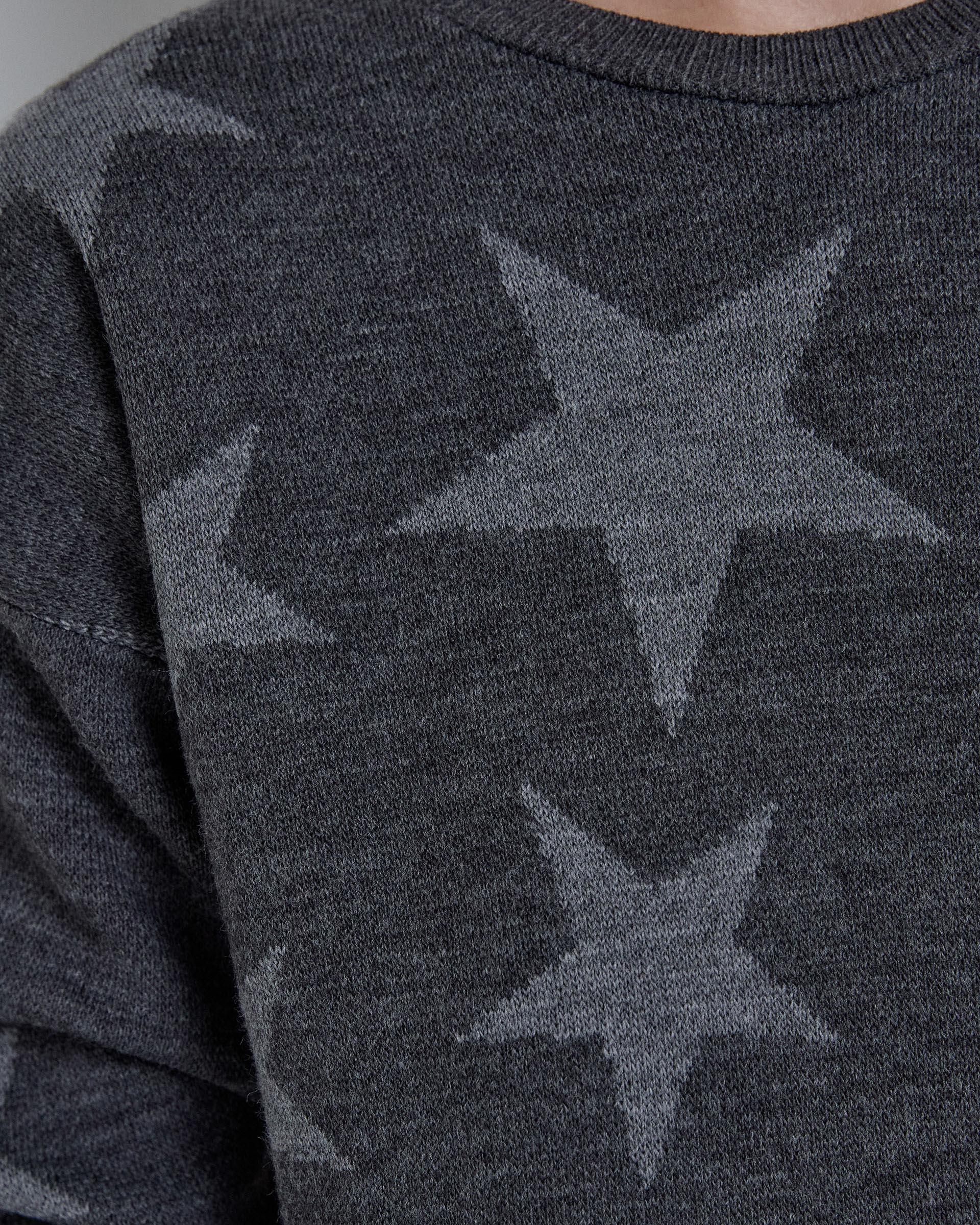 Camisola de malha cinza escuro com detalhe de estrela contrastante.